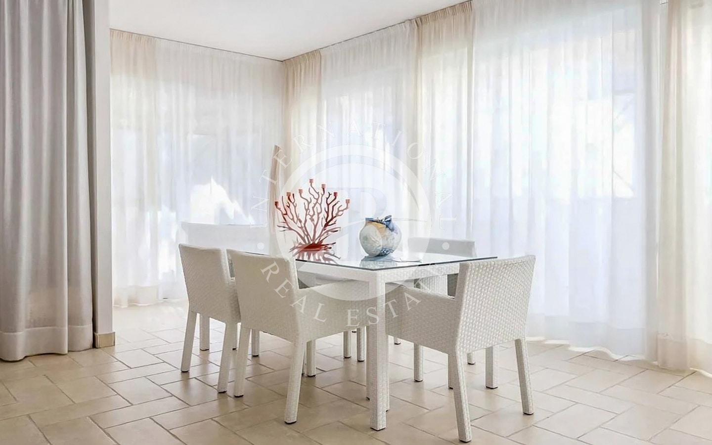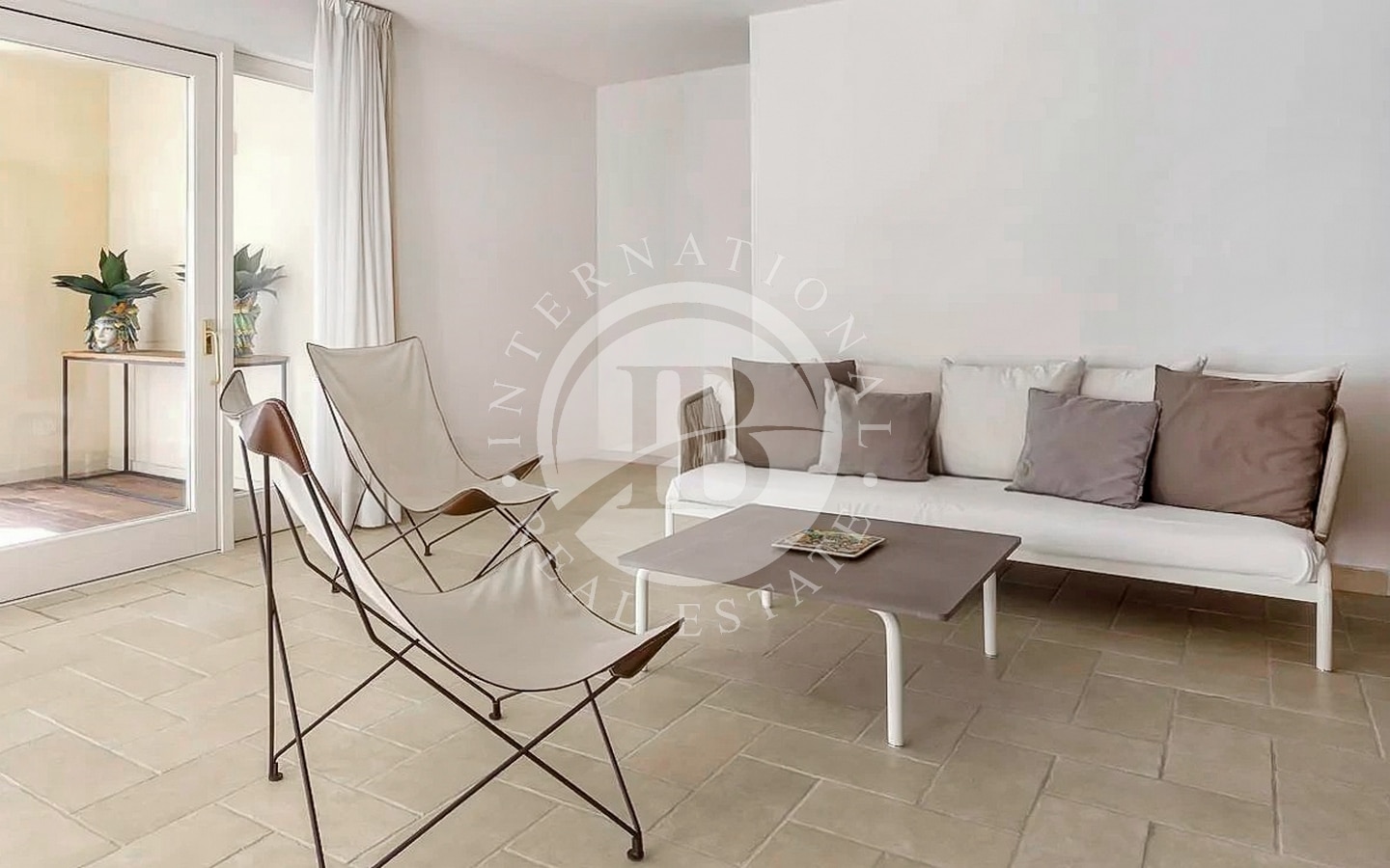 Den elegante entré fører til en stor, lys stue med direkte adgang til en terrasse med udsigt over den fælles pool og en græsplæne. Dette område suppleres af et moderne køkken og et badeværelse med dobbelte håndvaske.