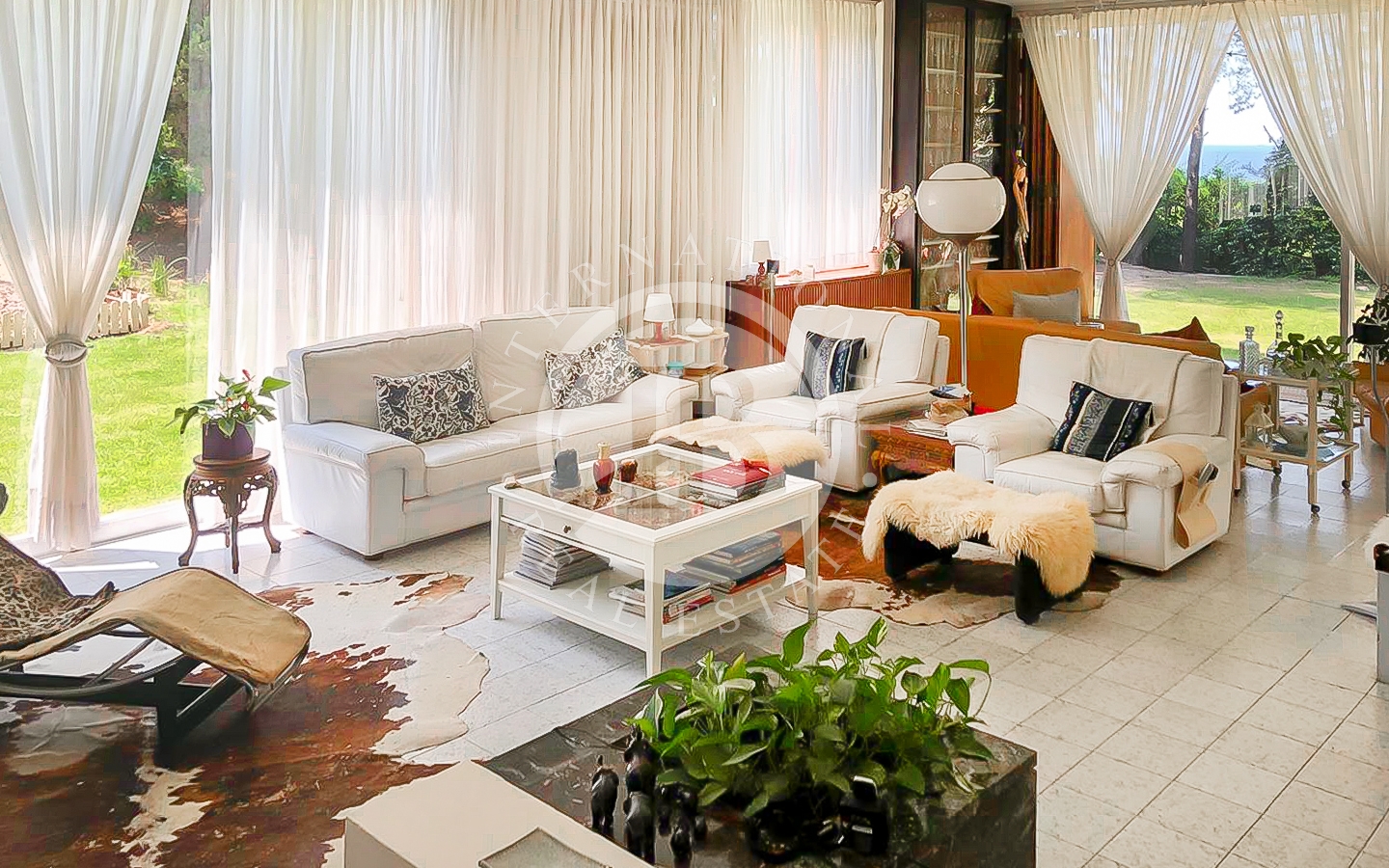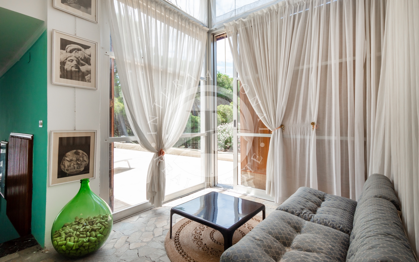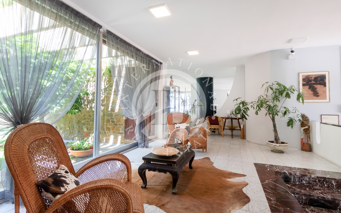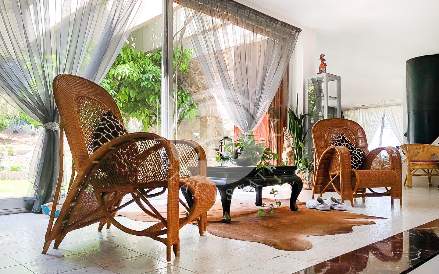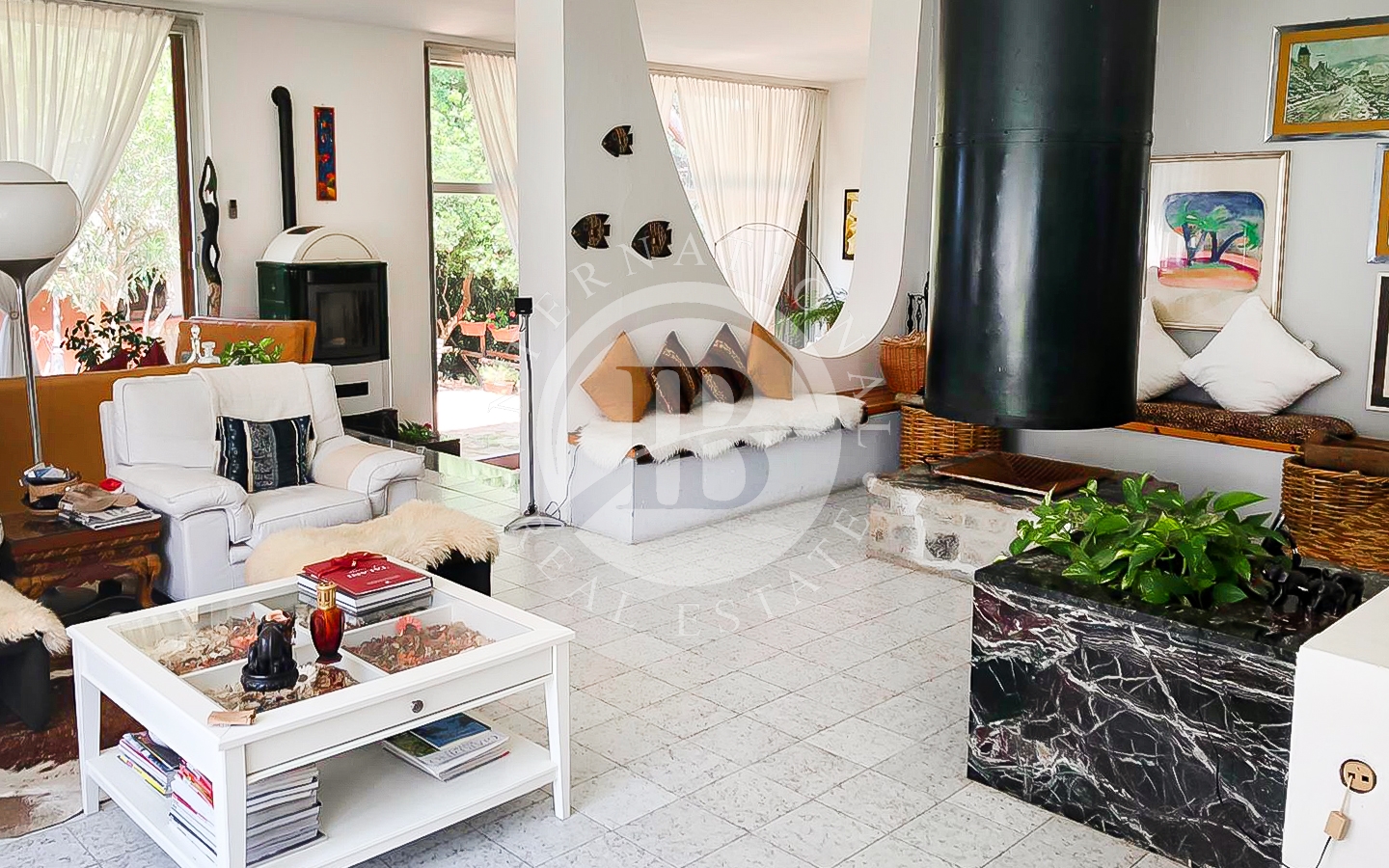 Indenfor byder villaen velkommen med en stor stue med gulv-til-loft-vinduer, der oversvømmer rummet med naturligt lys og giver en spektakulær udsigt over det omkringliggende landskab. Interiøret er kendetegnet ved sit karakteristiske design og sans for detaljer, med store, åbne, kommunikerende rum, der skaber en luftig og sofistikeret atmosfære. De fire smagfuldt indrettede værelser byder på komfort og ro.