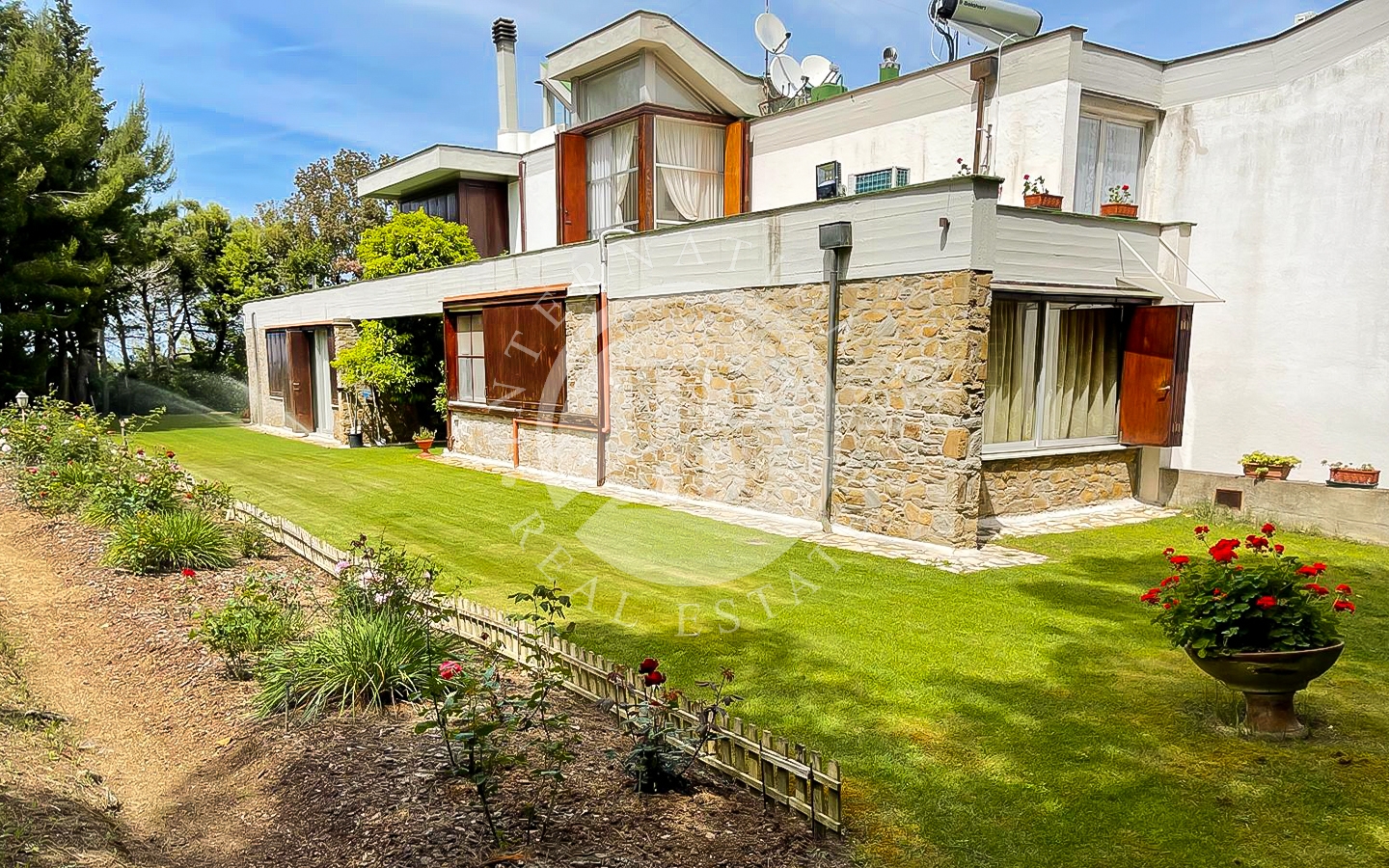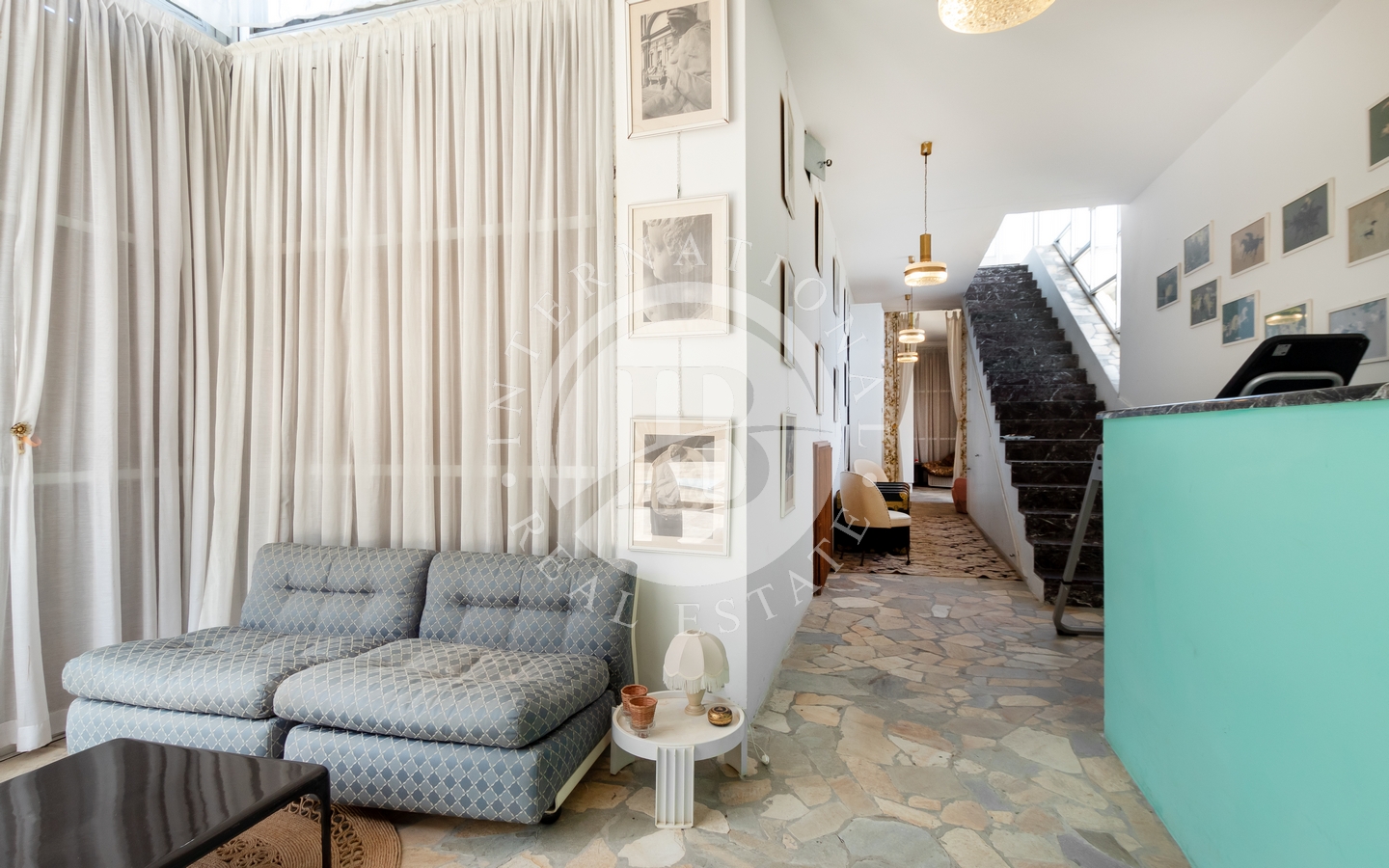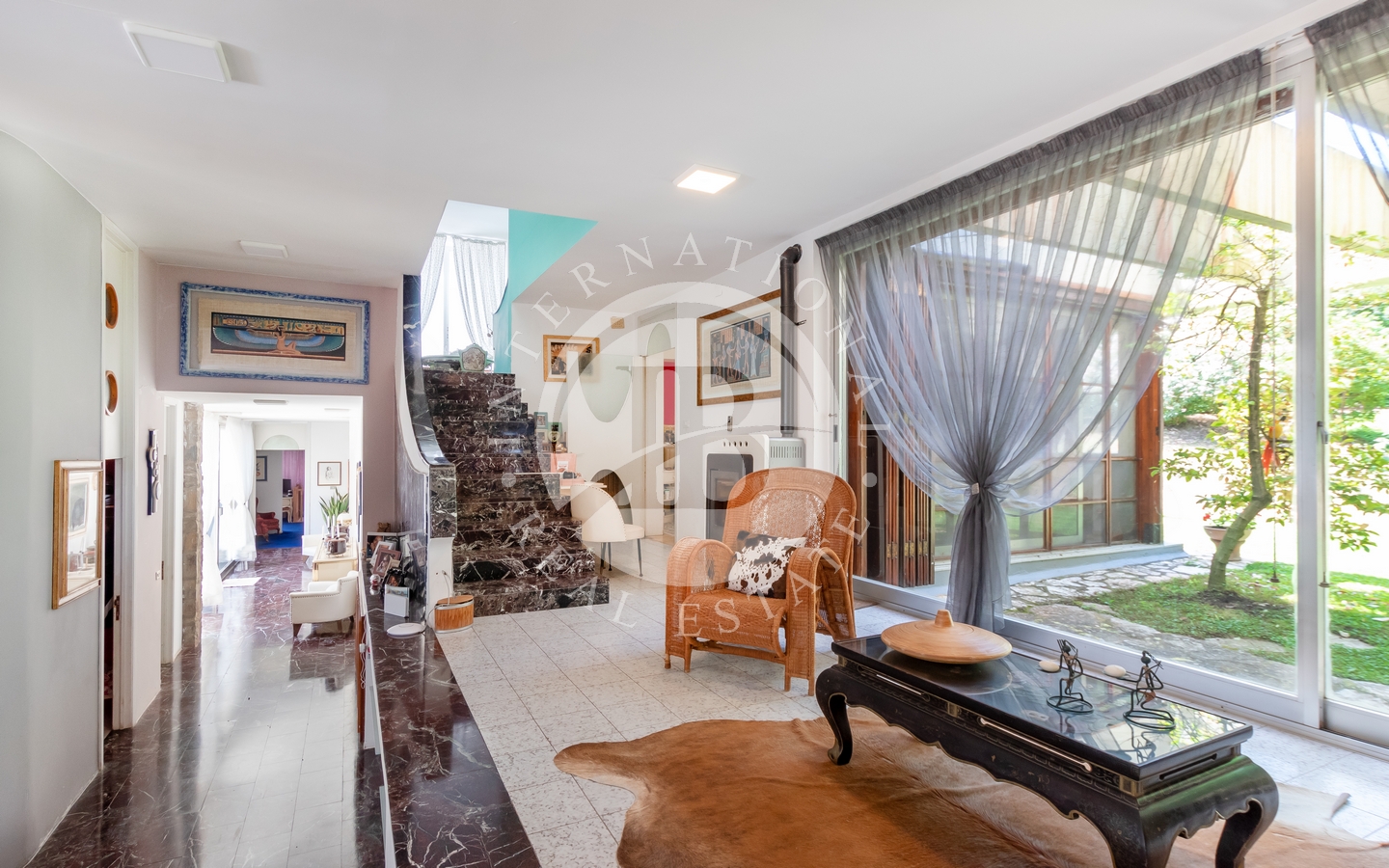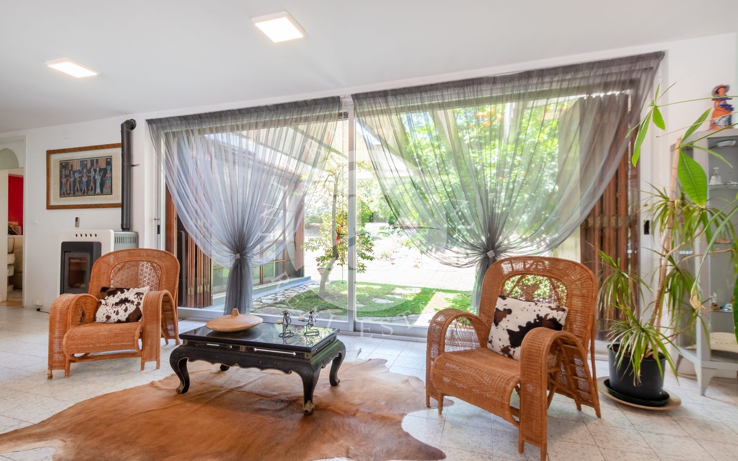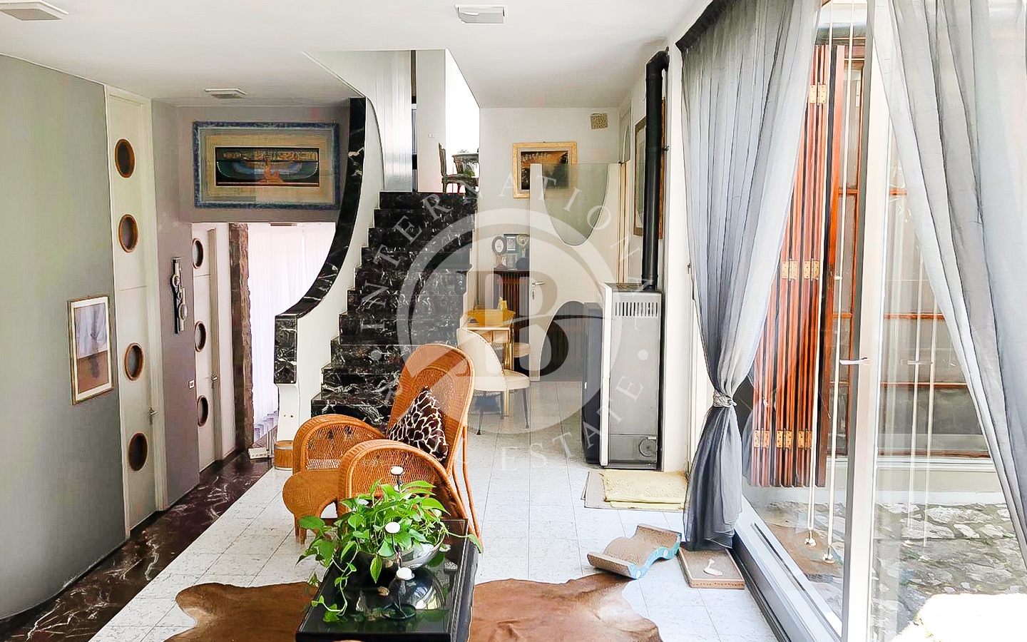 Indenfor byder villaen velkommen med en stor stue med gulv-til-loft-vinduer, der oversvømmer rummet med naturligt lys og giver en spektakulær udsigt over det omkringliggende landskab. Interiøret er kendetegnet ved sit karakteristiske design og sans for detaljer, med store, åbne, kommunikerende rum, der skaber en luftig og sofistikeret atmosfære. De fire smagfuldt indrettede værelser byder på komfort og ro.