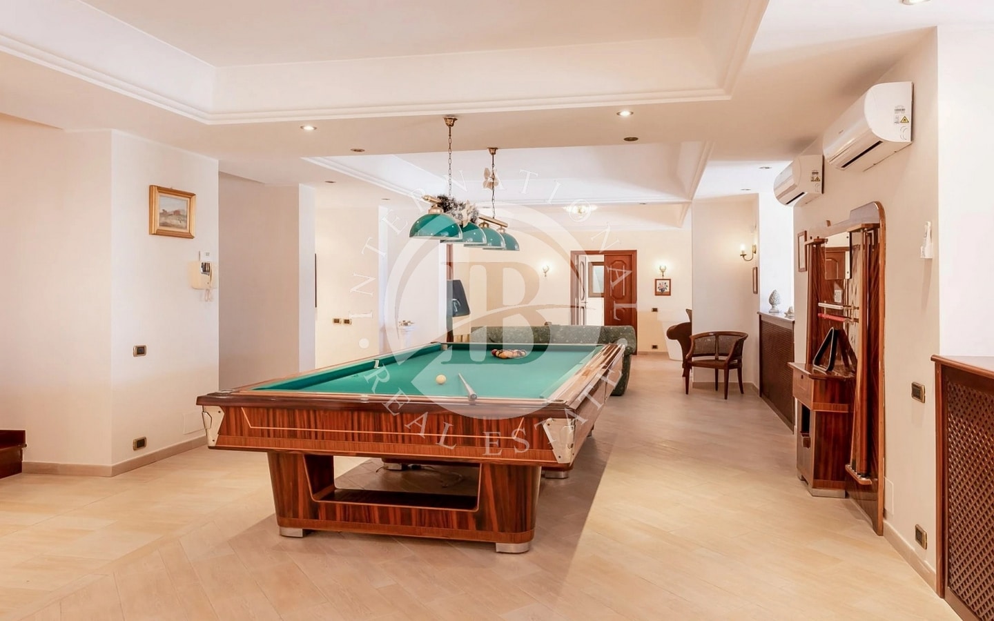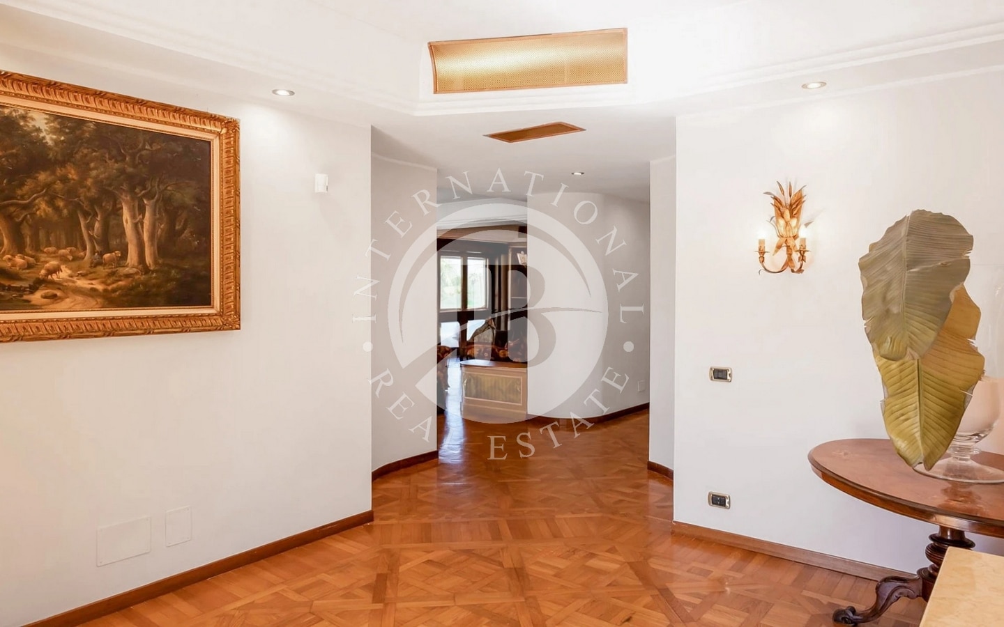 Villaen er på flere niveauer, som hver især er designet til at tilbyde alsidige og velfordelte rum. I kælderetagen er der indgang til en stor stue med pejs, et køkken, fire badeværelser og seks værelser, hvoraf to bruges som vaske- og strygerum. I stueetagen er der en stor entré, en gang, en dobbelt stue med en overdækket veranda, et arbejdsværelse med pejs, en spisestue, et muret køkken og et badeværelse. Udenfor er der et uafhængigt udhus, veludstyret og ideelt til gæster.