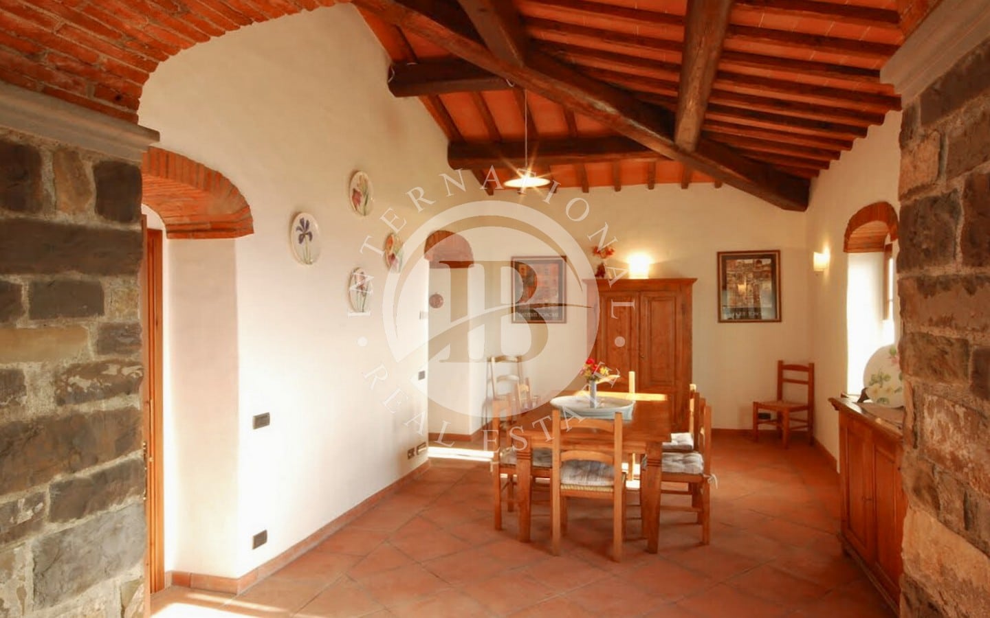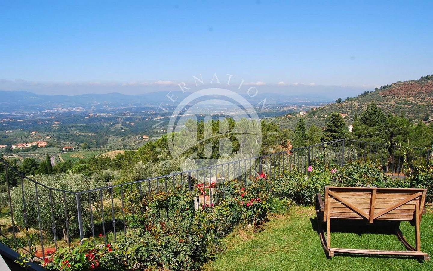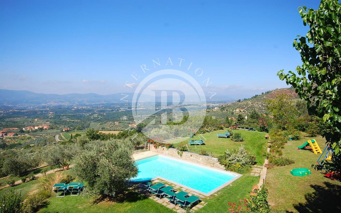 The 6 flats offer a total of 9 bedrooms and 8 bathrooms, each with a splendid panoramic view. Guests can enjoy a wonderful park with olive groves and vineyards, perfect for relaxing outdoors. The 12x6-metre swimming pool is fully equipped with sun loungers, parasols, armchairs and tables, and overlooks a large solarium of about 1000 square metres with a view of the magnificent Arno valley. The property also includes half a hectare of land with about 90 olive trees, fruit trees, woods and vineyards.