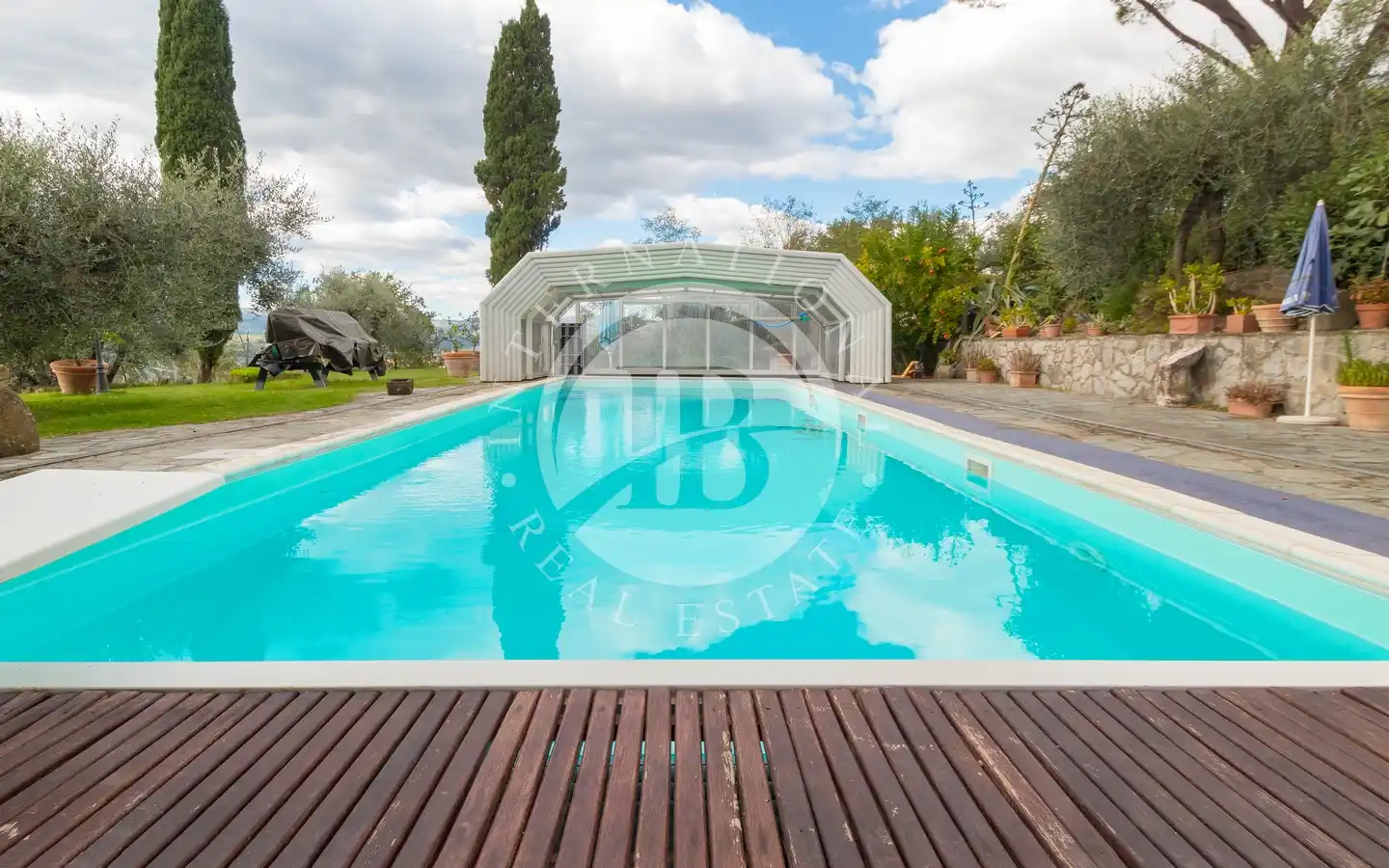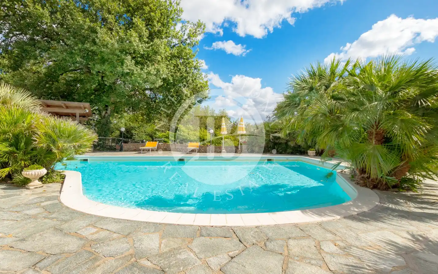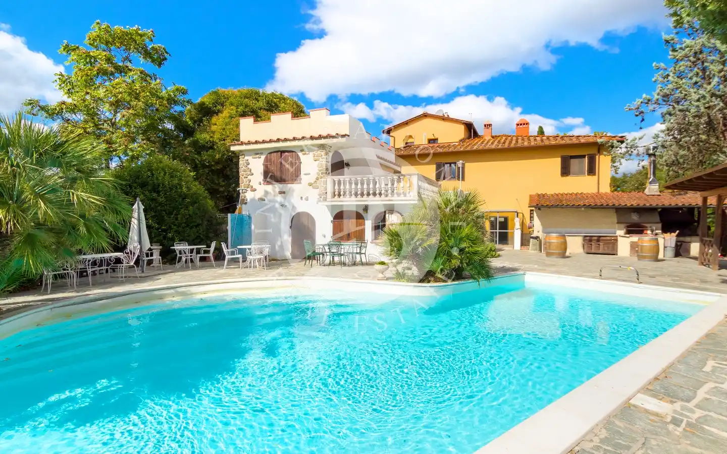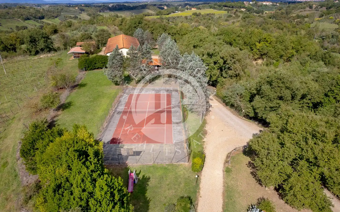 Ulkotiloissa on rentoutumiseen ja vapaa-aikaan tarkoitettuja alueita: puutarhoja ja puistoja, sisäuima-allas vesihieronnalla, ulkouima-allas, tenniskenttä, grilleillä ja puu-uunilla varustettuja alueita, varjoisia pergoloita ja nurkkia, joissa voi nauttia lounasta. Maa-alueilla on oliivitarhoja, viinitarhoja, metsää ja peltoa, mikä luo täydellisen tasapainon luonnon, tuottavuuden ja maiseman kauneuden välille. Viinikellari on valmiina paikan päällä tuotettujen viinien säilytykseen, ihanteellinen viinin ystäville.