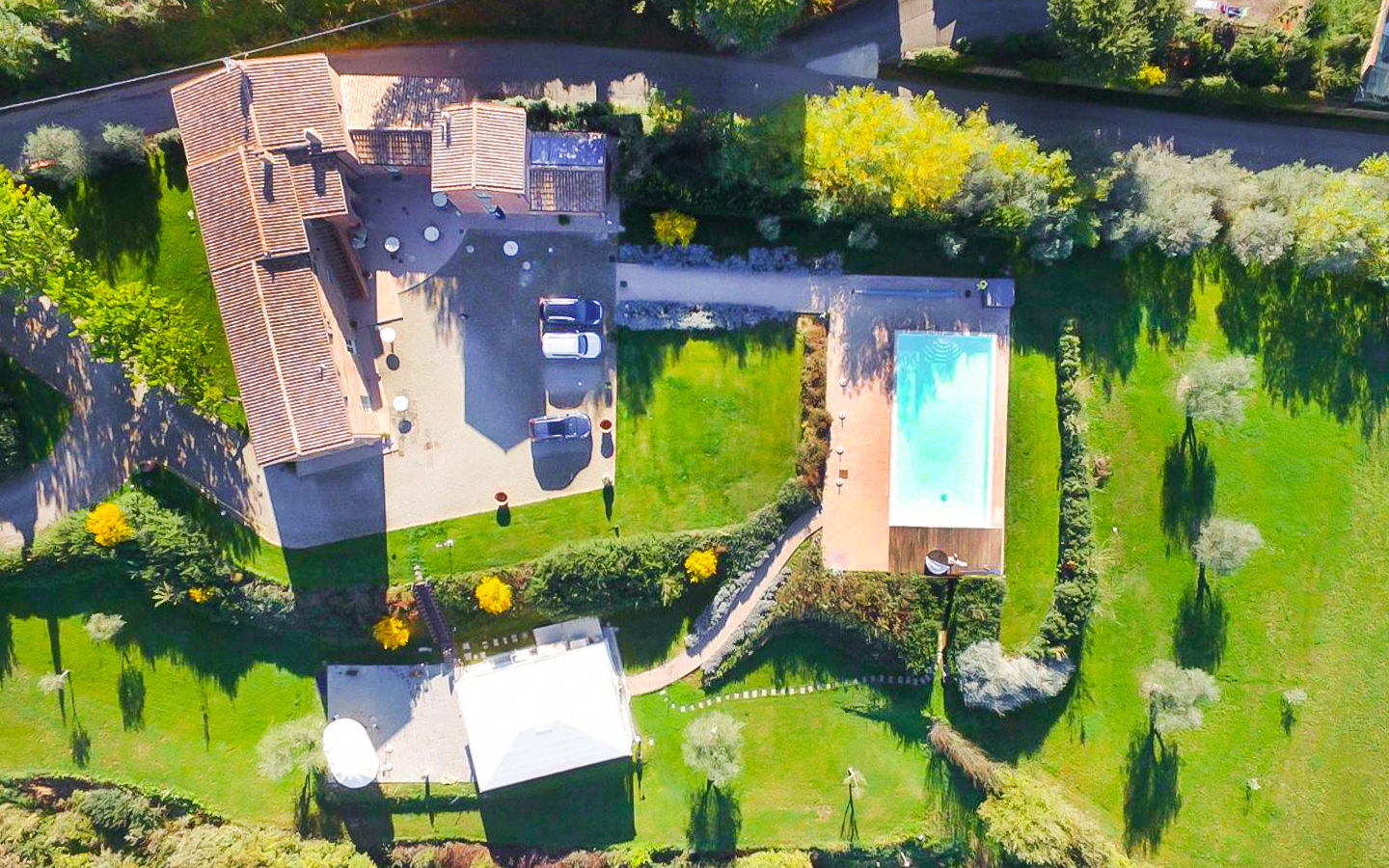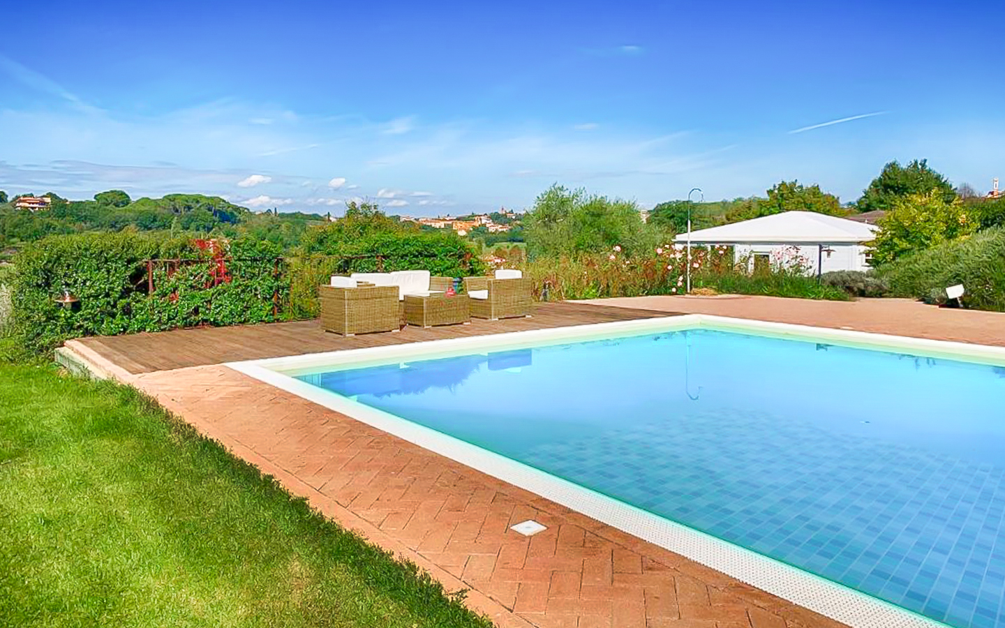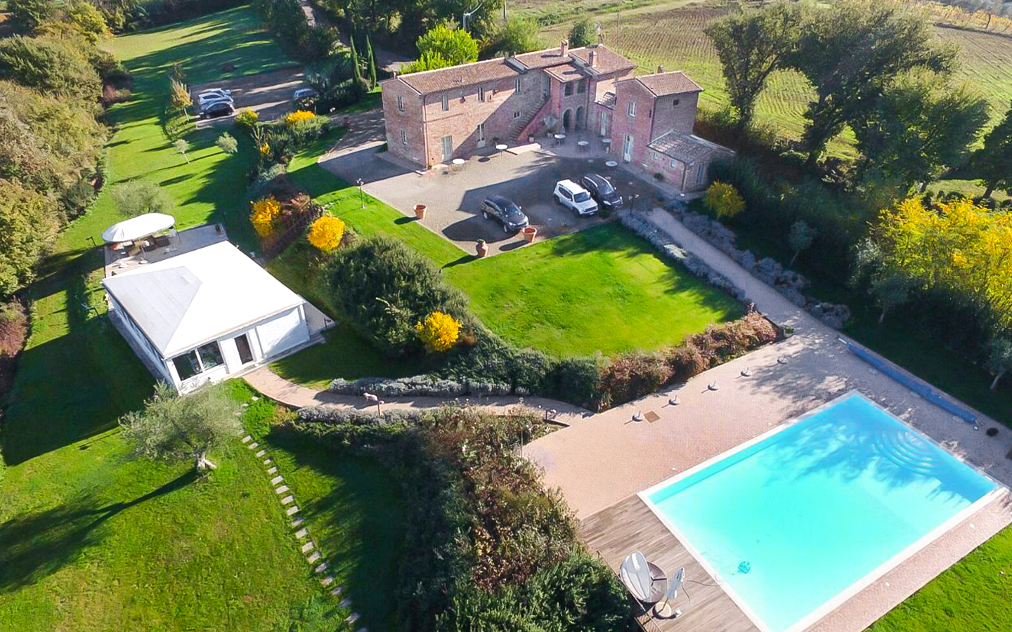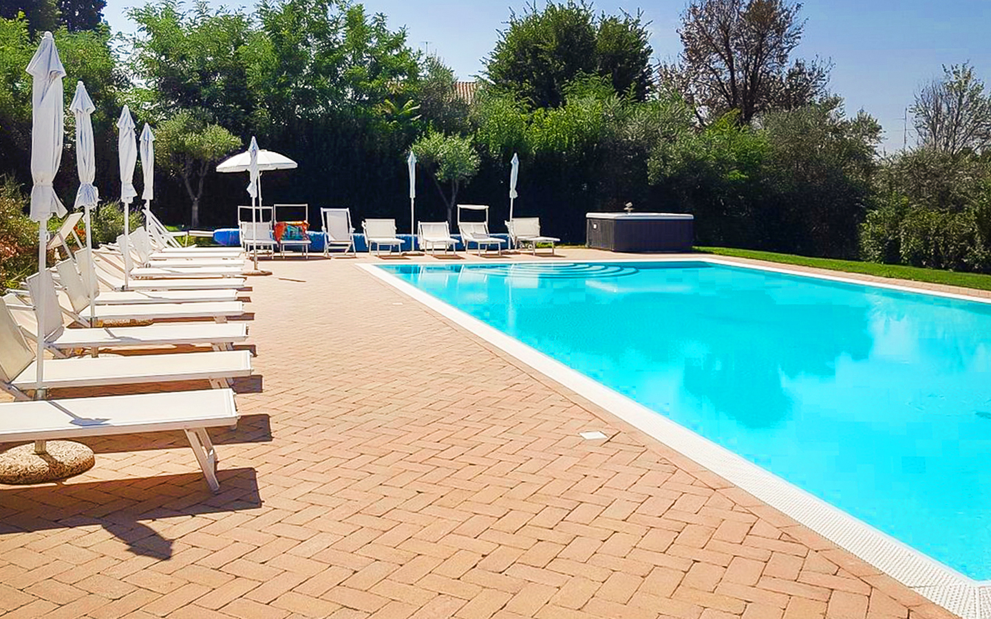 Il parco di 5000 mq e i 6 ettari di terreno che circondano la villa offrono ampi spazi per attività all'aperto e momenti di relax. La piscina a sfioro riscaldata, di dimensioni 14x7 metri, rappresenta il cuore dell'area esterna, perfetta per rinfrescarsi durante le calde giornate estive. L'ampio parcheggio aperto garantisce comodità e sicurezza per gli ospiti. La posizione della villa, immersa nel verde ma vicinissima al centro abitato, permette di godere della massima privacy senza rinunciare alle comodità della vita cittadina.