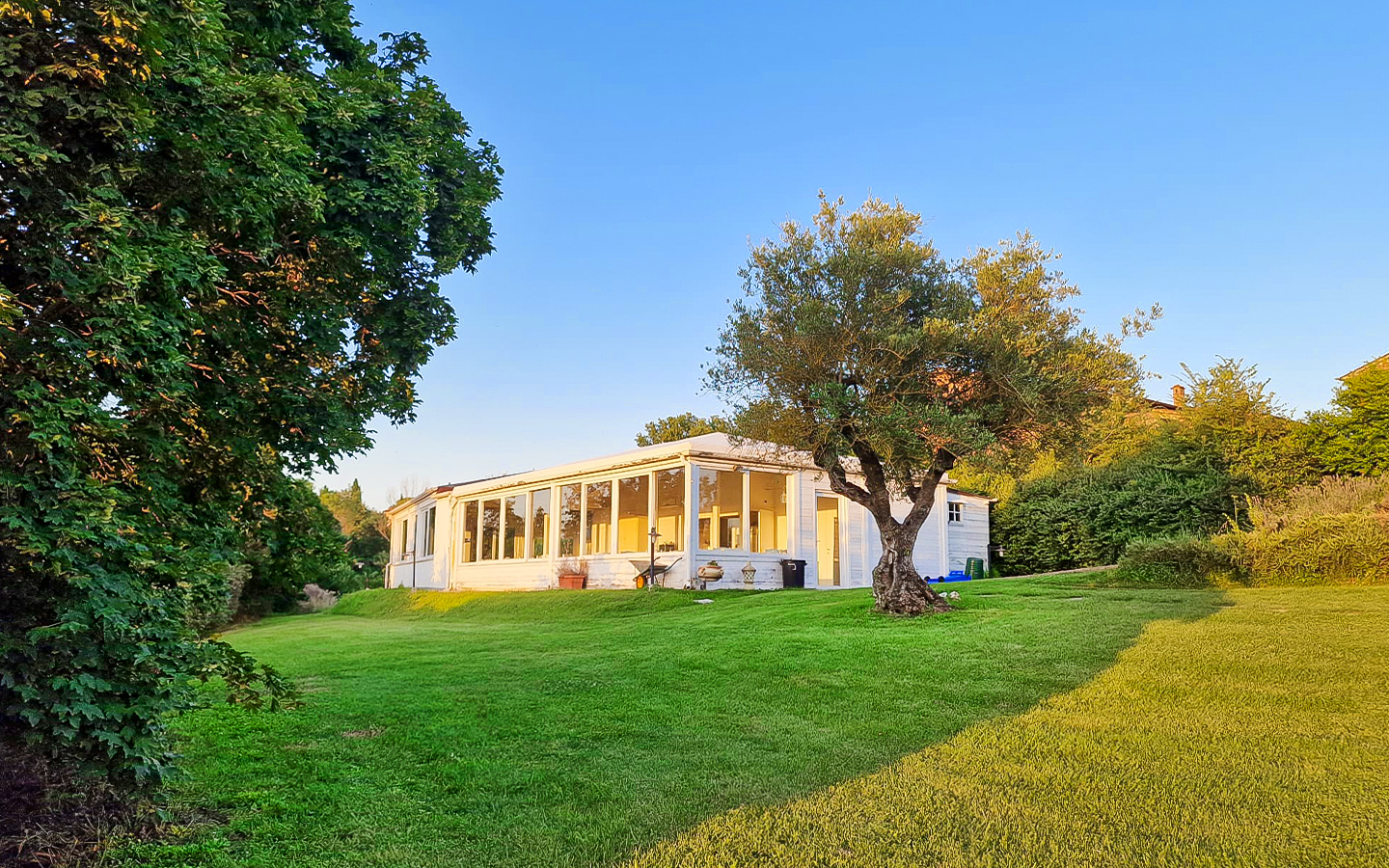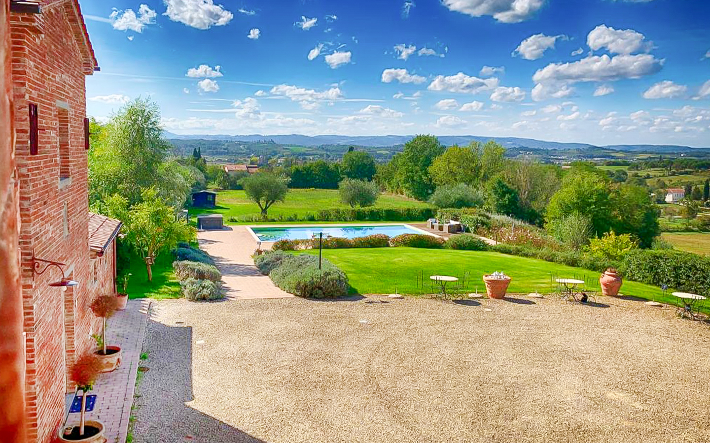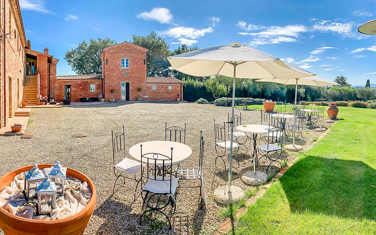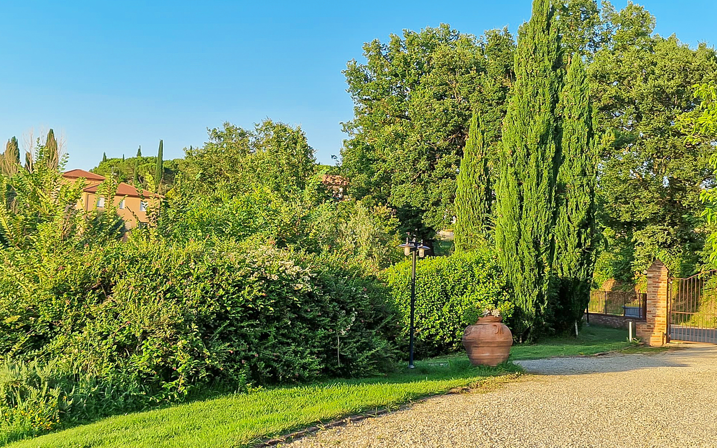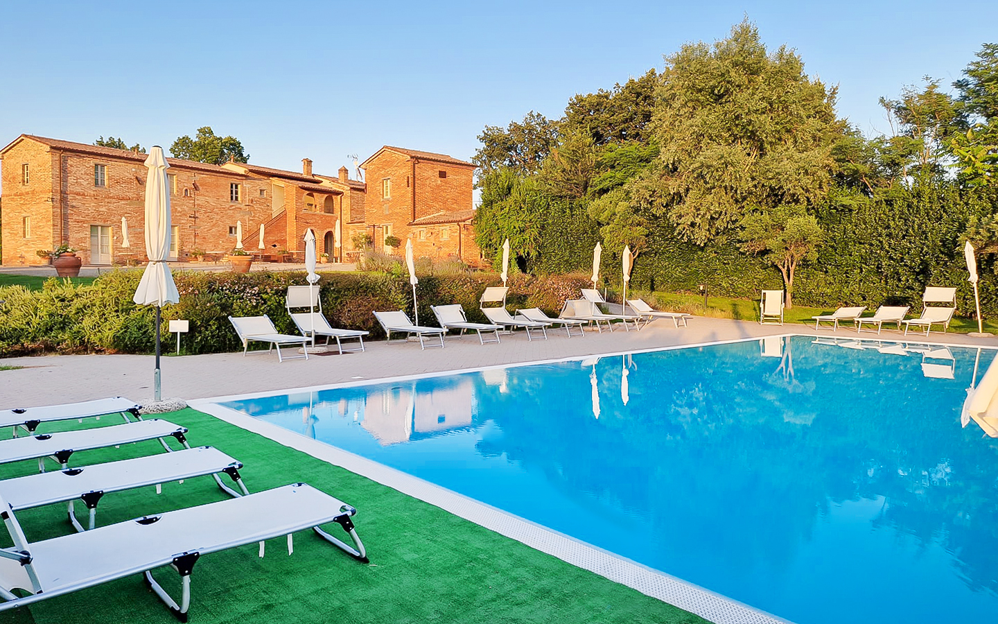 Il parco di 5000 mq e i 6 ettari di terreno che circondano la villa offrono ampi spazi per attività all'aperto e momenti di relax. La piscina a sfioro riscaldata, di dimensioni 14x7 metri, rappresenta il cuore dell'area esterna, perfetta per rinfrescarsi durante le calde giornate estive. L'ampio parcheggio aperto garantisce comodità e sicurezza per gli ospiti. La posizione della villa, immersa nel verde ma vicinissima al centro abitato, permette di godere della massima privacy senza rinunciare alle comodità della vita cittadina.