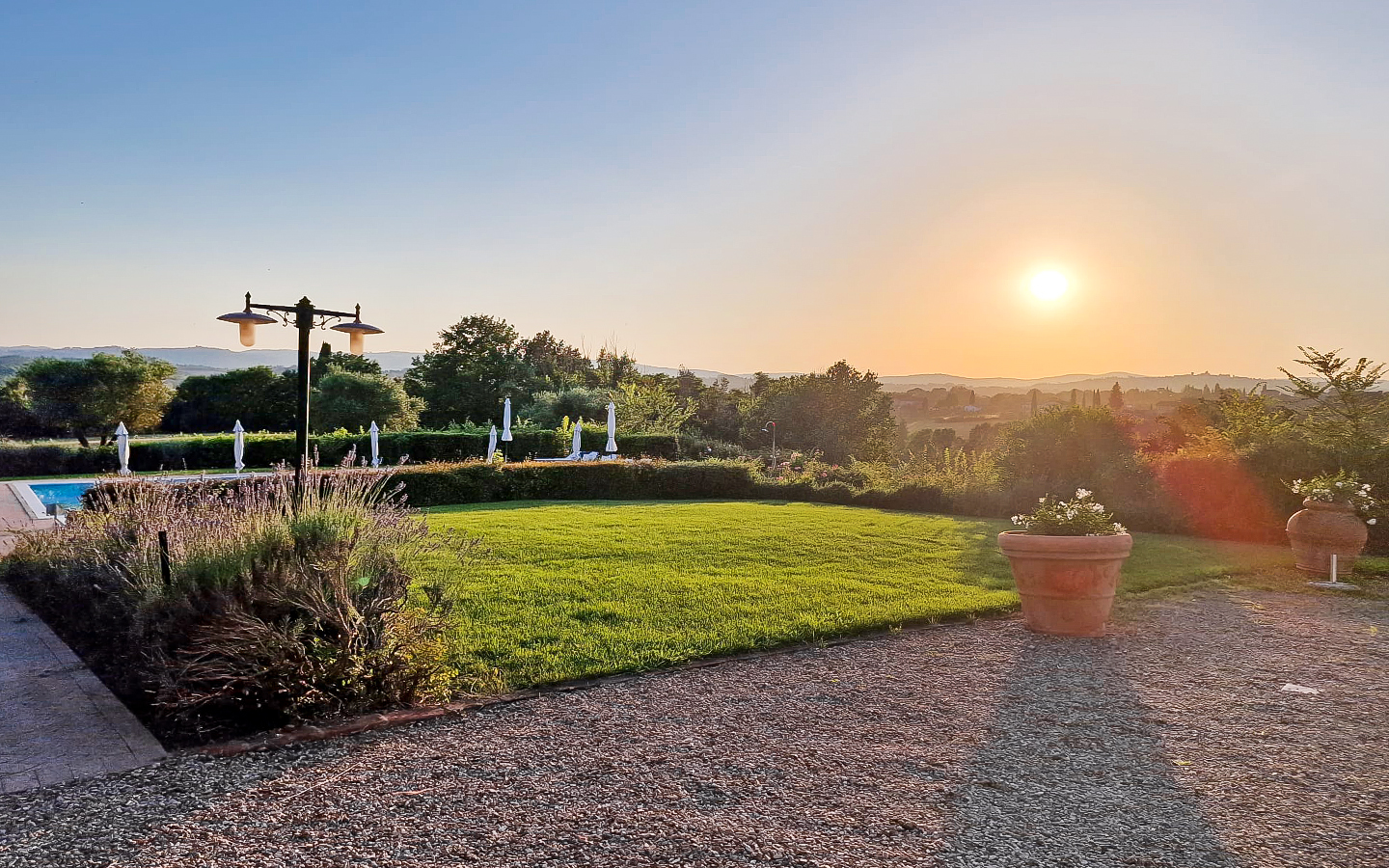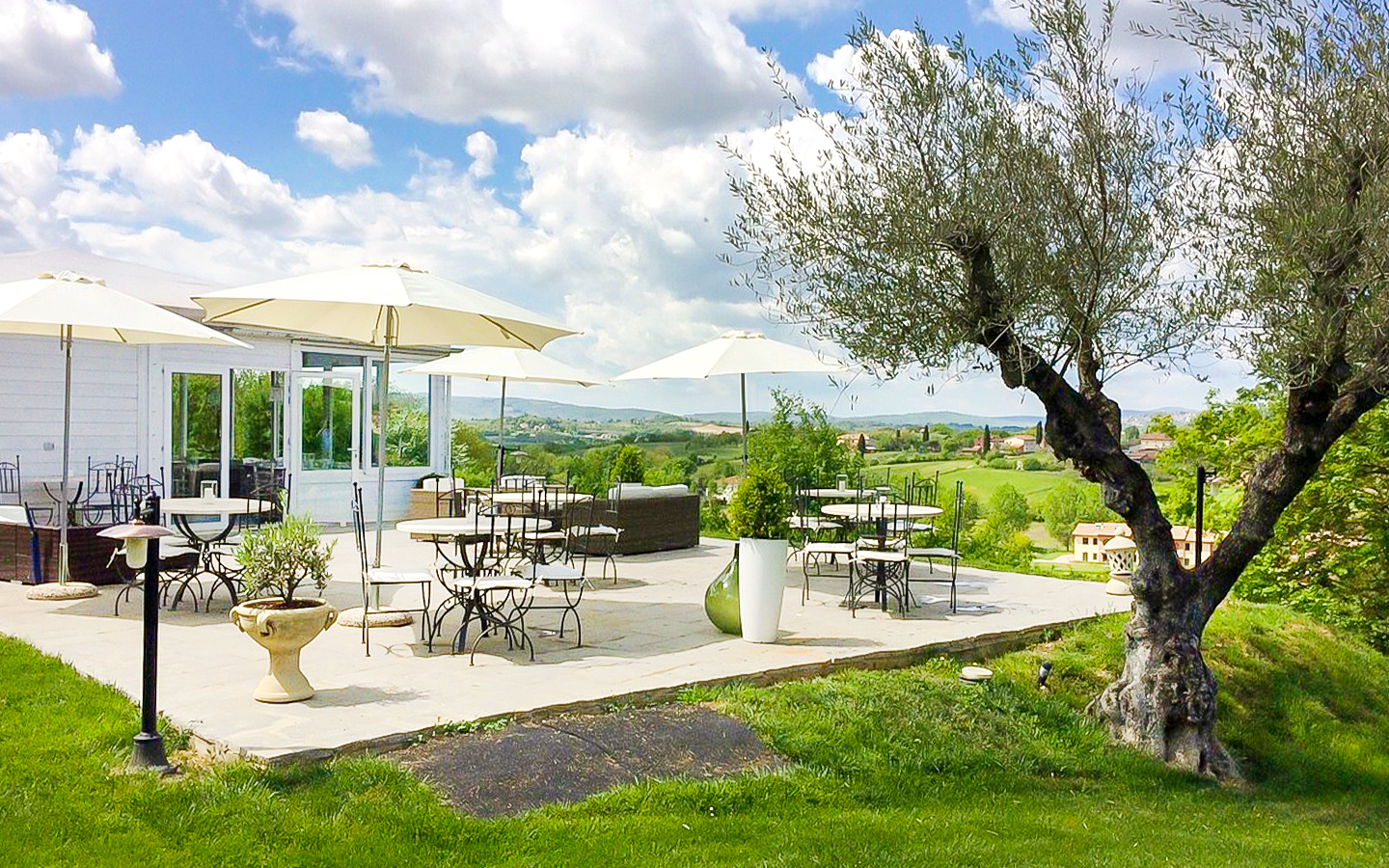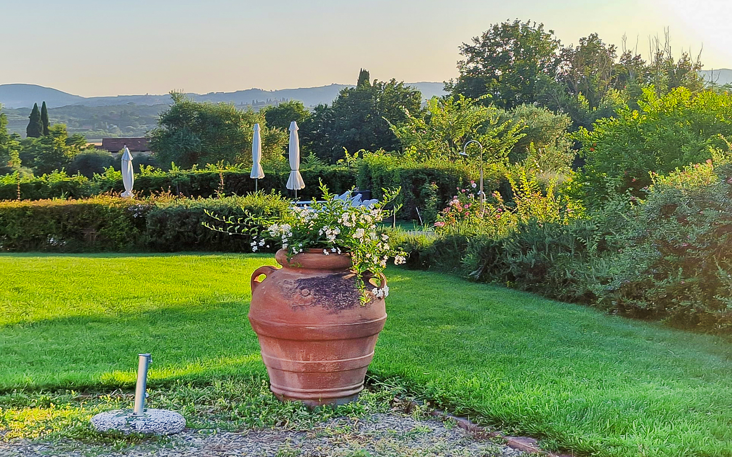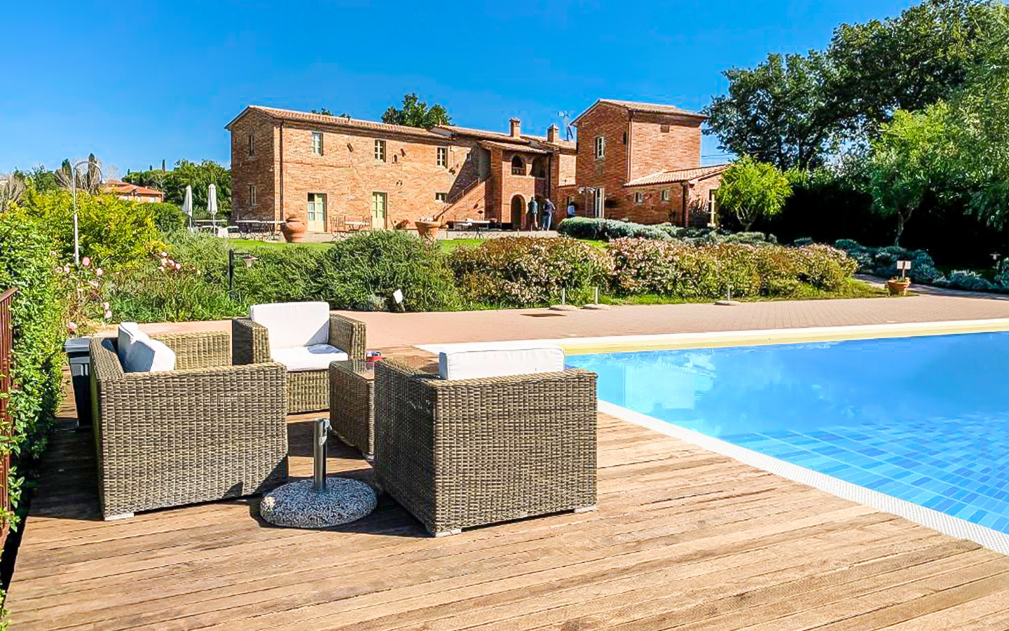 Il parco di 5000 mq e i 6 ettari di terreno che circondano la villa offrono ampi spazi per attività all'aperto e momenti di relax. La piscina a sfioro riscaldata, di dimensioni 14x7 metri, rappresenta il cuore dell'area esterna, perfetta per rinfrescarsi durante le calde giornate estive. L'ampio parcheggio aperto garantisce comodità e sicurezza per gli ospiti. La posizione della villa, immersa nel verde ma vicinissima al centro abitato, permette di godere della massima privacy senza rinunciare alle comodità della vita cittadina.
