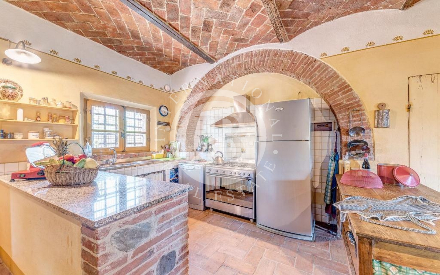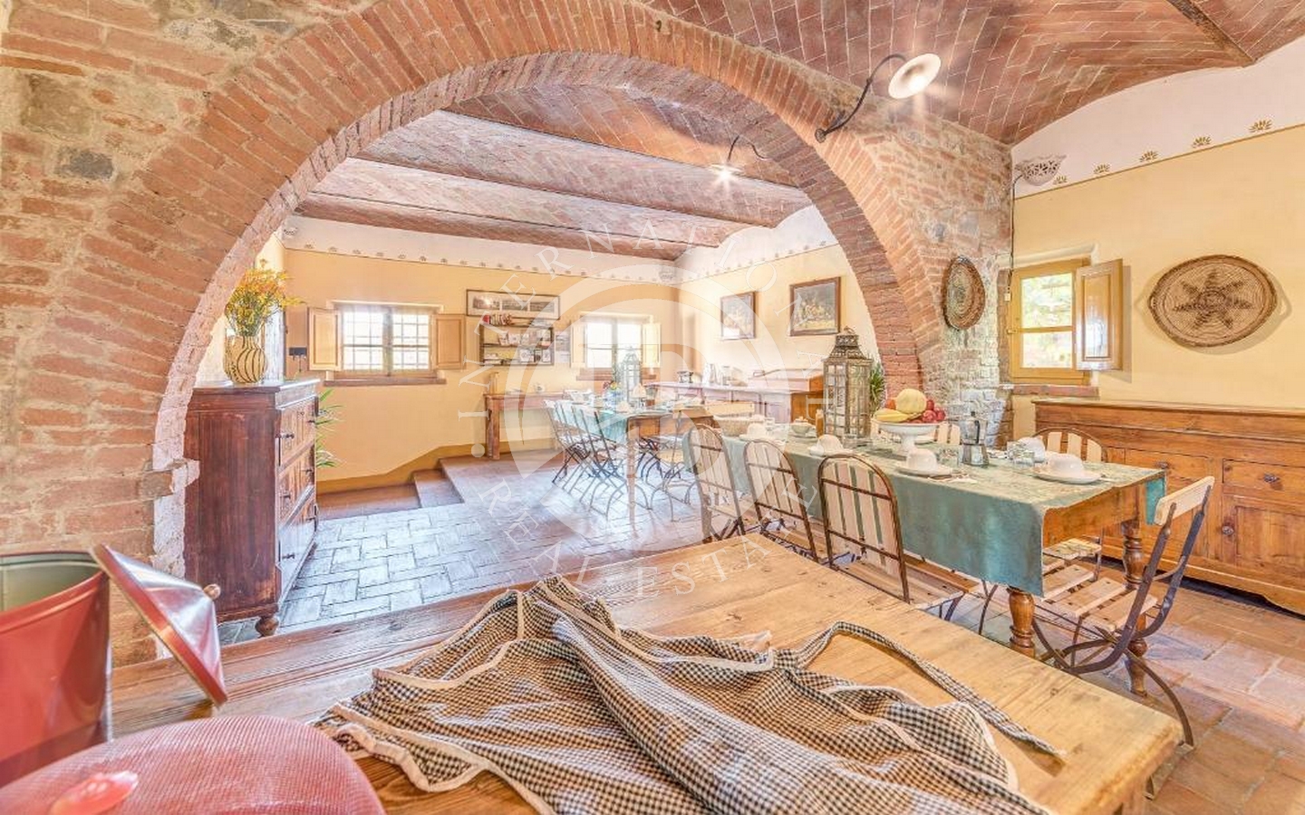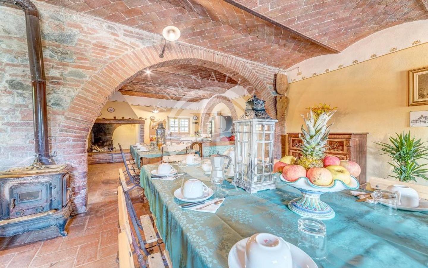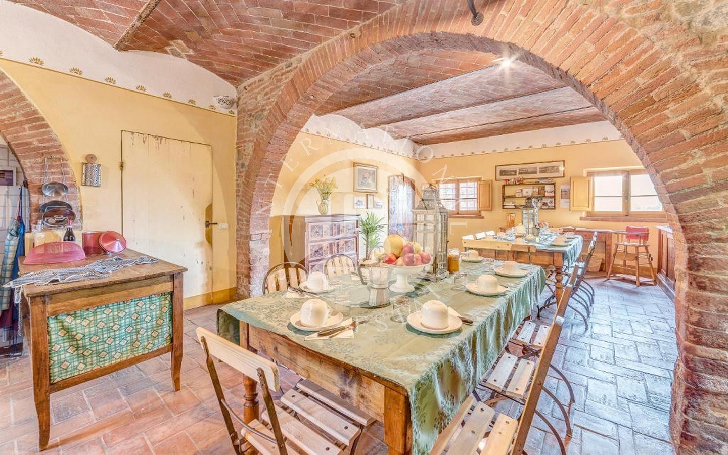 Il casale principale, di circa 350 mq, si sviluppa su due livelli. Al piano terra si trova un appartamento indipendente, perfetto per accogliere ospiti o come casa vacanze, dotato di soggiorno con angolo cottura, camera matrimoniale e bagno. Nella parte restante del piano terra si trovano un ampio salone con cucina, lavanderia e locale tecnico. Il piano superiore ospita l’abitazione padronale, caratterizzata da un grande soggiorno con camino d’epoca, una cucina abitabile, tre camere da letto e due bagni. Il restauro, effettuato con materiali di alta qualità, ha mantenuto la bellezza rustica della tradizione toscana, con travi in legno a vista, pavimenti in cotto e dettagli originali dell’Ottocento, creando un’atmosfera di calore e raffinatezza.