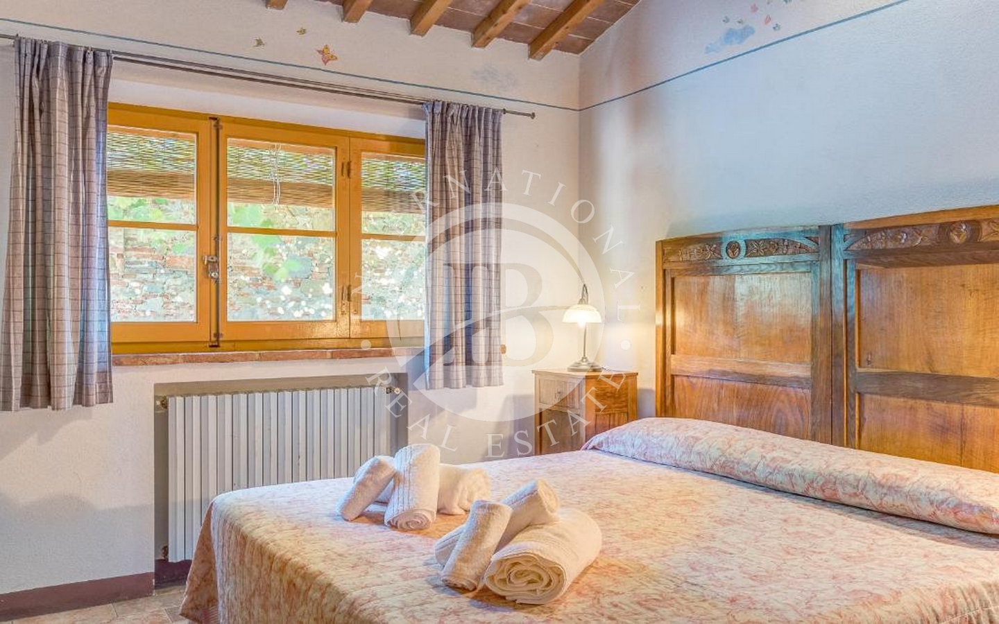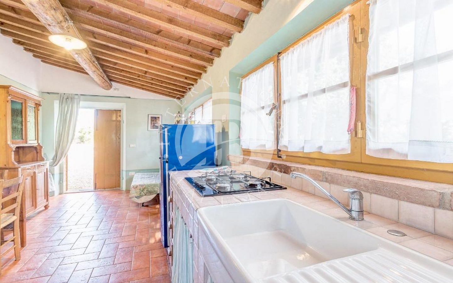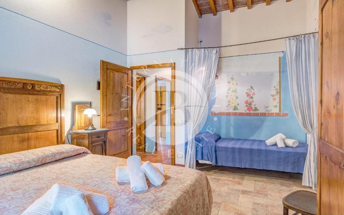 Il casale principale, di circa 350 mq, si sviluppa su due livelli. Al piano terra si trova un appartamento indipendente, perfetto per accogliere ospiti o come casa vacanze, dotato di soggiorno con angolo cottura, camera matrimoniale e bagno. Nella parte restante del piano terra si trovano un ampio salone con cucina, lavanderia e locale tecnico. Il piano superiore ospita l’abitazione padronale, caratterizzata da un grande soggiorno con camino d’epoca, una cucina abitabile, tre camere da letto e due bagni. Il restauro, effettuato con materiali di alta qualità, ha mantenuto la bellezza rustica della tradizione toscana, con travi in legno a vista, pavimenti in cotto e dettagli originali dell’Ottocento, creando un’atmosfera di calore e raffinatezza.