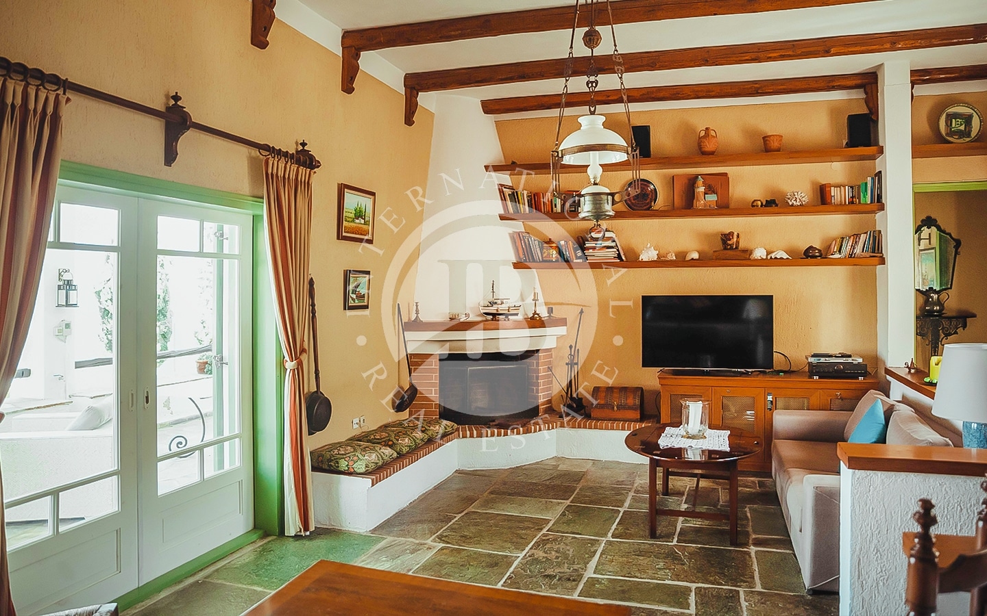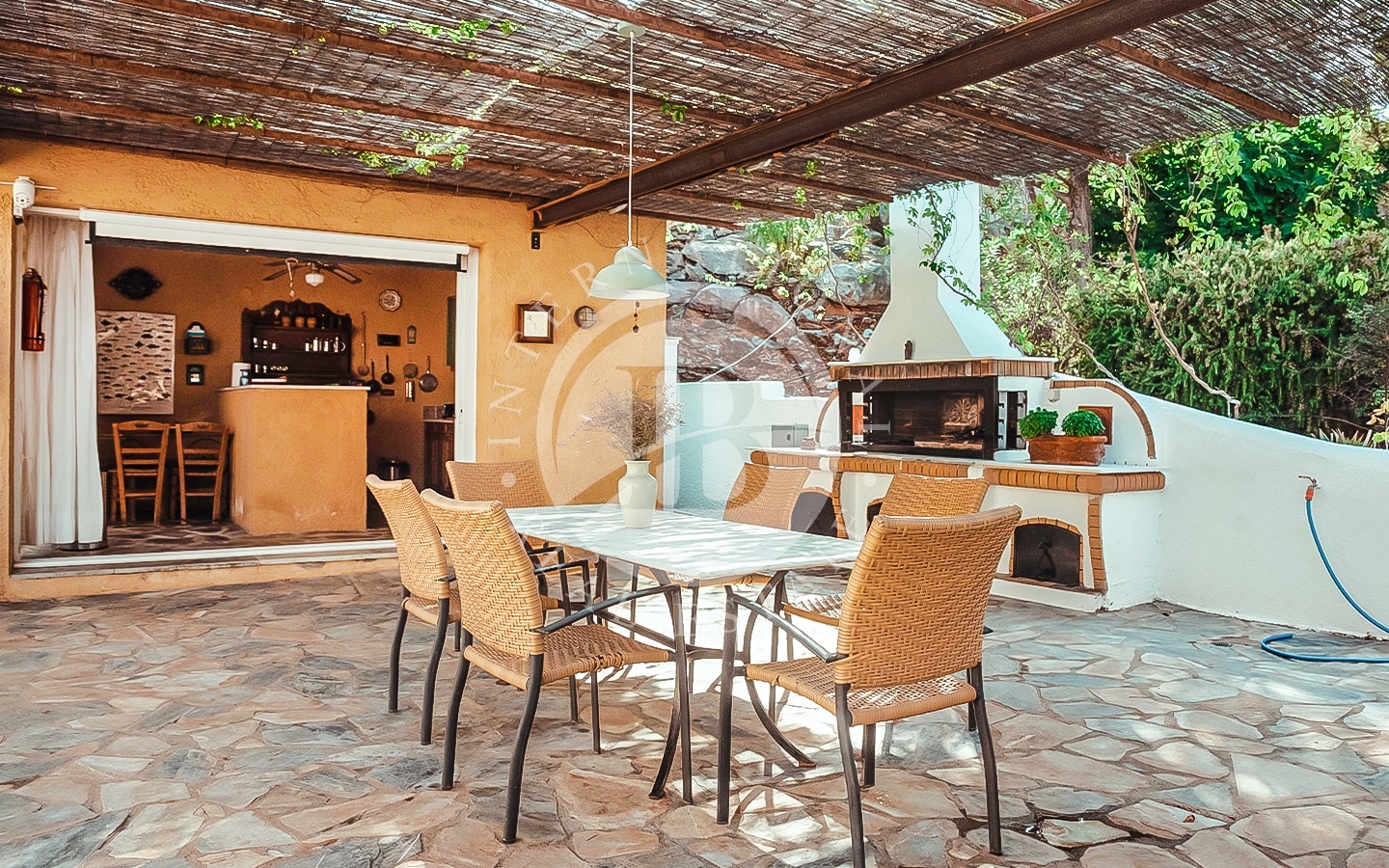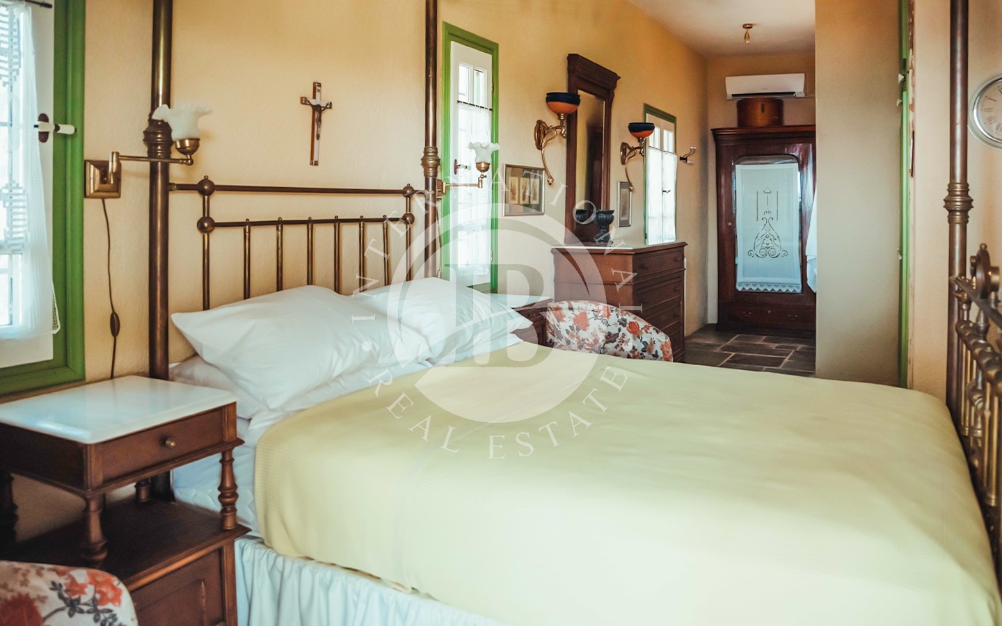 La villa principale est répartie sur deux étages. À l'étage supérieur, on trouve un grand salon avec cheminée et salle à manger, une cuisine, une buanderie (garde-manger pour la cuisine), une salle de bains pour les invités et une chambre principale avec salle de bains privée et vue sur la mer.
