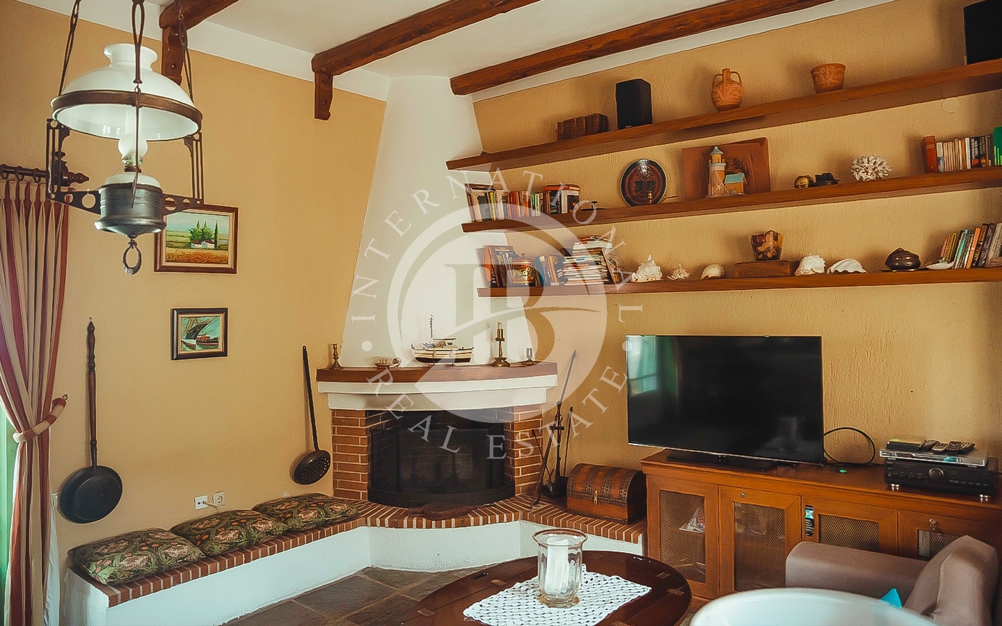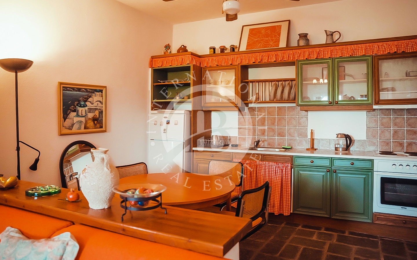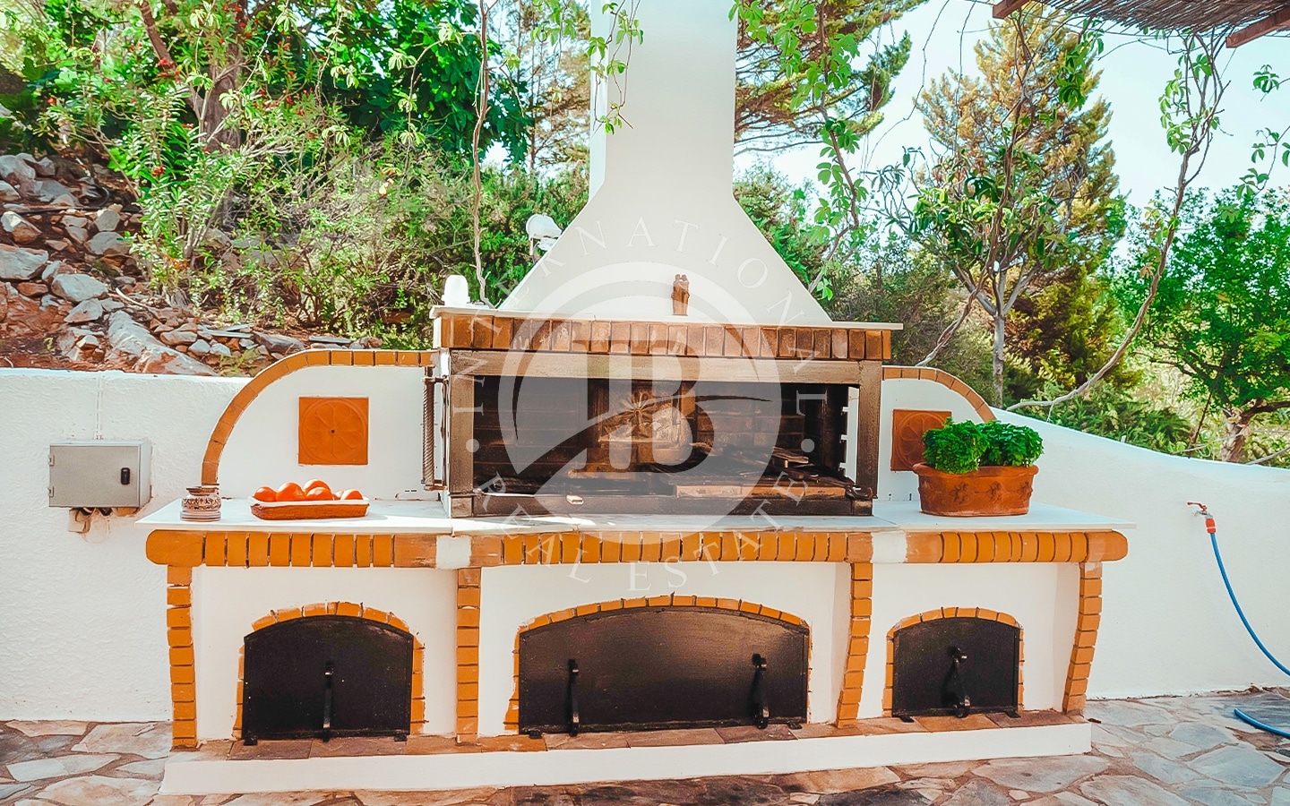 La villa principale est répartie sur deux étages. À l'étage supérieur, on trouve un grand salon avec cheminée et salle à manger, une cuisine, une buanderie (garde-manger pour la cuisine), une salle de bains pour les invités et une chambre principale avec salle de bains privée et vue sur la mer.