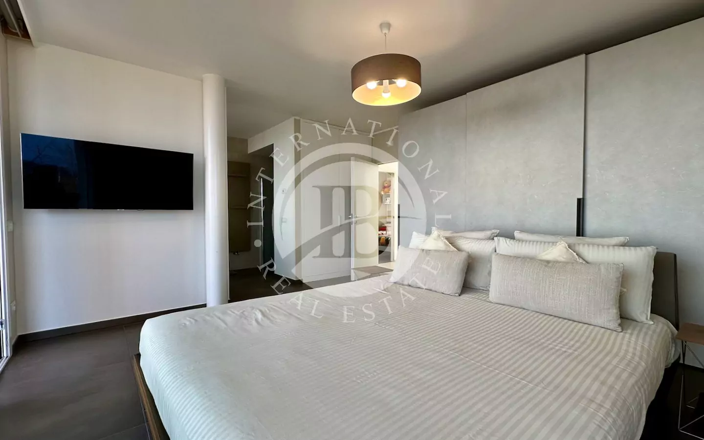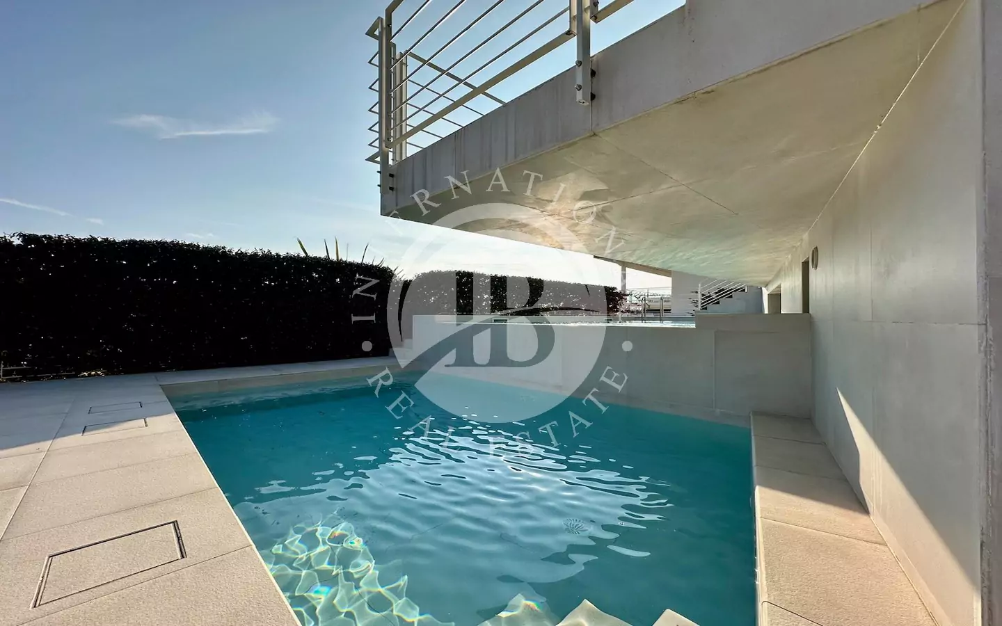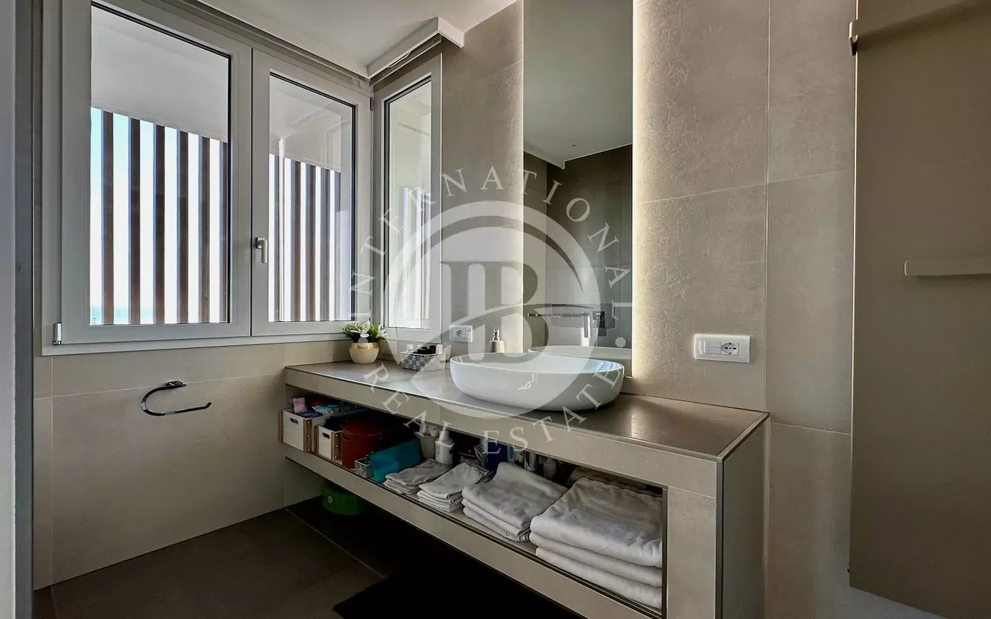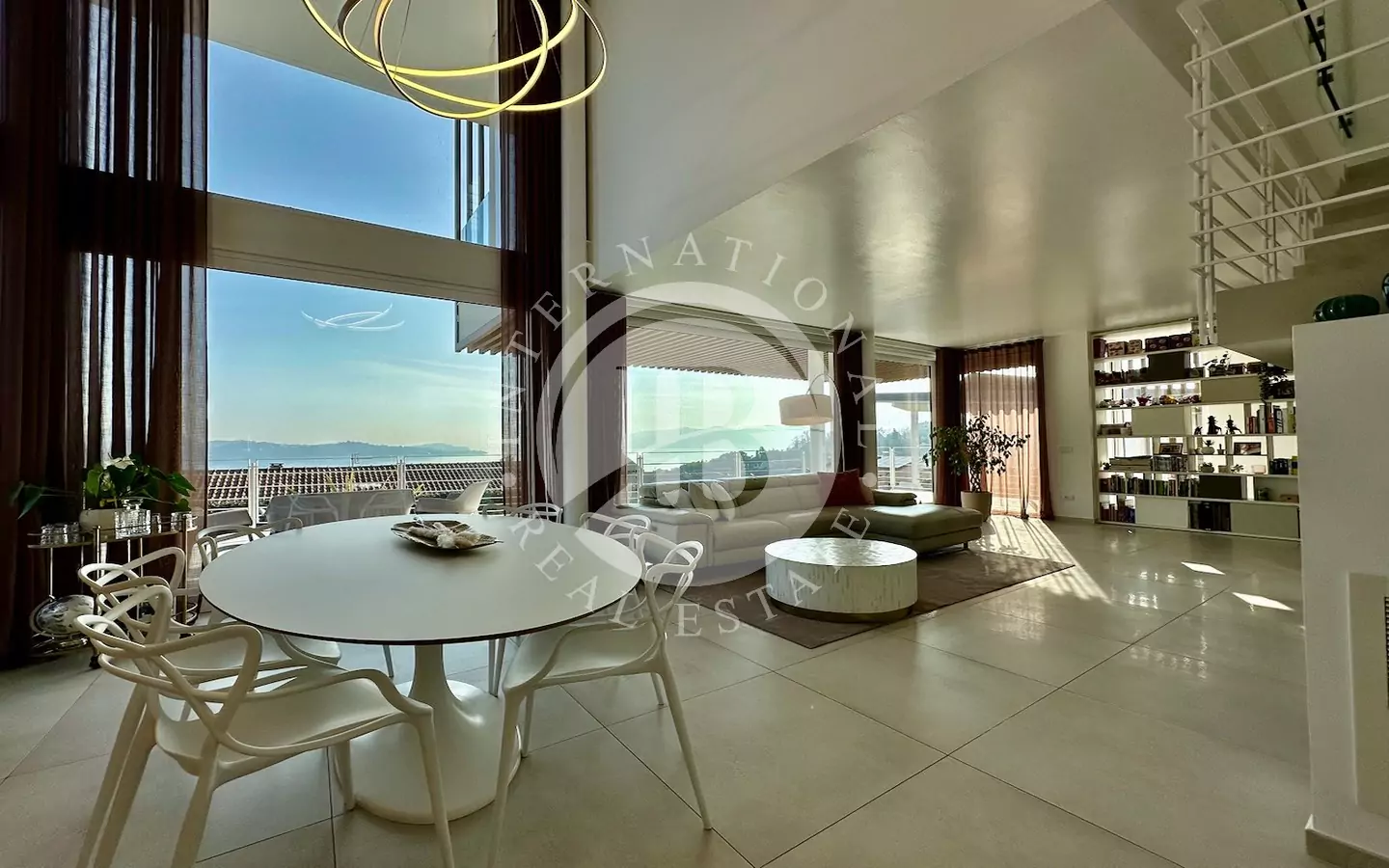 • Zona notte al primo piano: accessibile sia tramite ascensore che tramite una scenografica scala interna con parapetti in vetro temperato. Qui troviamo due camere da letto con bagno in comune e la suite padronale con bagno privato e uscita su un terrazzo riservato, dotato di doghe frangisole verticali per la privacy. Il soppalco interno offre una vista suggestiva sul soggiorno sottostante.