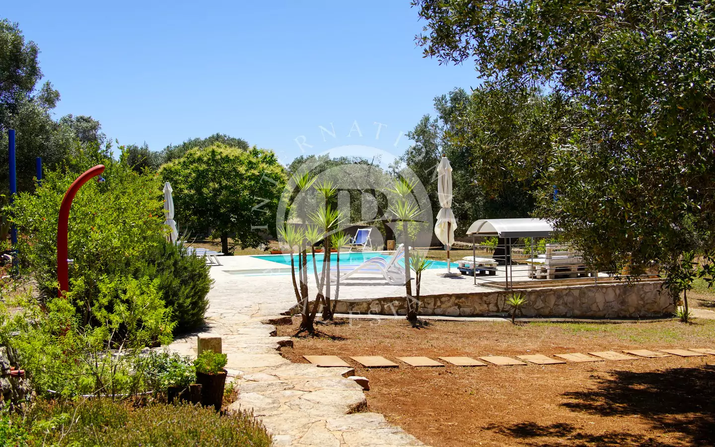 La proprietà è immersa in un’oasi di pace, circondata da maestosi ulivi secolari che creano angoli d’ombra ideali per il relax. Fiore all’occhiello, la piscina a sfioro si inserisce armoniosamente nel paesaggio.