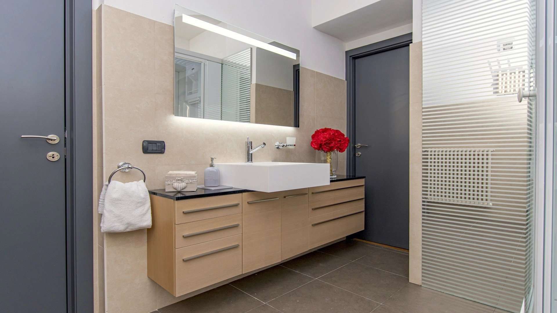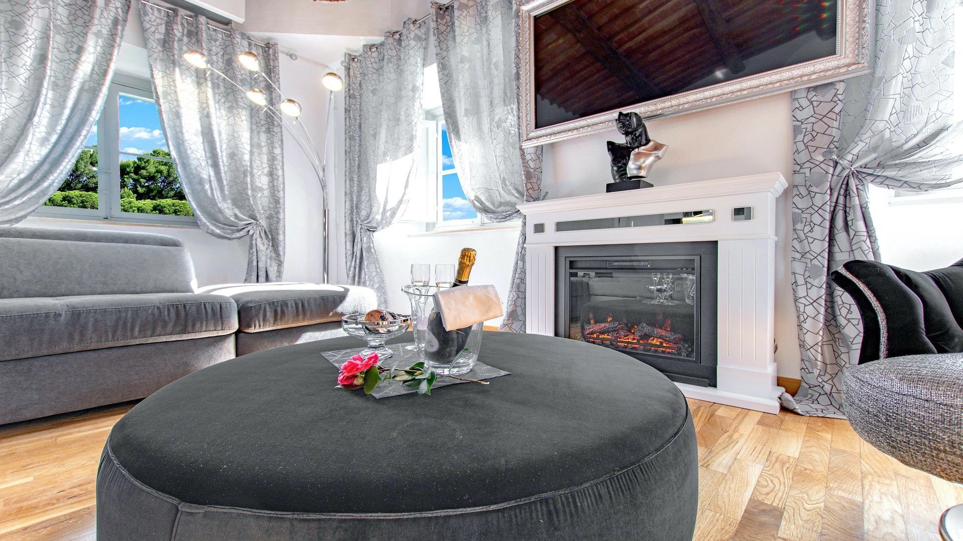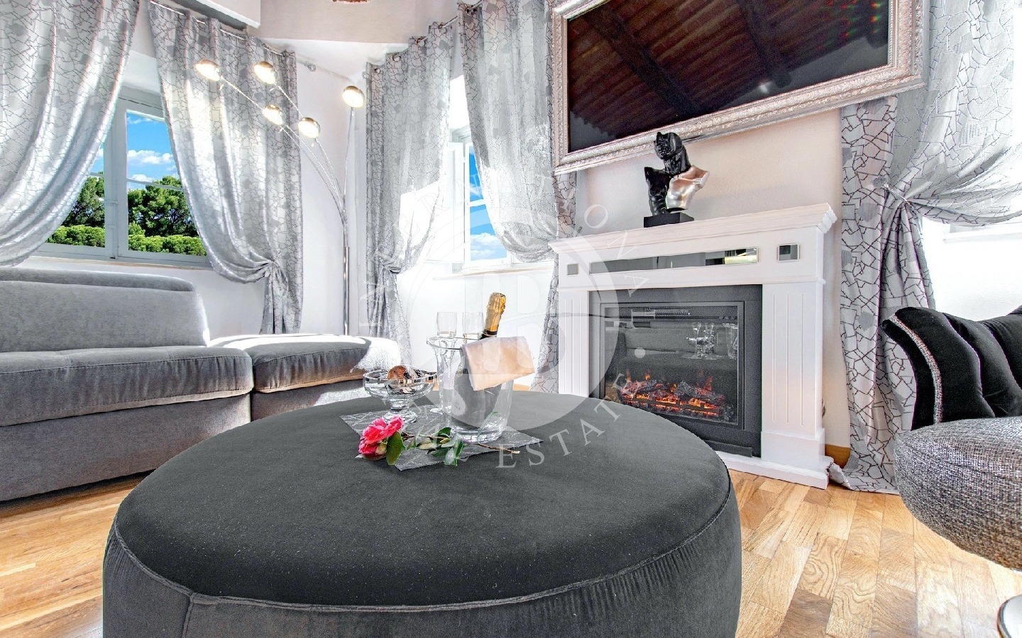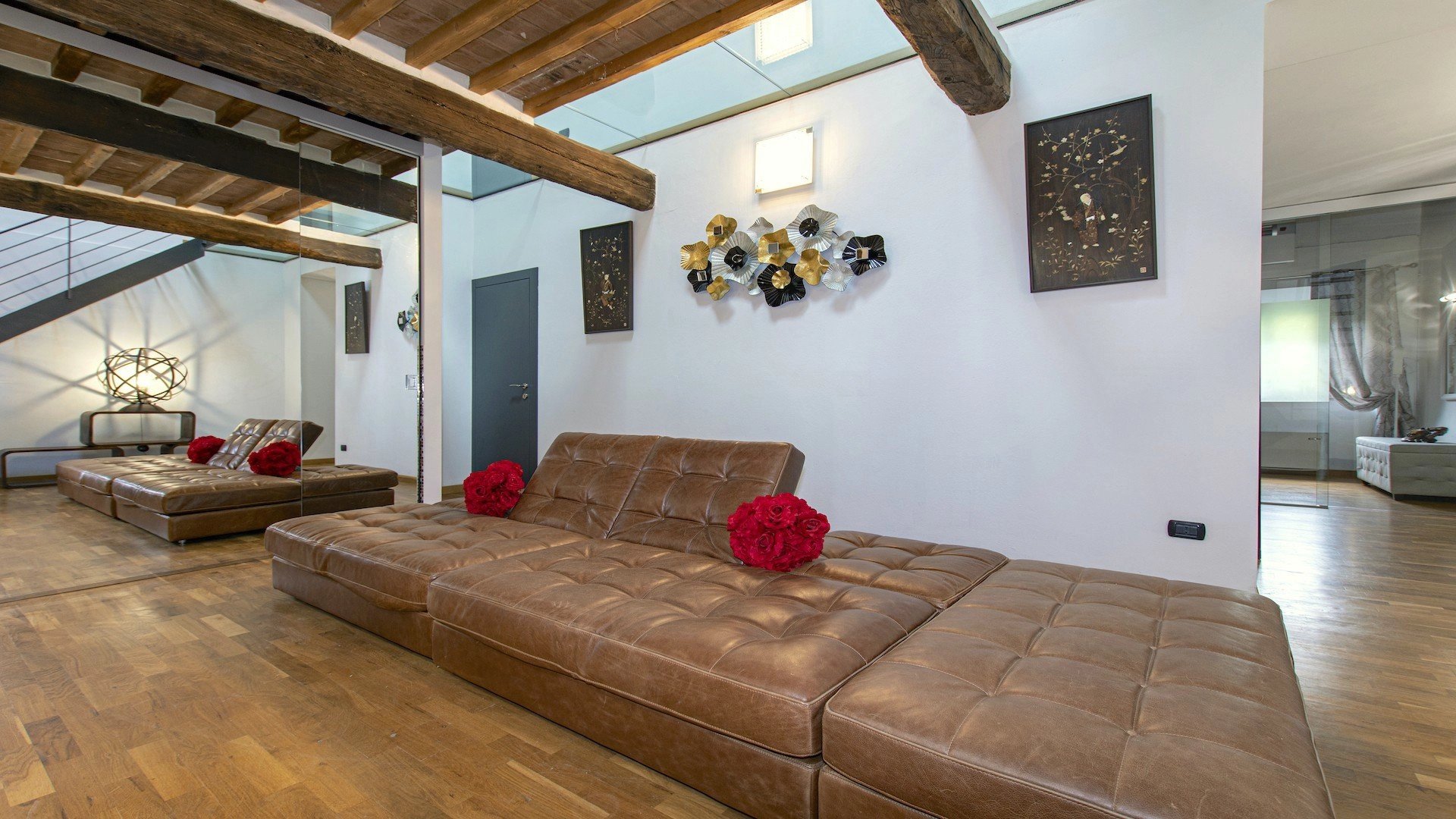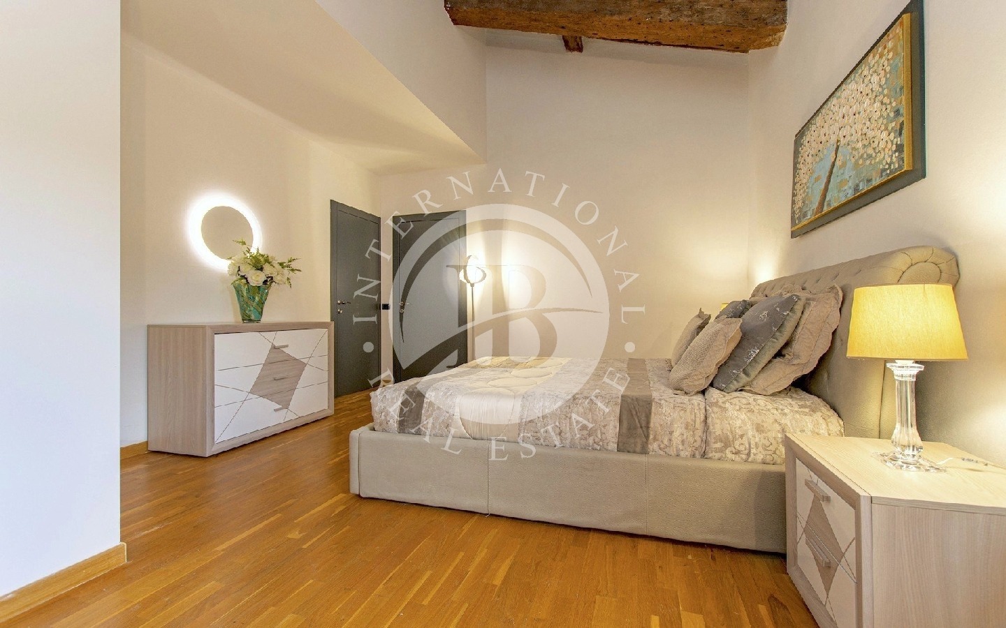 På første plan ligger den romslige entréen, en stor og komfortabel stue med fullt utstyrt kjøkken og spisestue, et gjestebad med dusj og hovedsoverommet med eget bad med dusj og dampbad, samt et garderoberom. Den øvre mellometasjen rommer et stort soverom med dobbeltseng og garderoberom, et tredje soverom/arbeidsrom og ytterligere et bad med dusj. Toppleiligheten er nennsomt renovert med synlige bjelker, parkettgulv og moderne designdetaljer, og har en fantastisk utsikt over Luccadalen, hagen og parken.