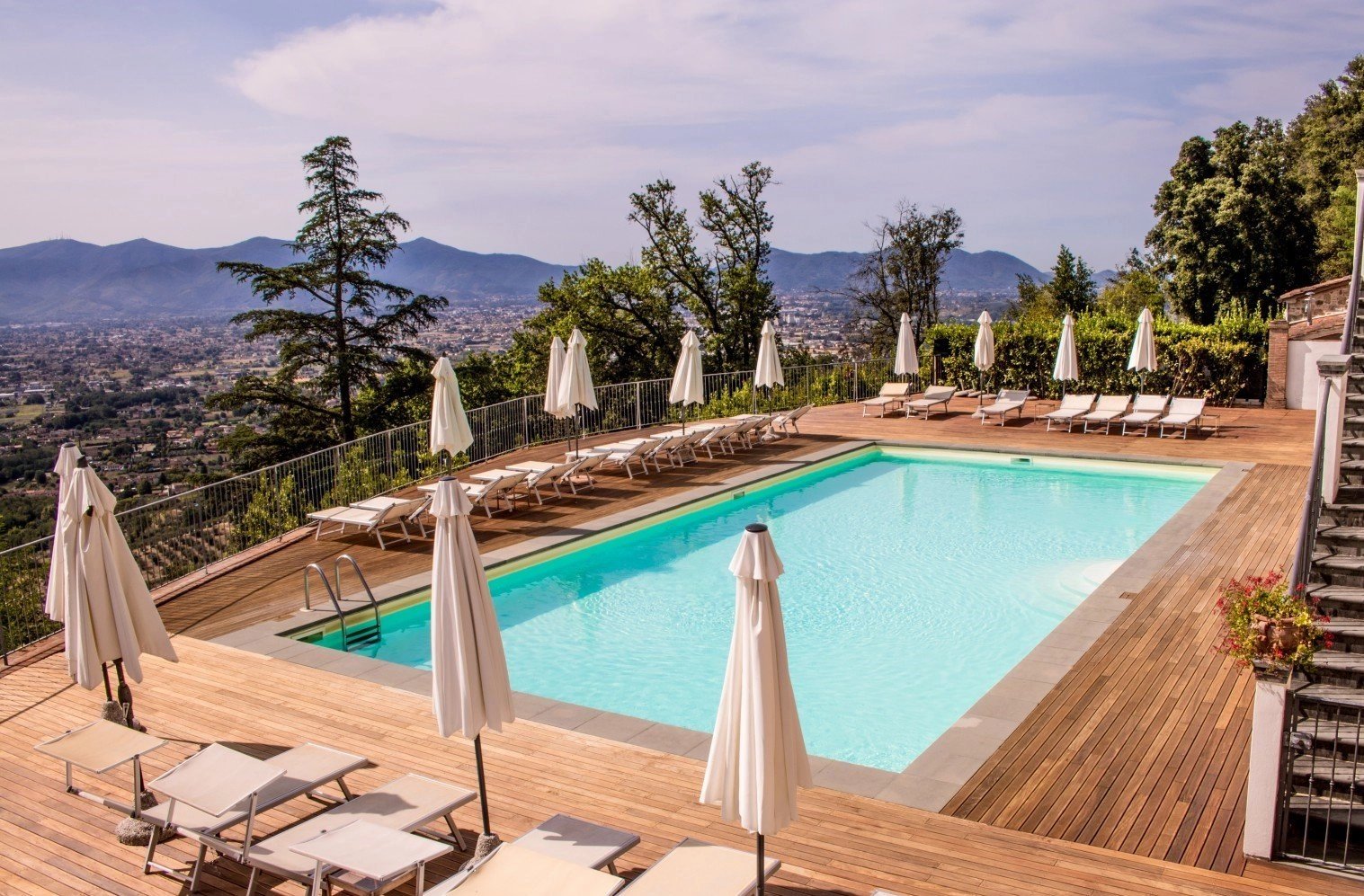et sesongåpent utendørsbasseng med utsikt over den vakre Lucca-dalen, utstyrt med parasoller og solsenger, slik at du kan nyte det fantastiske mikroklimaet i Luccas åser