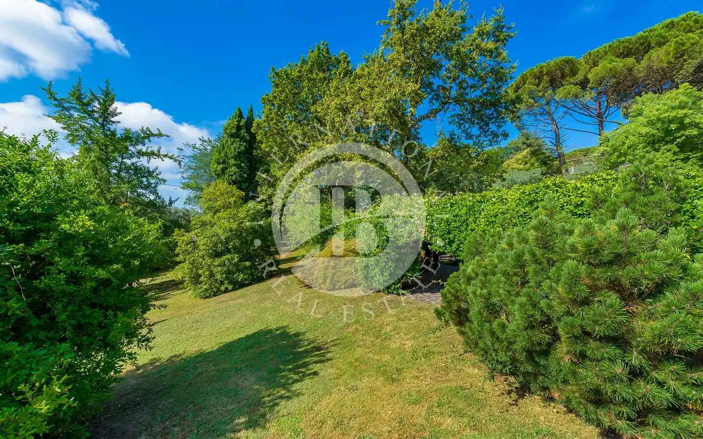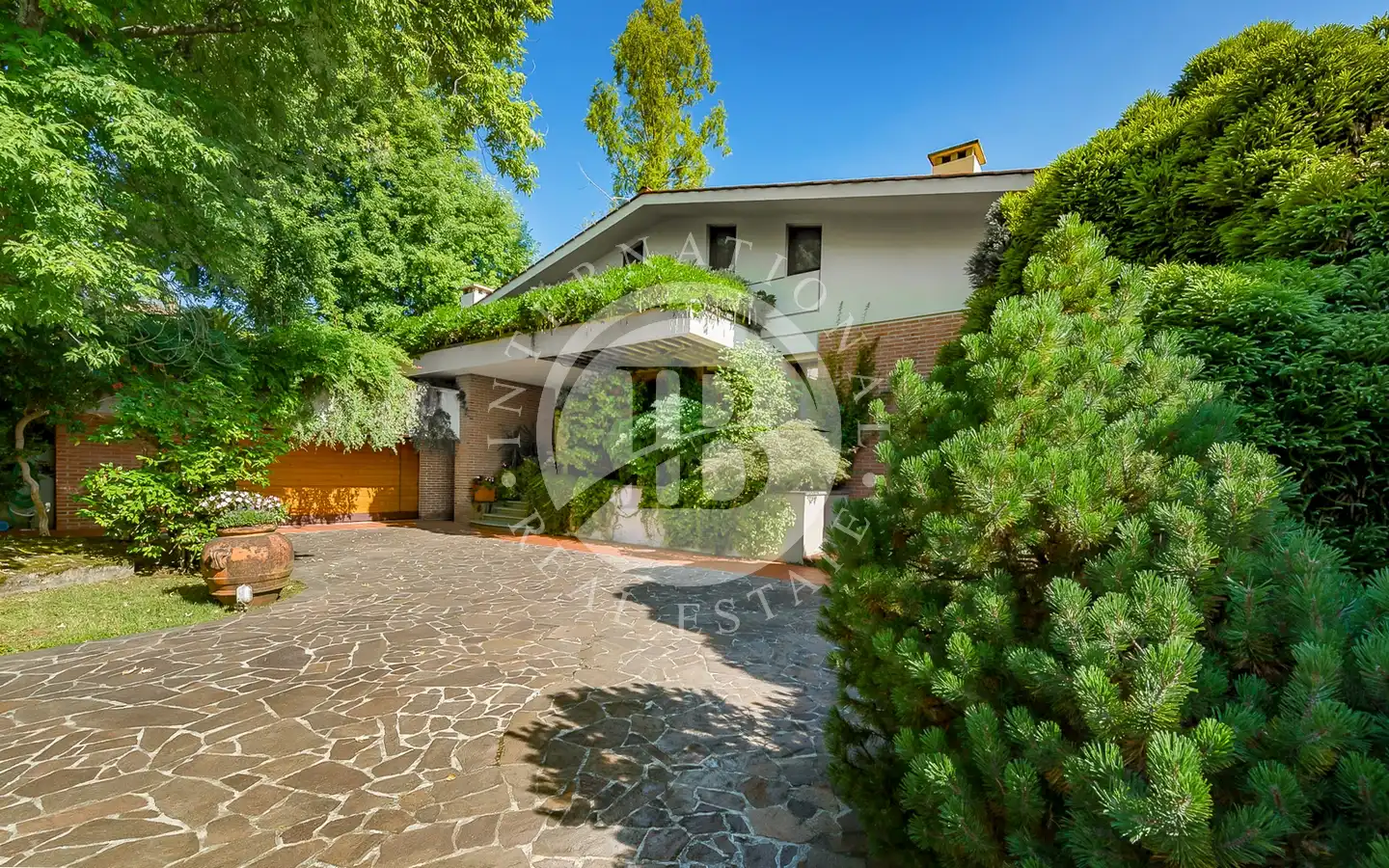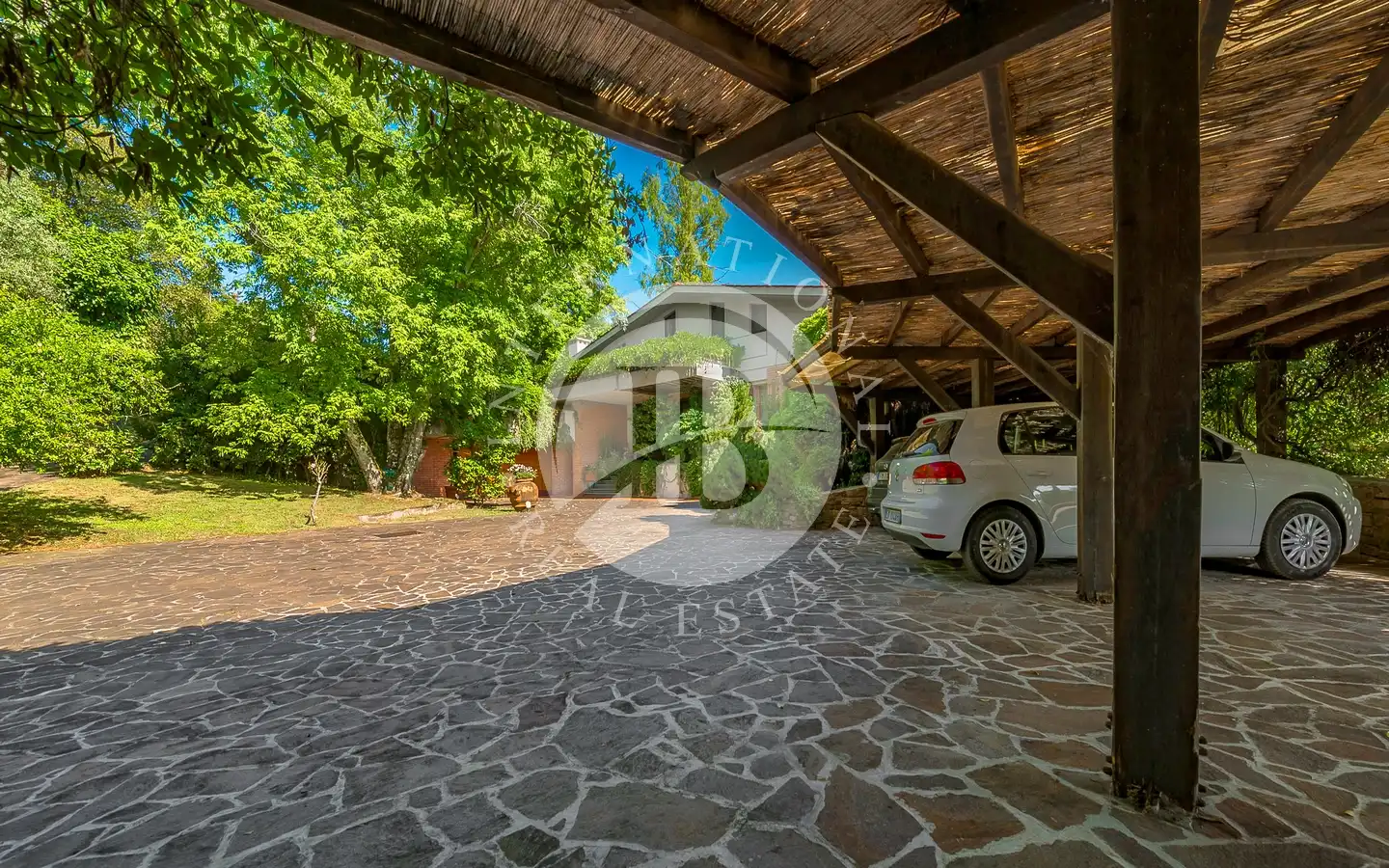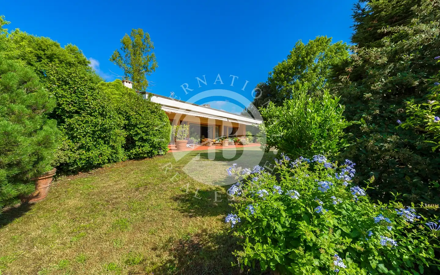 Uterommet er en oase av fred og skjønnhet: En 6000 kvadratmeter stor middelhavspark omgir villaen, som er helt inngjerdet for å garantere maksimal privatliv og sikkerhet. Store vinduer vender ut mot det grønne, noe som skaper en konstant dialog mellom inne og ute. Hagen, med store drivhus, kan forvandles til et treningsstudio, spa eller ekstra serviceområder. Den store garasjen for to biler og den overbygde parkeringsplassen har plass til opptil seks biler, noe som fullfører eiendommens ekstraordinære funksjonalitet.