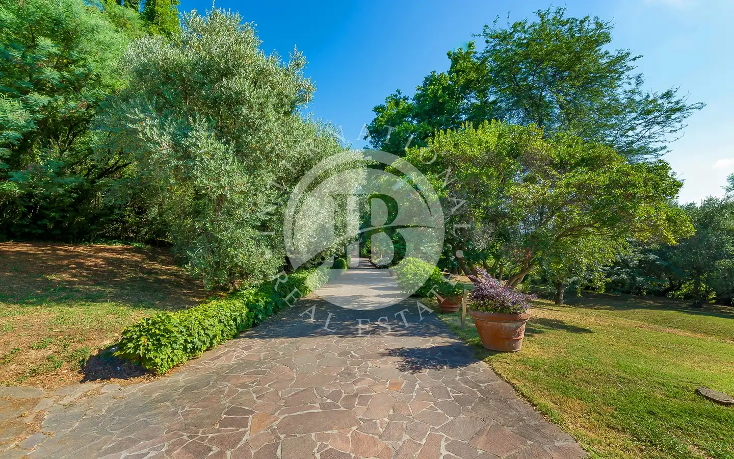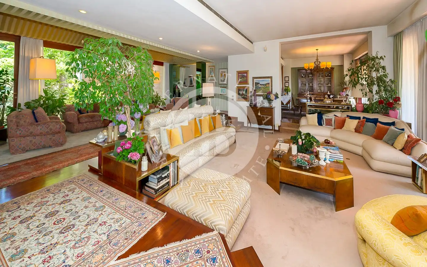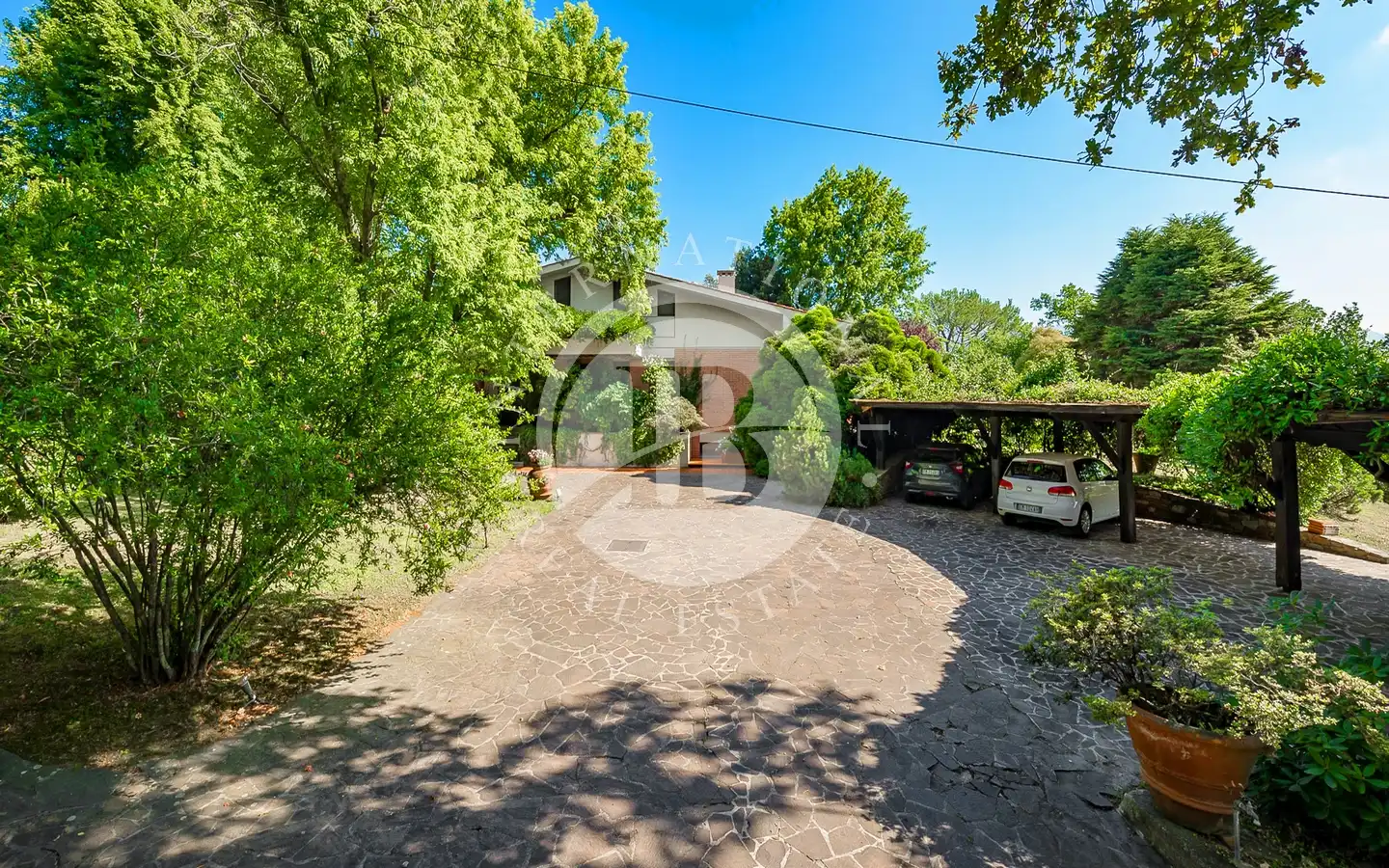 Uterommet er en oase av fred og skjønnhet: En 6000 kvadratmeter stor middelhavspark omgir villaen, som er helt inngjerdet for å garantere maksimal privatliv og sikkerhet. Store vinduer vender ut mot det grønne, noe som skaper en konstant dialog mellom inne og ute. Hagen, med store drivhus, kan forvandles til et treningsstudio, spa eller ekstra serviceområder. Den store garasjen for to biler og den overbygde parkeringsplassen har plass til opptil seks biler, noe som fullfører eiendommens ekstraordinære funksjonalitet.