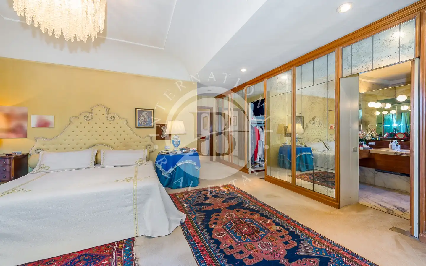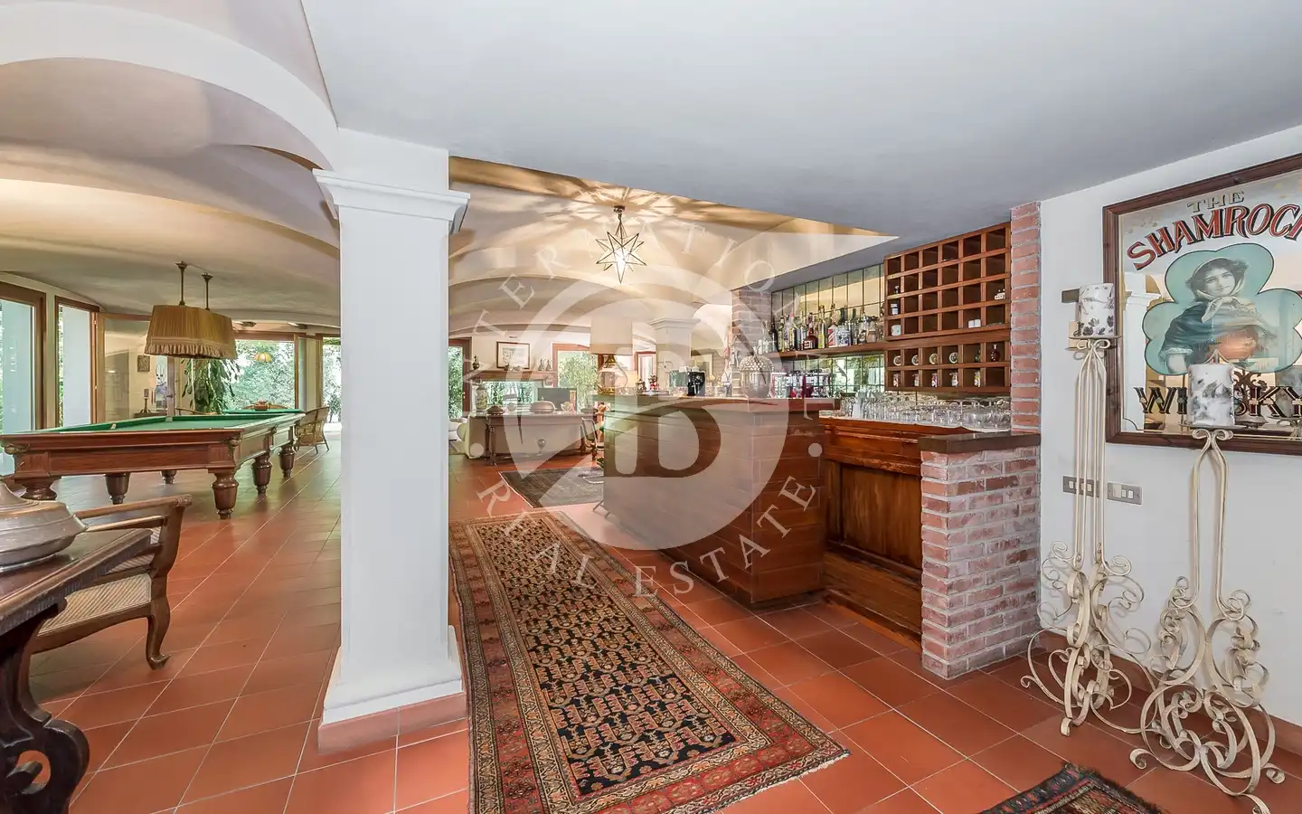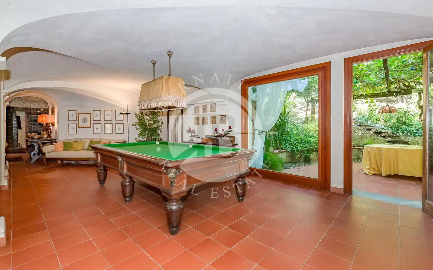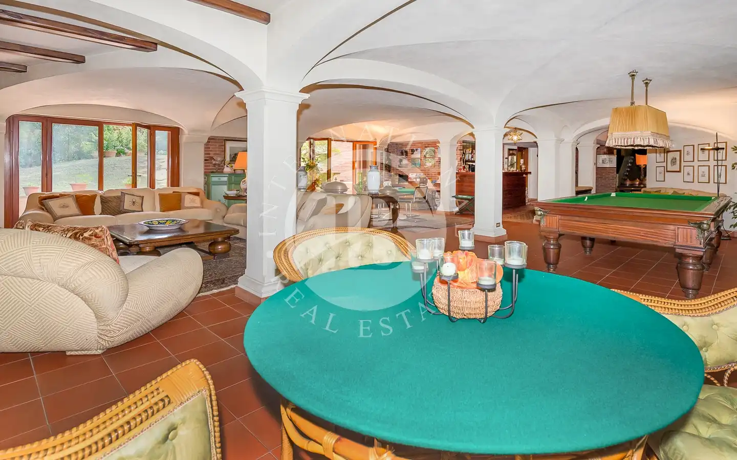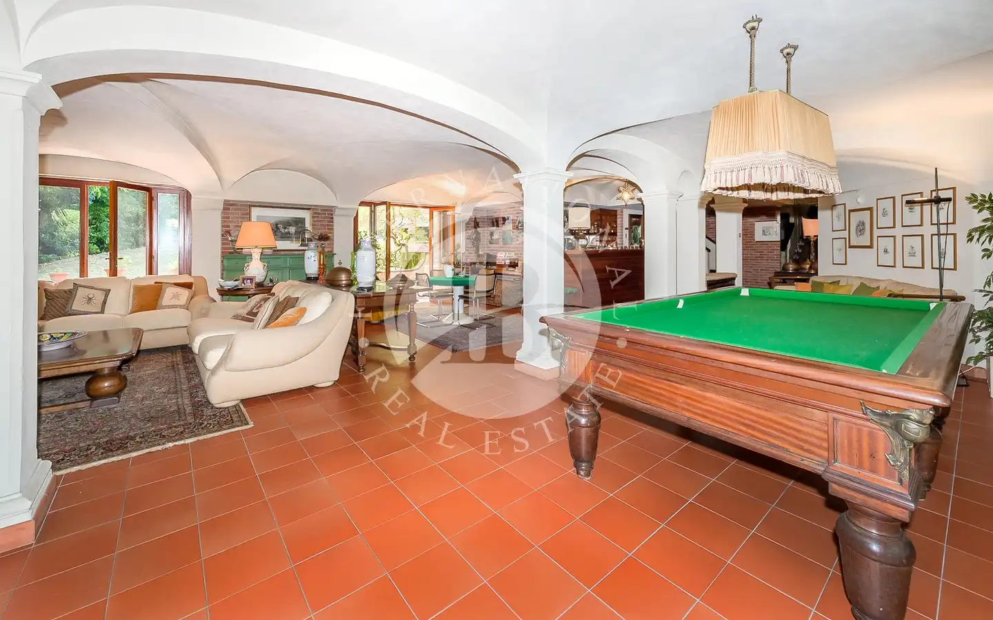 Villaen er fordelt over flere nivåer, med raffinerte, lyse rom. De ulike resepsjons- og oppholdsrommene, alle med peis, er ideelle for å ta imot gjester eller nyte familiestunder. De romslige hovedsoverommene med panoramautsikt har eget bad og walk-in-garderobe, mens gjesteavdelingen har suiter med eget bad, et arbeidsrom med peis og egen utgang. To kjøkken, ett hovedkjøkken og ett som betjener tavernaen, garanterer maksimal funksjonalitet. Tavernaen, med biljardområde, cocktailbar og innendørs og utendørs grill, byr på en hyggelig og naturskjønn atmosfære, beriket av en original peis som også kan brukes fra utsiden.