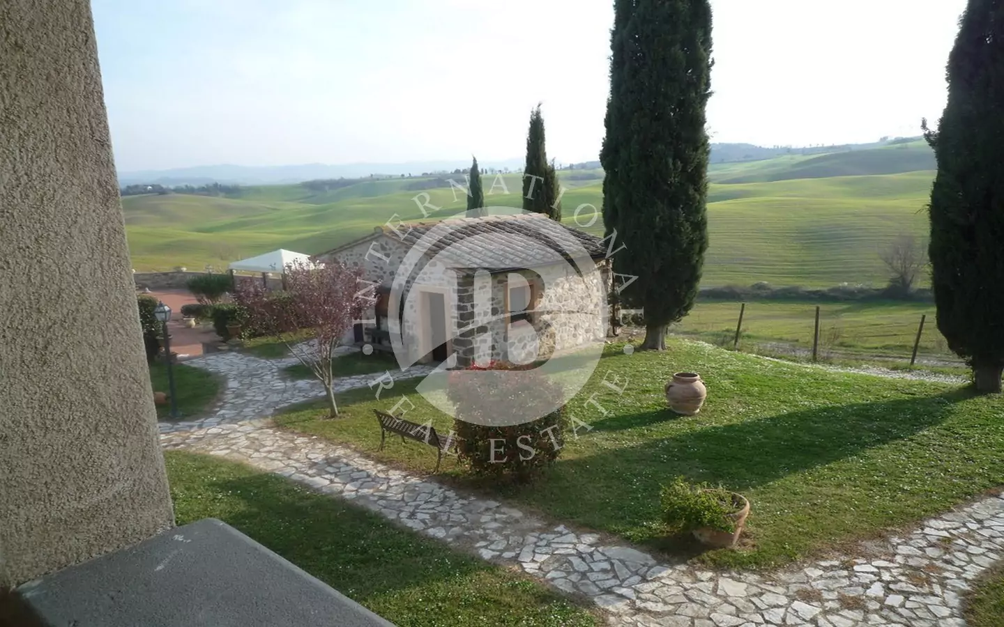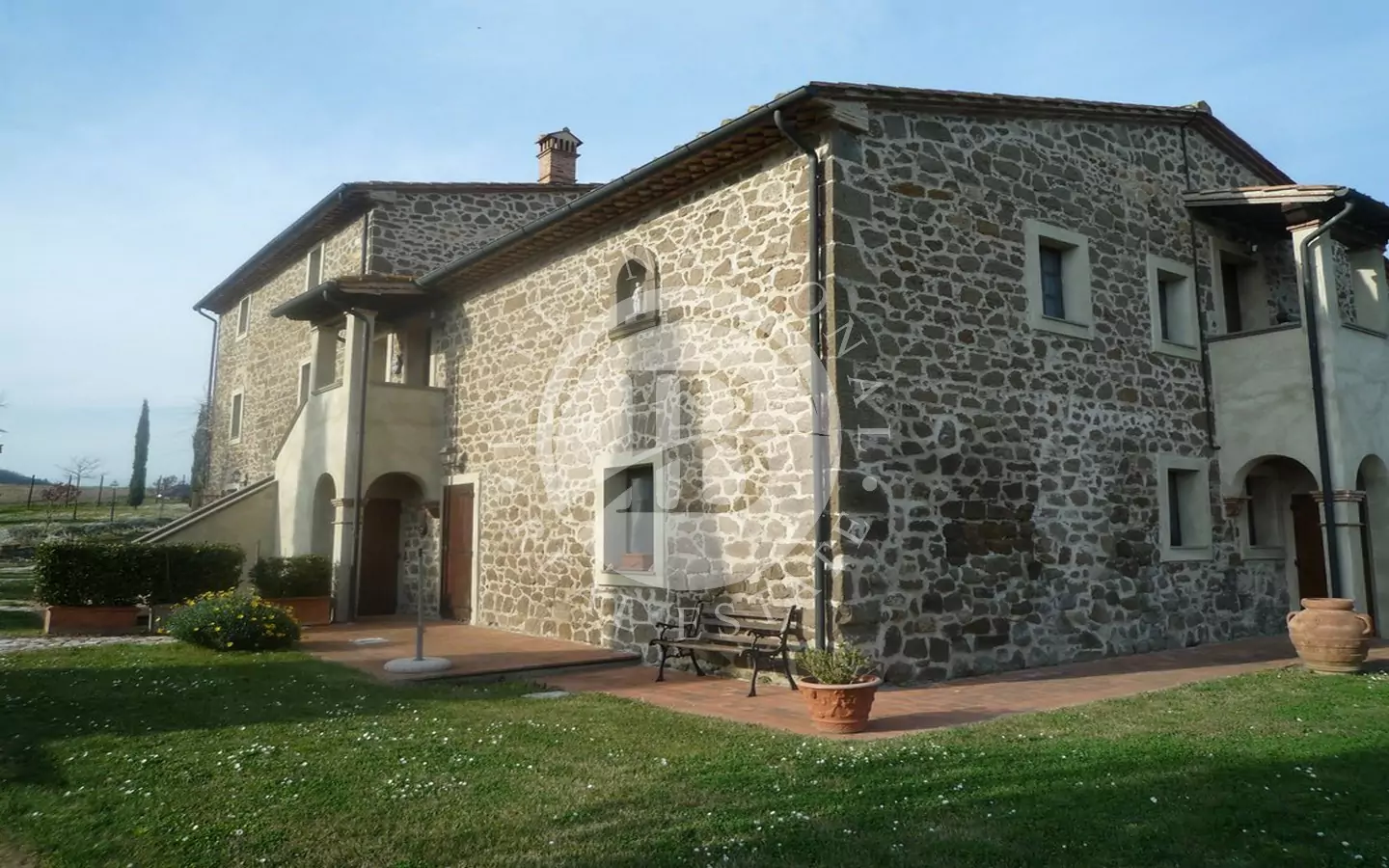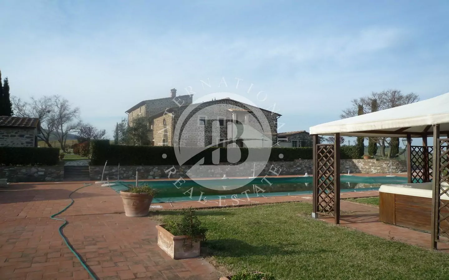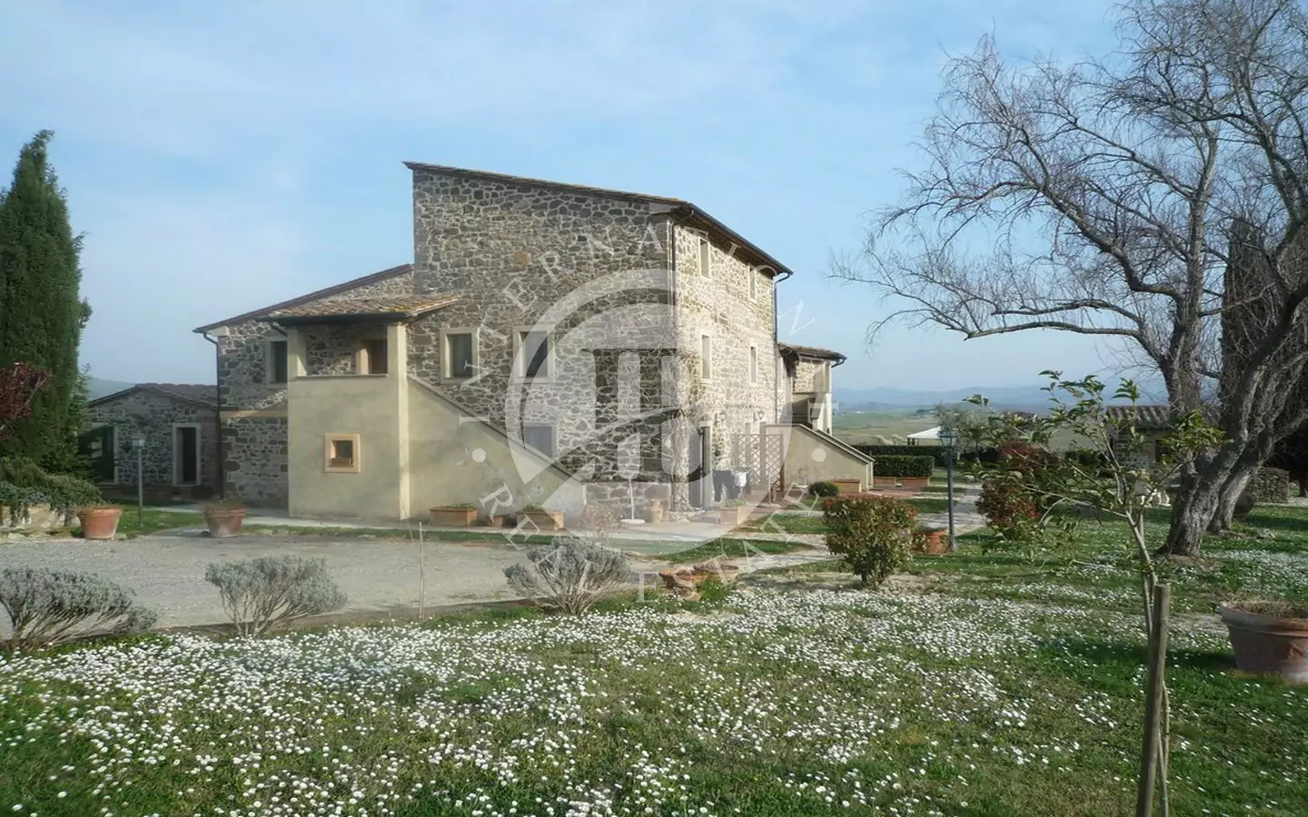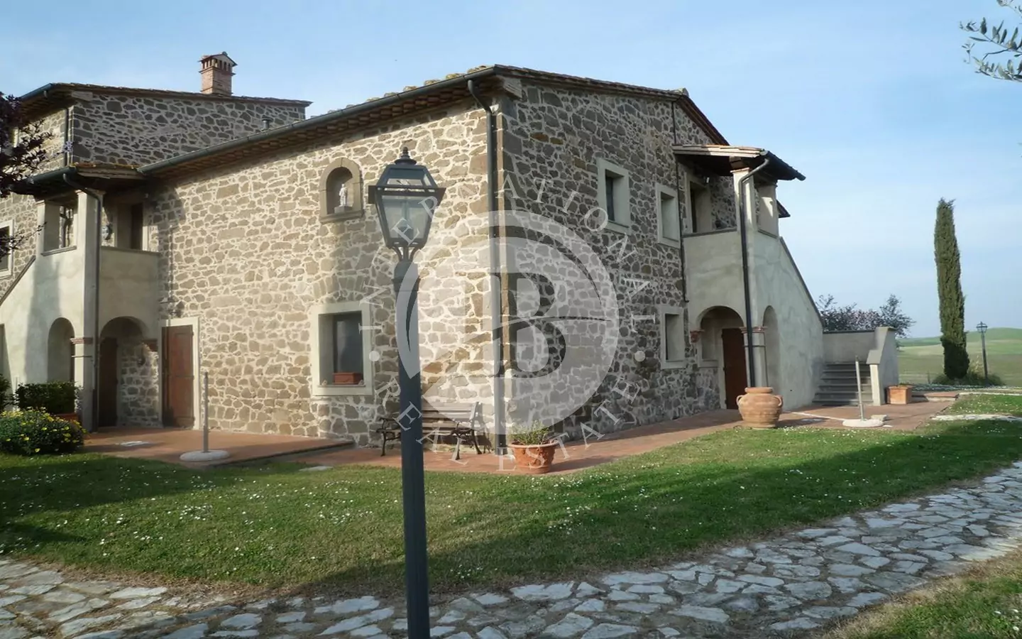 Det 650 kvm store våningshuset er helt i stein med 1 ha tomt. Inndelt i 9 leiligheter, hvorav to- og treromsleiligheter med hage, svømmebasseng, jacuzzi, satellitt-TV. Innredet med rustikke møbler. Dominerende beliggenhet med panoramautsikt over landskapet og en fortryllende utsikt over Volterra. Utmerket adkomstvei.