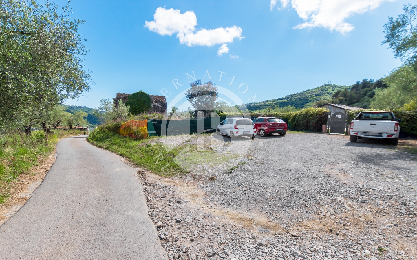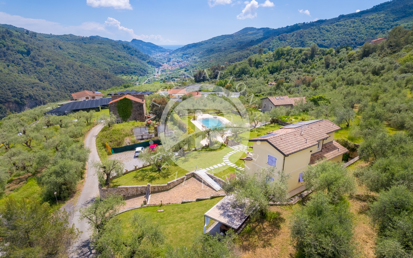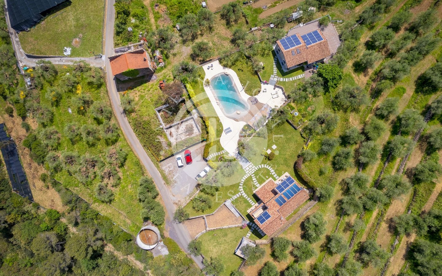 Eiendommen ligger på en tomt på 3 500 m², inkludert en olivenlund i produksjon. Adkomst via en privat innkjørsel med parkering for flere biler.