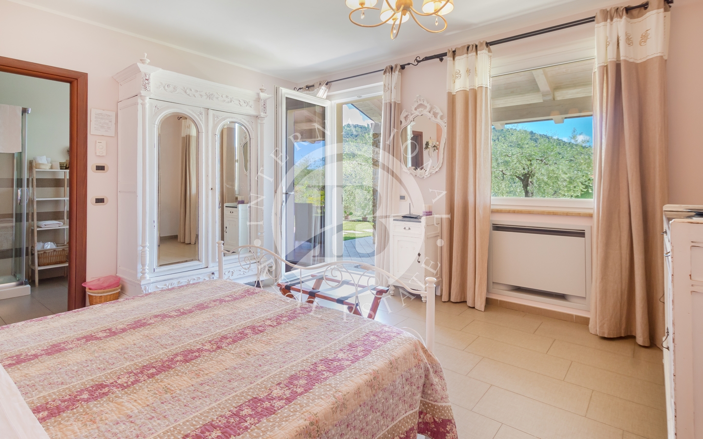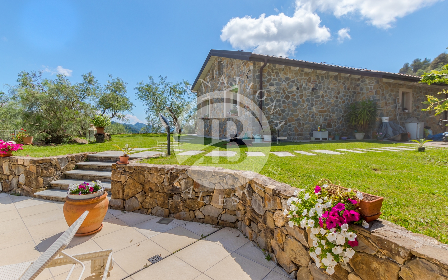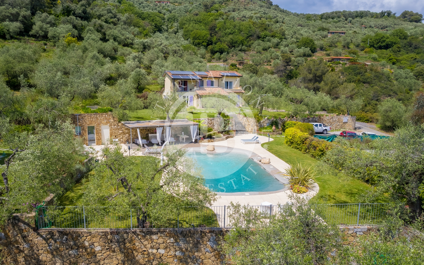 Eiendommen ligger på en tomt på 3 500 m², inkludert en olivenlund i produksjon. Adkomst via en privat innkjørsel med parkering for flere biler.