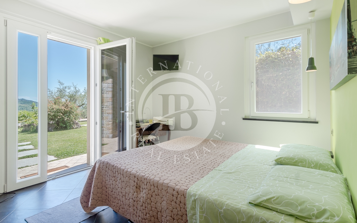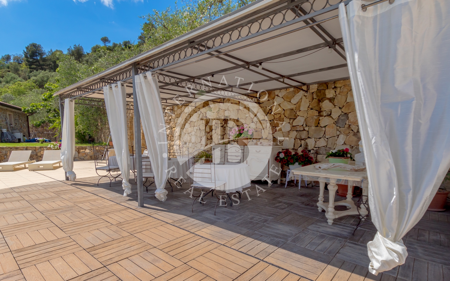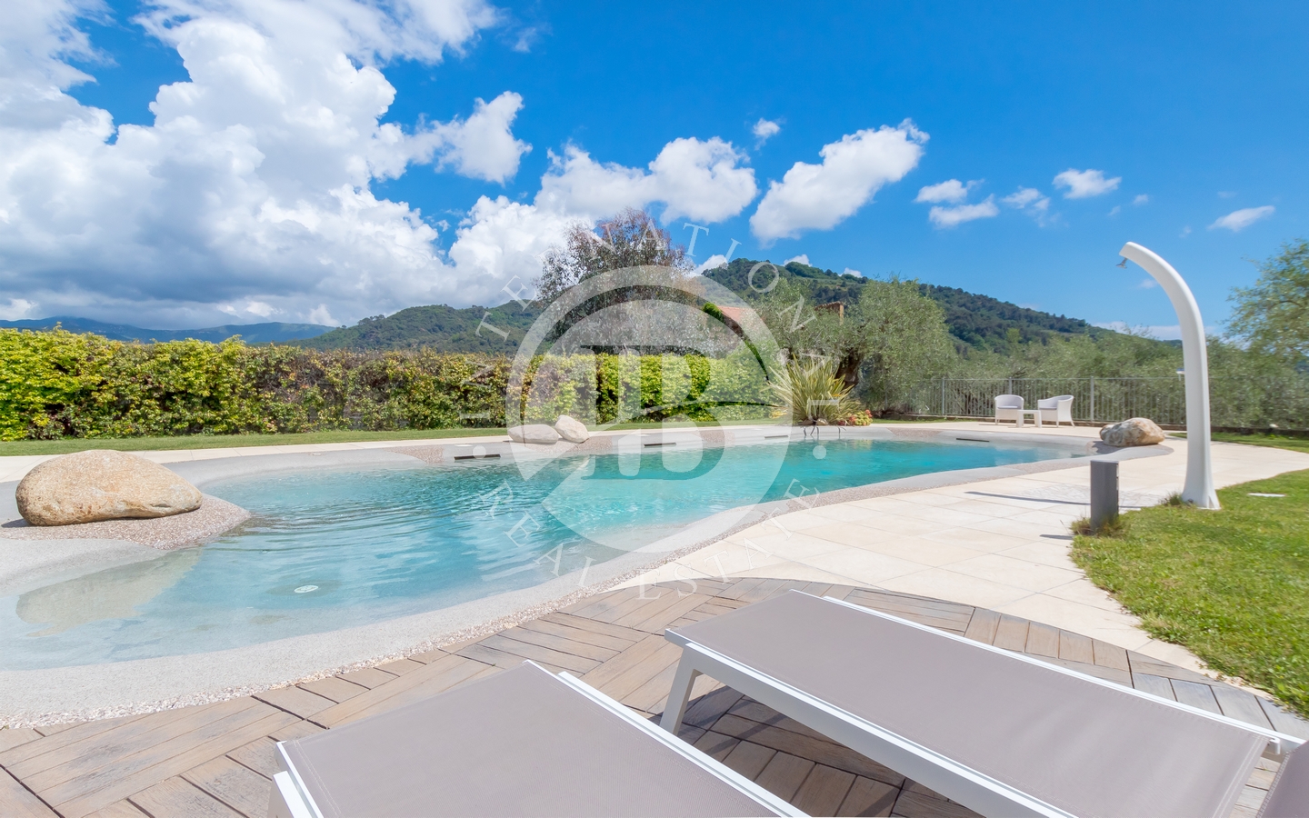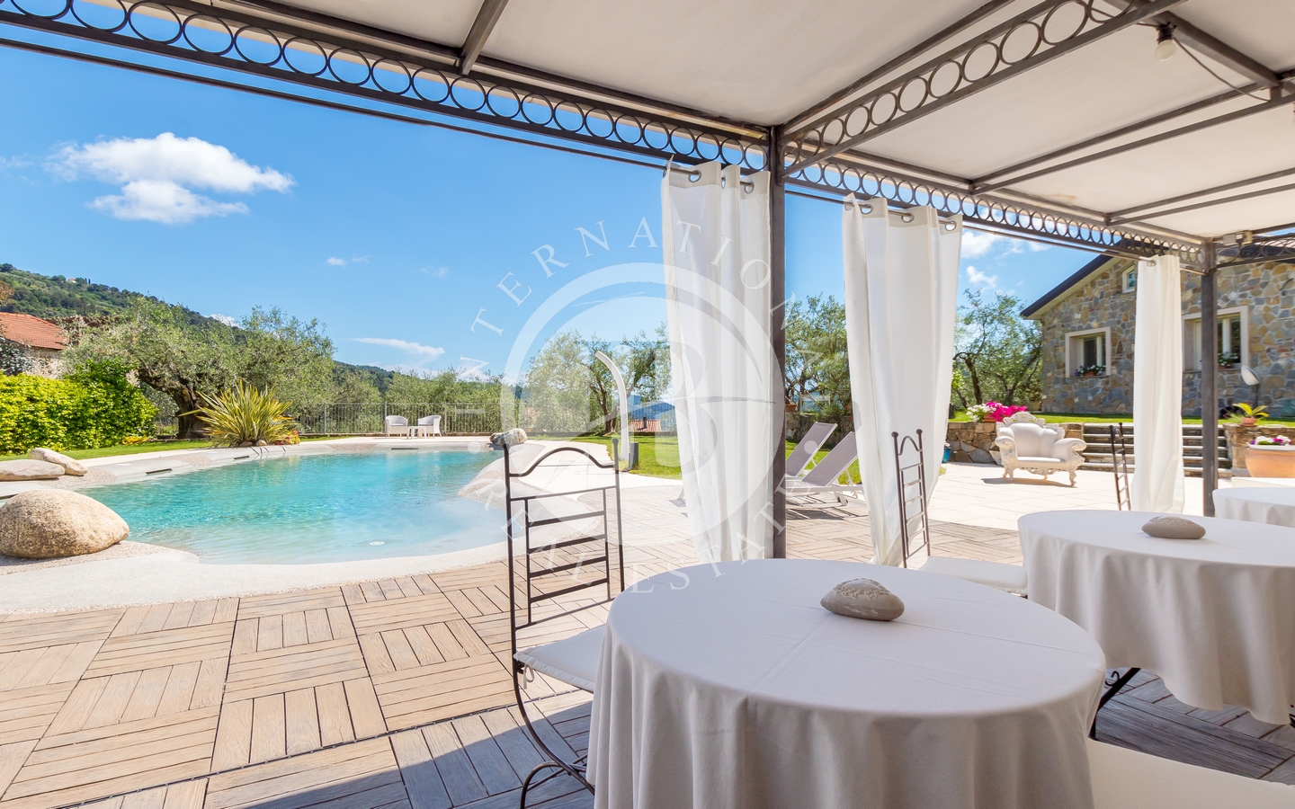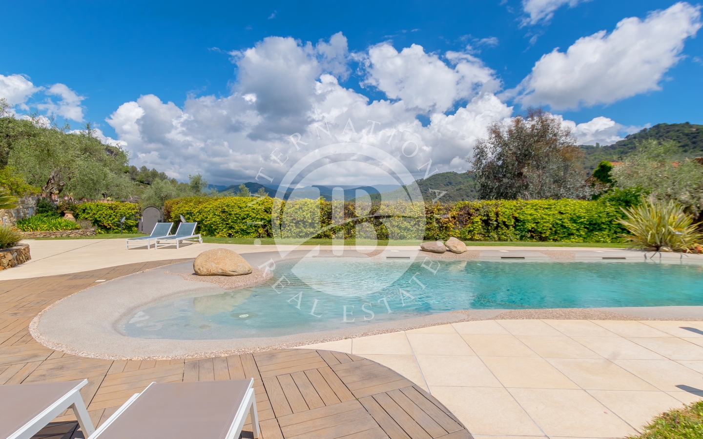 Uteområdet inkluderer en stor hage med en pergola, ideell for utendørs stunder. Svømmebassenget, som er utstyrt med et økologisk rensesystem for kalium og magnesium, er omgitt av et grøntområde med solarium og en annen pergola med utekjøkken.