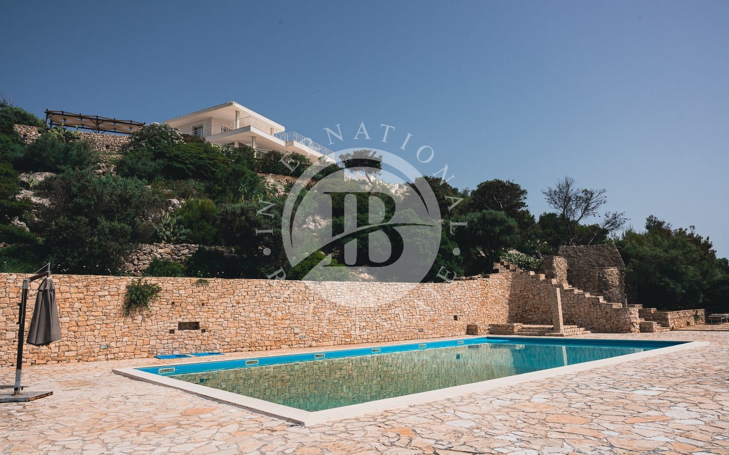 Il cuore della proprietà è la piscina a sfioro ad acqua salata, che sembra fondersi con l’orizzonte all’alba, accessibile tramite un percorso in pietra immerso nella natura mediterranea.