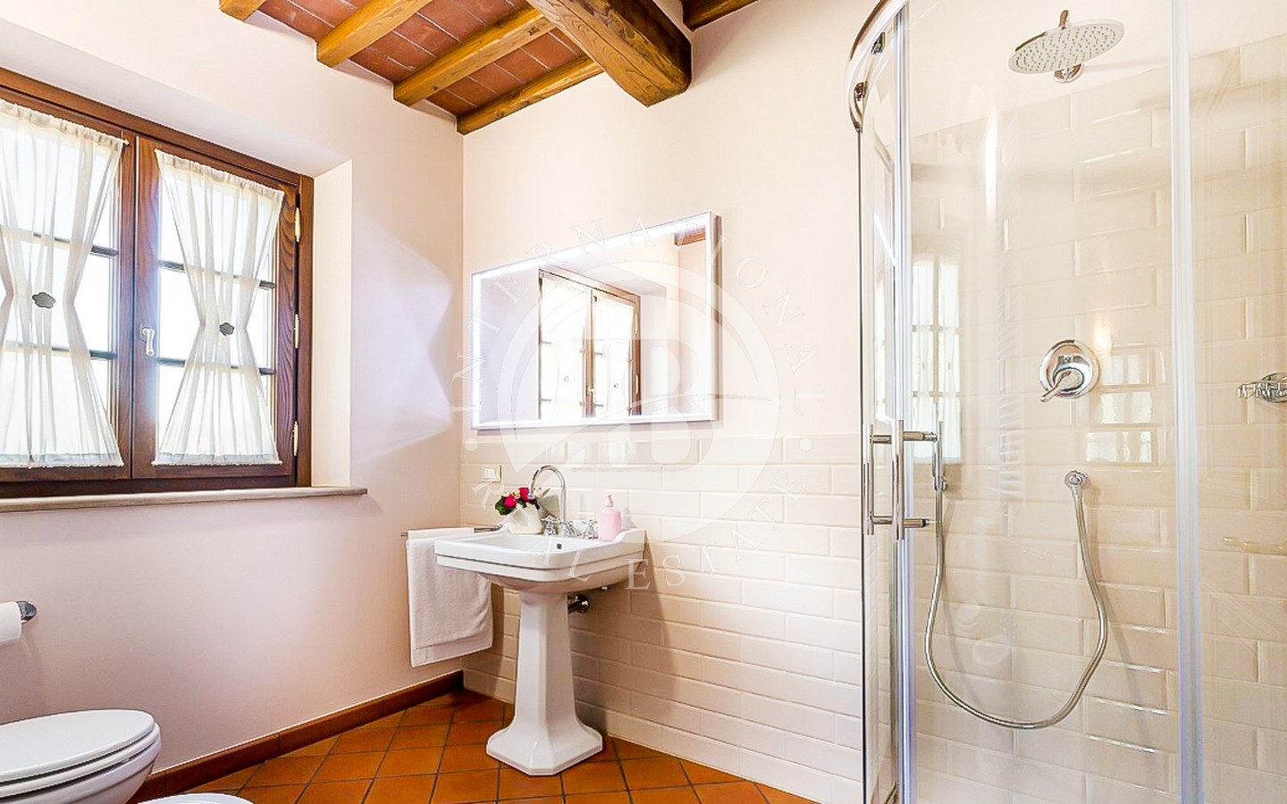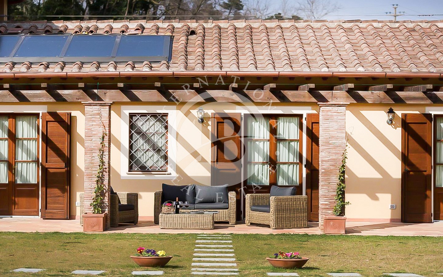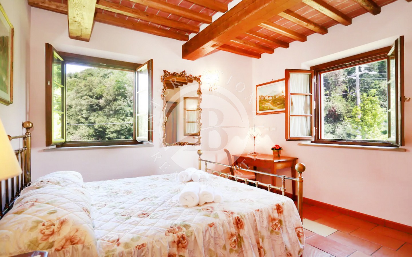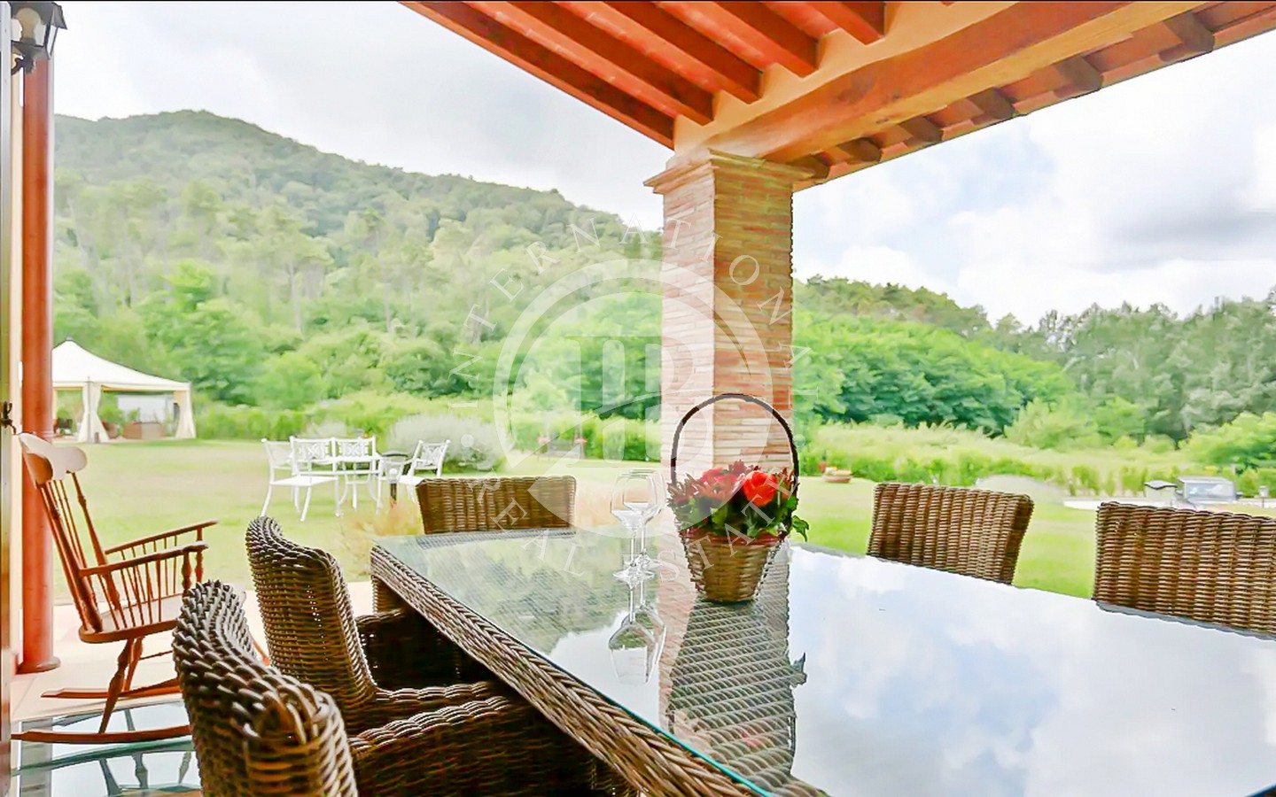 Utenfor ligger et majestetisk svømmebasseng på 8 x 12 meter som strekker seg ut i den frodige 9000 kvadratmeter store hagen, og er et perfekt sted for avslapning og underholdning. Den utmerkede beliggenheten gir en fantastisk utsikt over det toskanske landskapet, mens privatlivet garanteres av en privilegert beliggenhet, langt fra nysgjerrige blikk.
