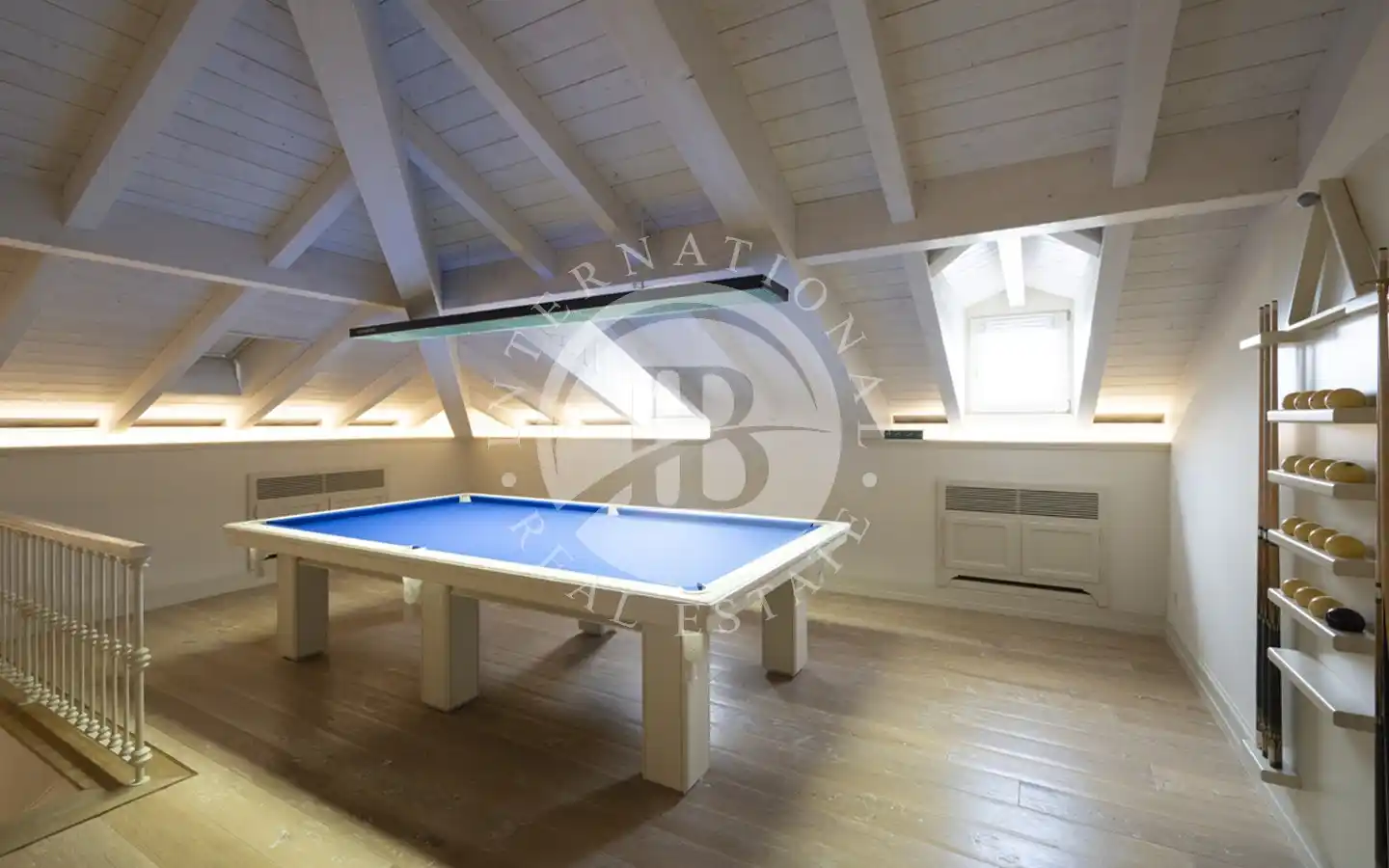 I toppetasjen er det et elegant avslapningsområde med lese- og oppholdsrom, biljardbord, soverom med garderobe, bad og en kjøkkenkrok som gjør denne etasjen helt uavhengig: ideell for gjester.