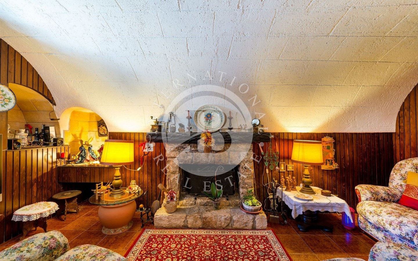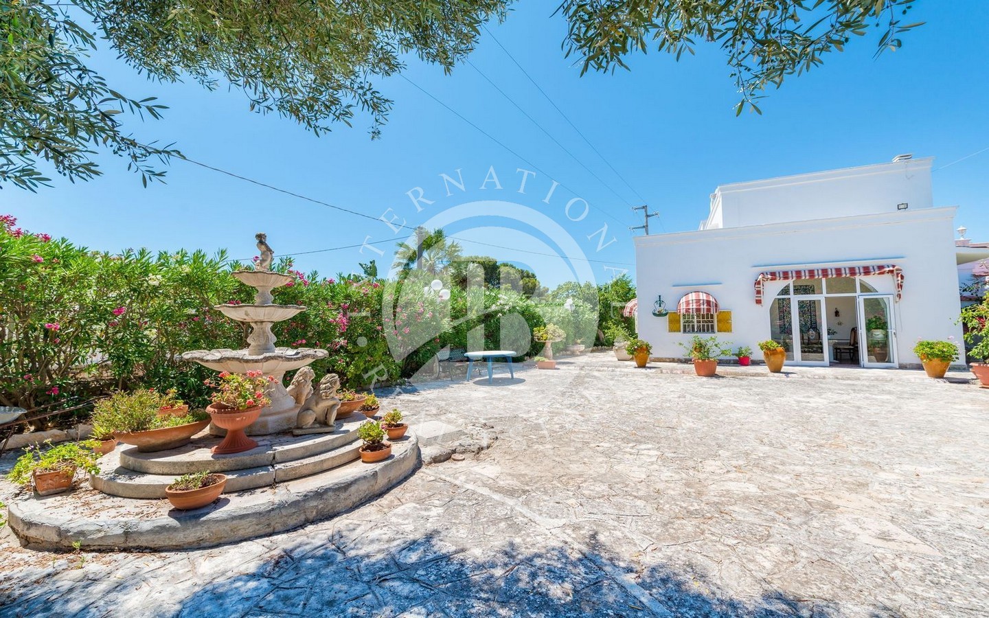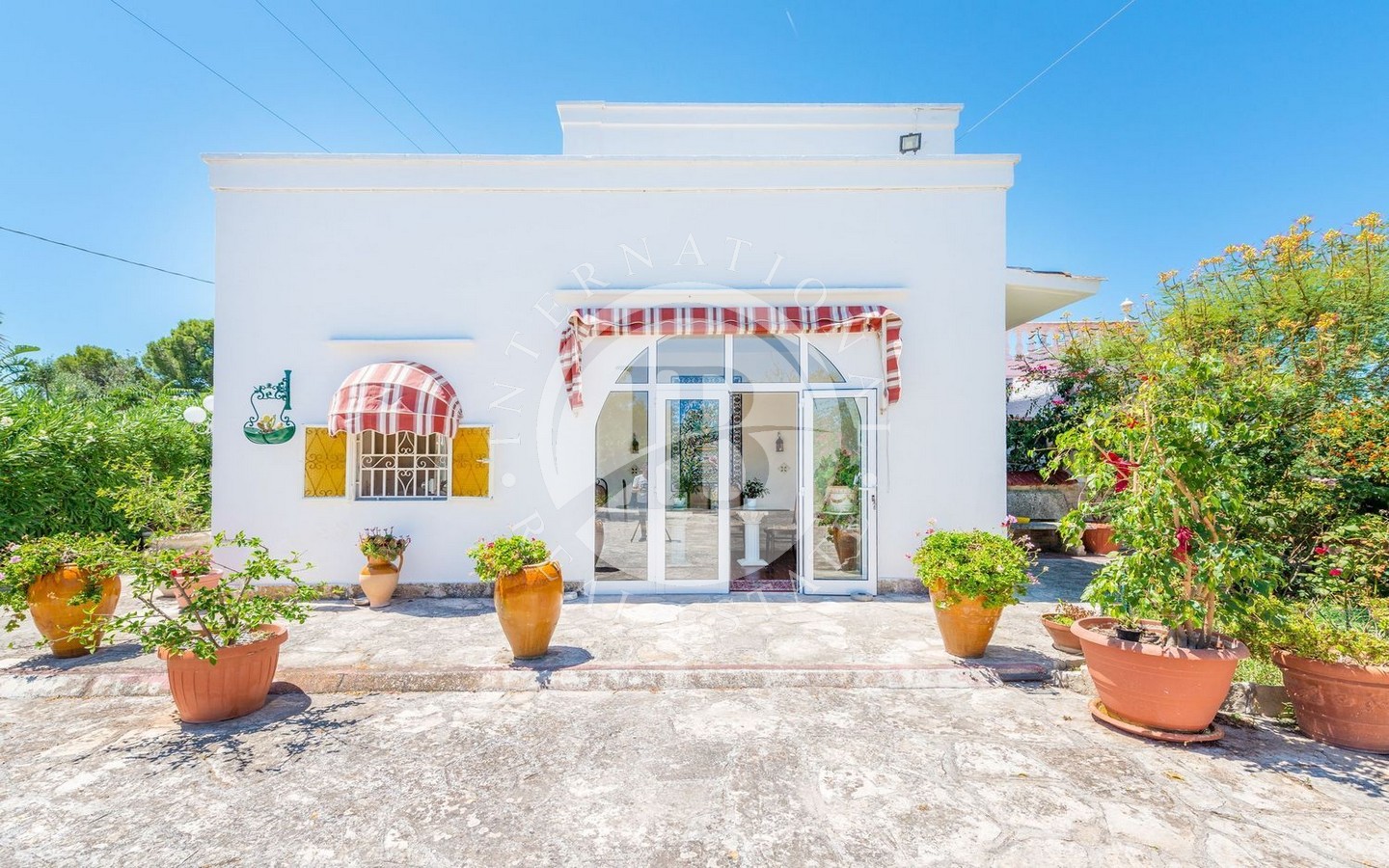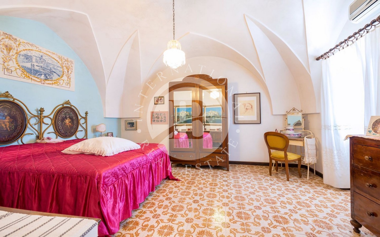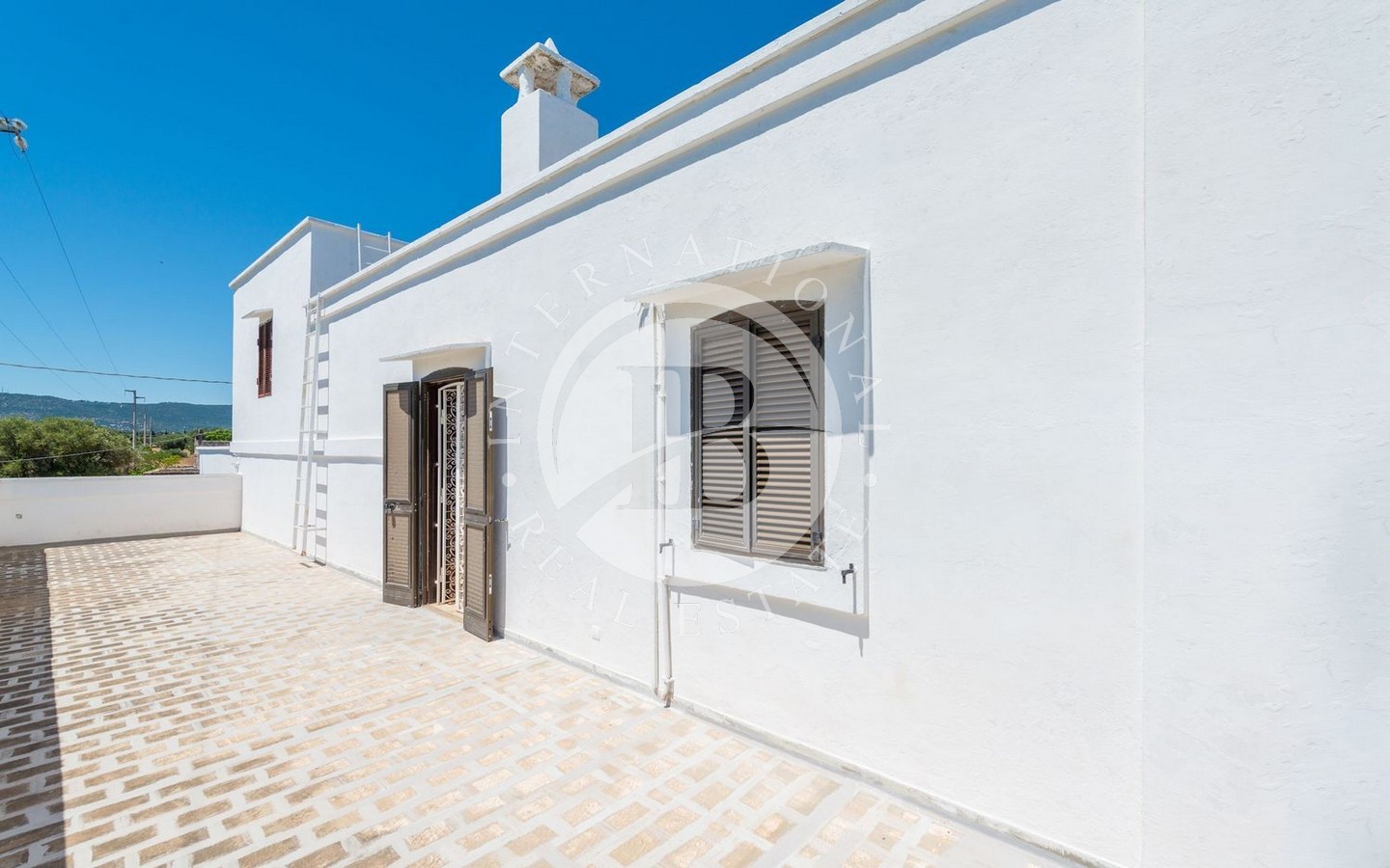 Disposto su due livelli, il casale si compone di undici spaziosi vani, caratterizzati in parte da suggestive volte tipiche, che conferiscono un fascino unico all'ambiente. Gli ampi patii, le verande e le terrazze pertinenziali offrono spazi ideali per godere appieno della vista e del clima mediterraneo, mentre il giardino attrezzato di circa 1800 mq, arricchito da piante e fiori, crea un'oasi di verde e tranquillità.