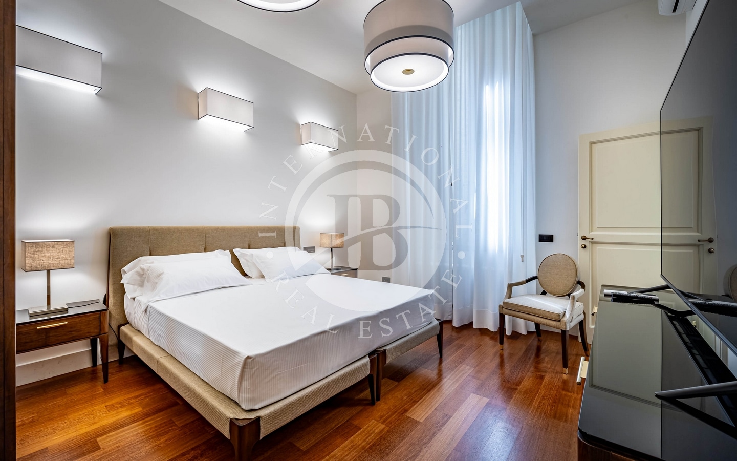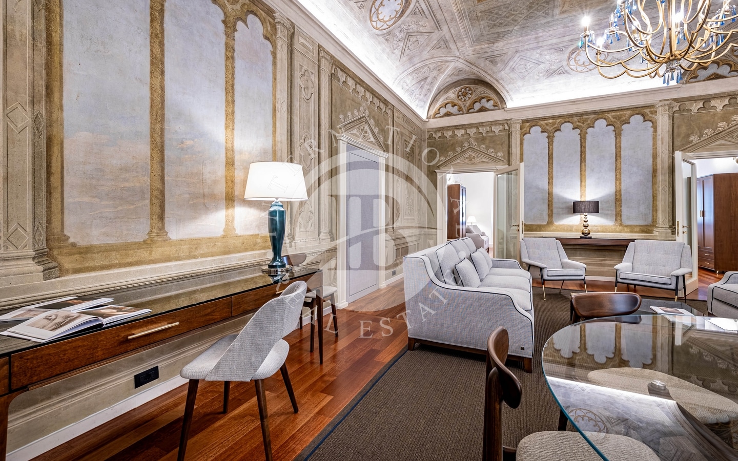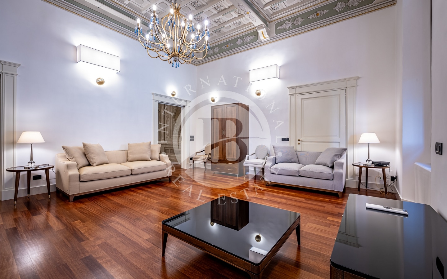 Gli interni di questo appartamento di lusso sono un raffinato equilibrio tra tradizione e innovazione. Il salone affrescato è un omaggio alla grandezza storica di Firenze, mentre il soggiorno offre spazi ampi e luminosi per accogliere ospiti con stile. Le due camere da letto, ognuna arredata con eleganza e materiali pregiati, garantiscono il massimo comfort. Tre bagni, tra cui uno di servizio, presentano finiture moderne di alta qualità. La cucina attrezzata completa l'offerta, rendendo questo appartamento ideale per chi cerca una residenza di prestigio nel cuore della città.