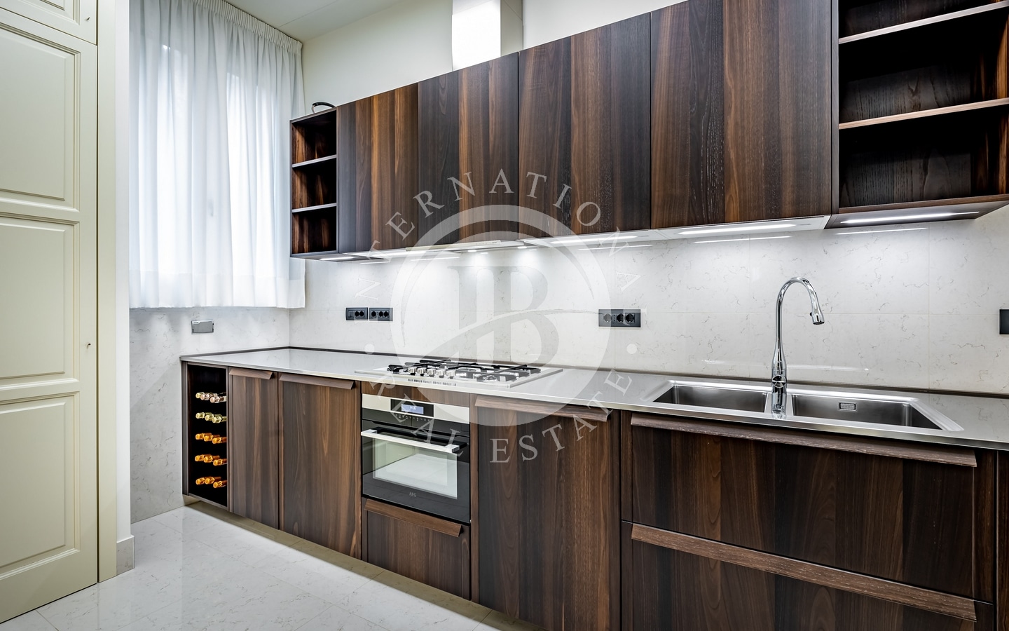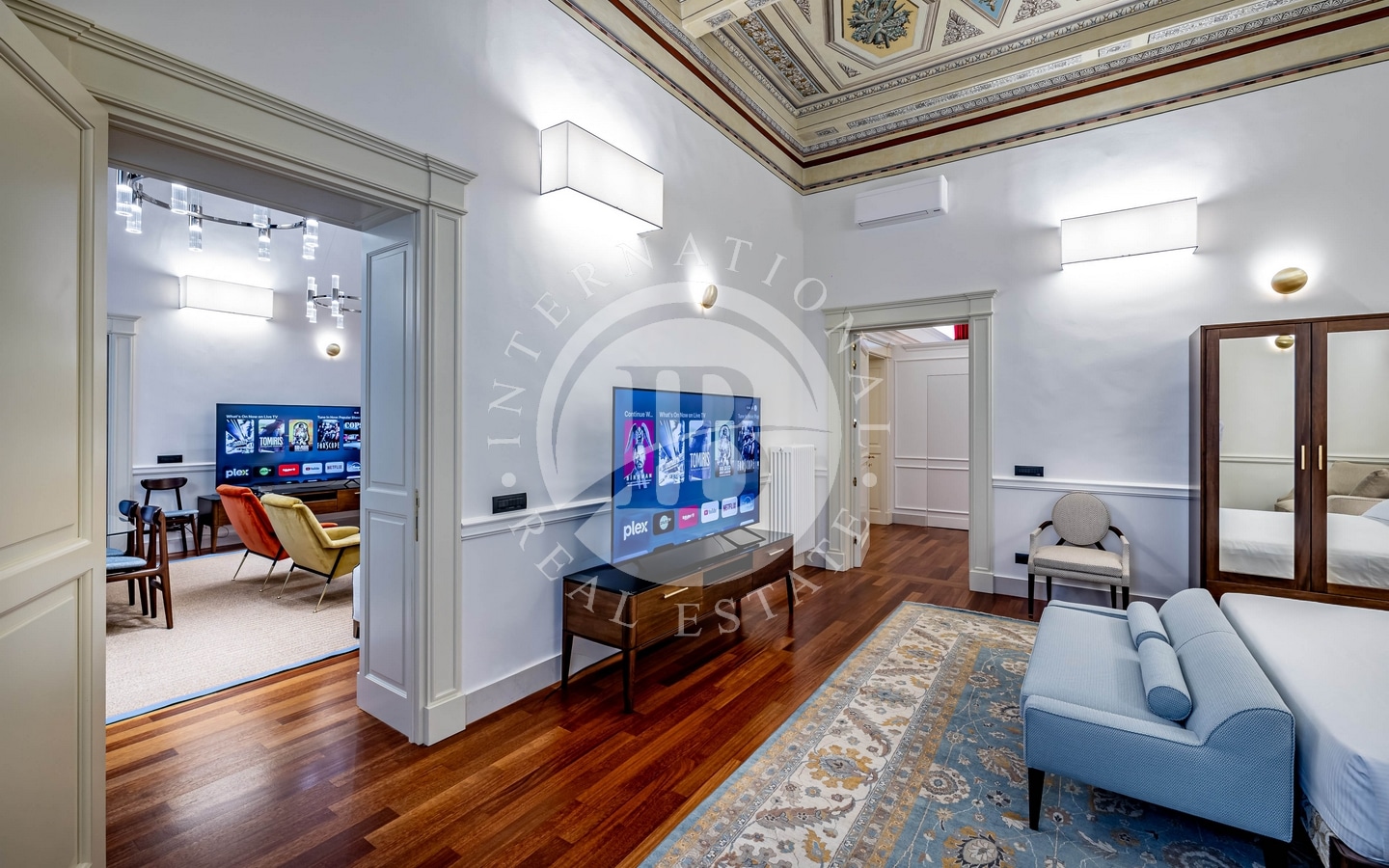 Gli interni di questo appartamento di lusso sono un raffinato equilibrio tra tradizione e innovazione. Il salone affrescato è un omaggio alla grandezza storica di Firenze, mentre i due soggiorni e la sala da pranzo offrono spazi ampi e luminosi per accogliere ospiti con stile. Le quattro camere da letto, ognuna arredata con eleganza e materiali pregiati, garantiscono il massimo comfort. Sette bagni, tra cui due di servizio, presentano finiture moderne di alta qualità. Due cucine attrezzate completano l'offerta, rendendo questo appartamento ideale per chi cerca una residenza di prestigio nel cuore della città.