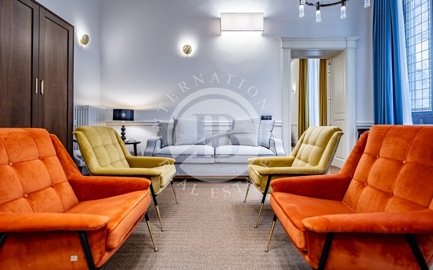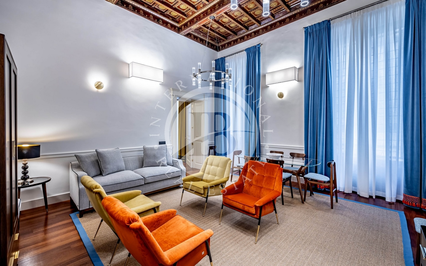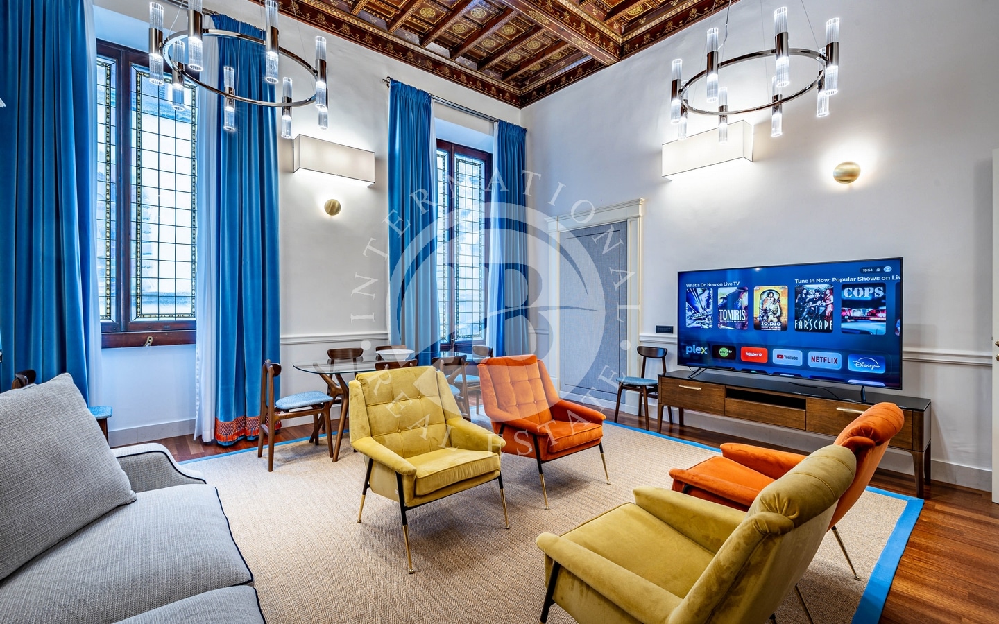 La ristrutturazione di alto livello ha saputo conservare dettagli storici unici, come i soffitti affrescati e a cassettoni, combinandoli con comfort e dettagli moderni come pavimento in parquet e bagni in marmo. L'appartamento è dotato di aria condizionata, caldaia a condensazione, impianto antenna parabolica e wifi, garantendo un'esperienza abitativa completa e senza compromessi. Con un doppio ingresso, l'accesso alla proprietà è comodo e funzionale, ideale anche per chi cerca discrezione e privacy.