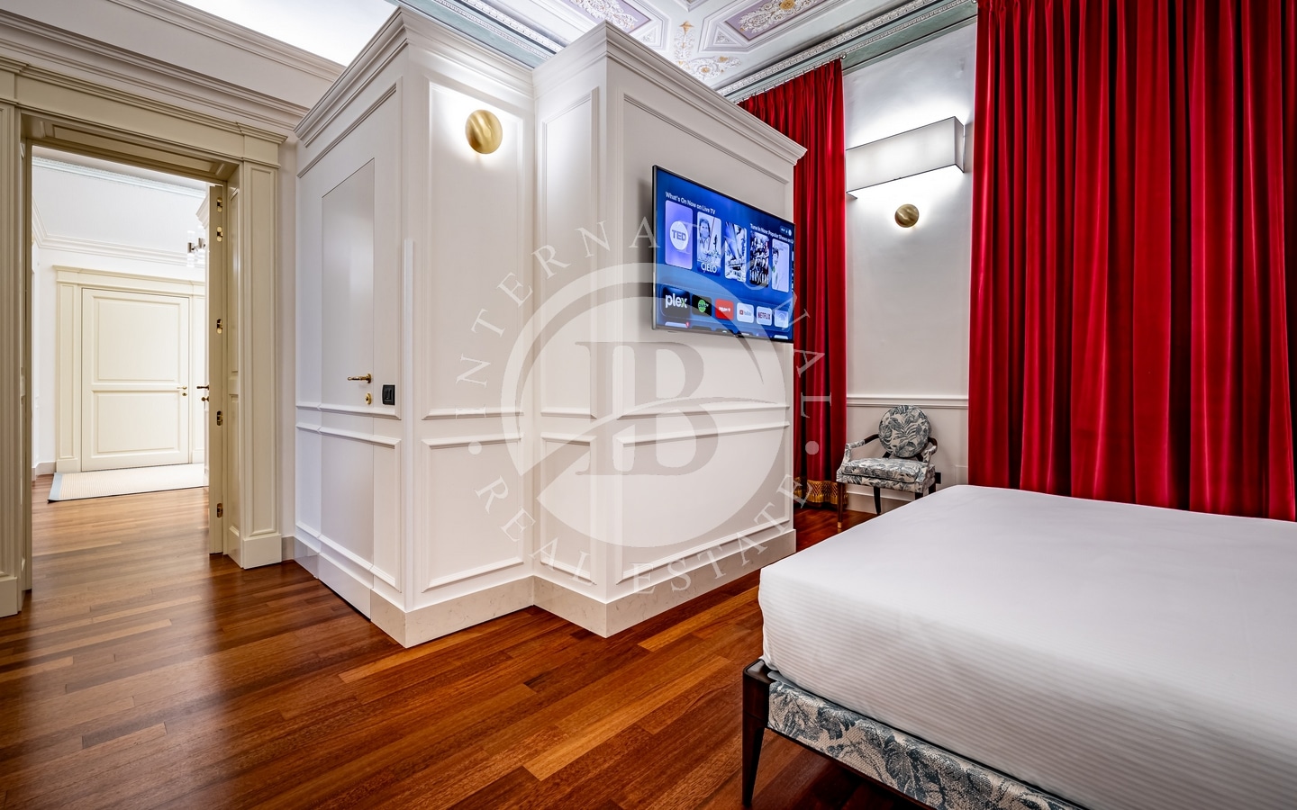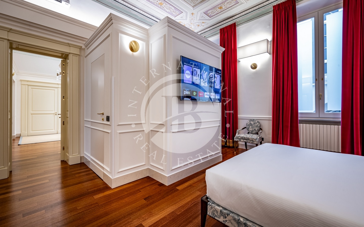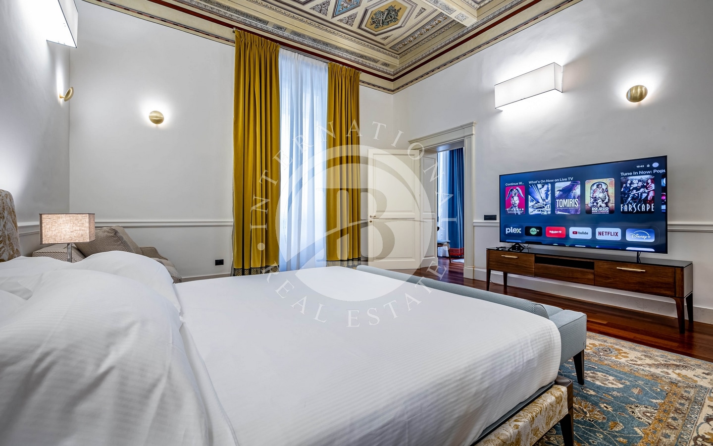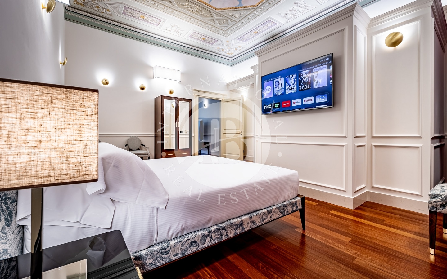 La ristrutturazione di alto livello ha saputo conservare dettagli storici unici, come i soffitti affrescati e a cassettoni, combinandoli con comfort e dettagli moderni come pavimento in parquet e bagni in marmo. L'appartamento è dotato di aria condizionata, caldaia a condensazione, impianto antenna parabolica e wifi, garantendo un'esperienza abitativa completa e senza compromessi.