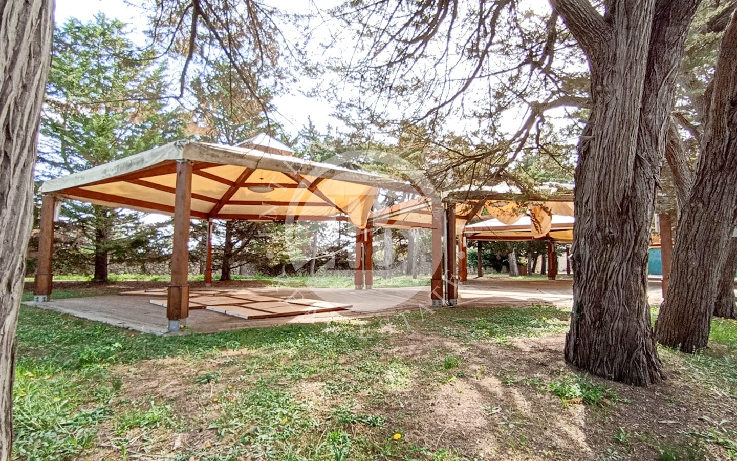 Il complesso è immerso in un parco di 13 ettari, con ampie vallate che circondano la villa su tre lati: est, ovest e sud. Oltre alla residenza principale, il parco ospita vari edifici secondari, tra cui stalle, trulli e una vecchia serra fredda ormai in disuso. Il viale principale, fiancheggiato da imponenti pini, conduce alla villa, mentre nei viali minori trovano posto numerose specie arboree, tra cui lecci, cipressi, eucalipti, platani e lauri.