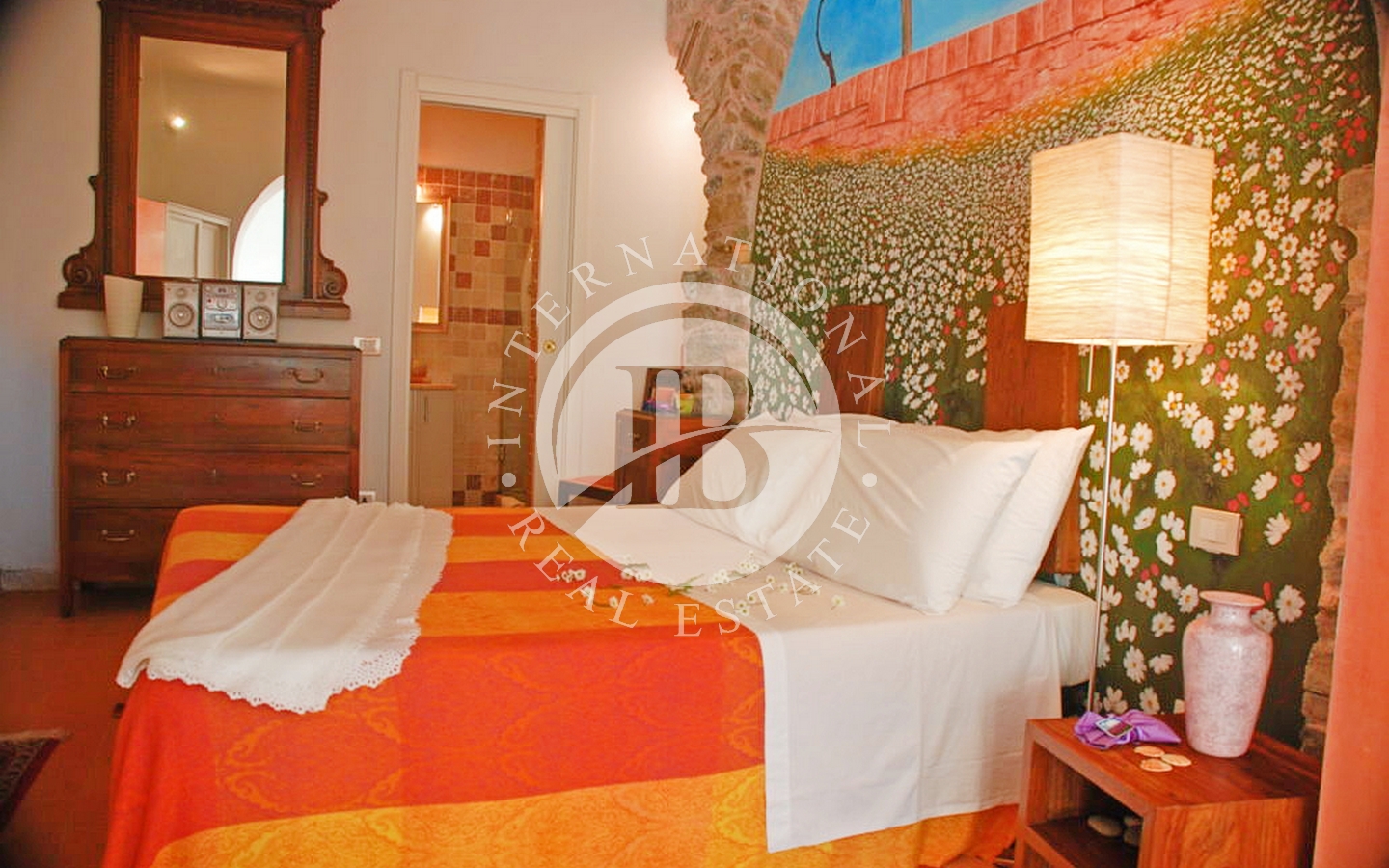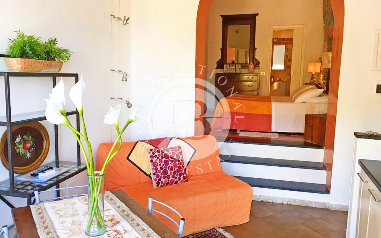 Salendo due scalini, alla destra della cucina si trova la camera da letto matrimoniale con accesso diretto al bagno con doccia.