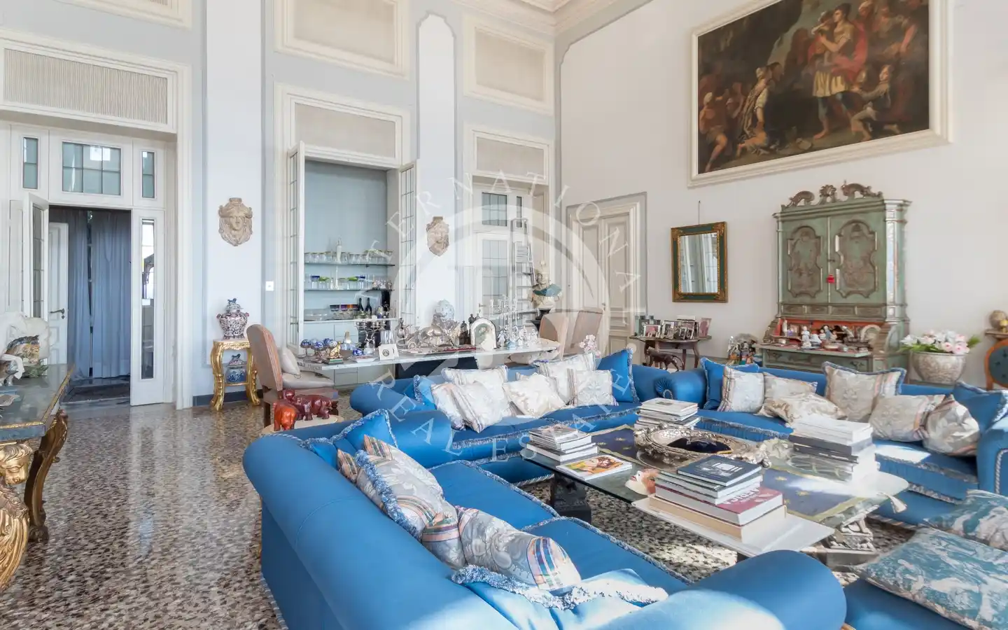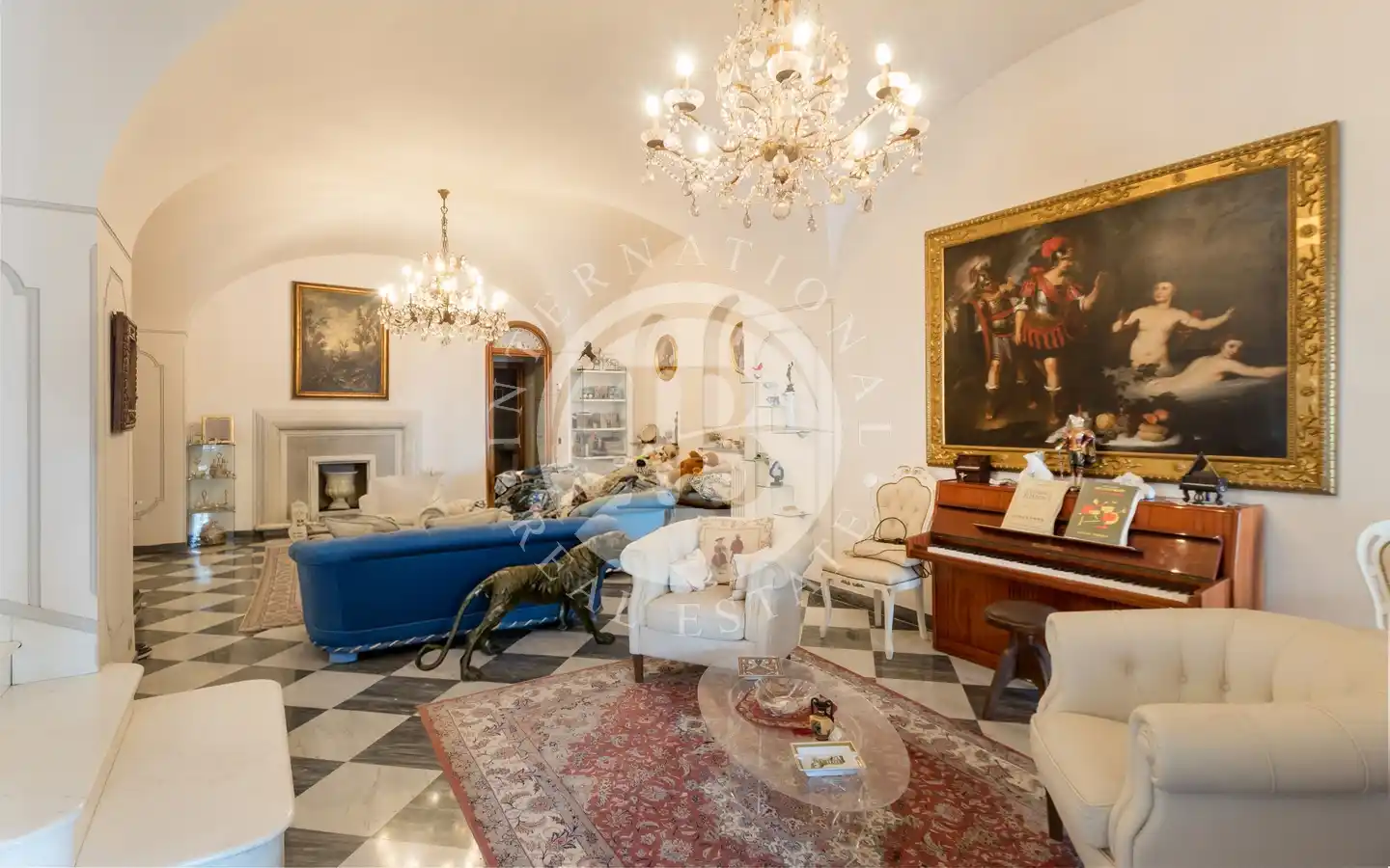 Al piano superiore è situato un maestoso salone affrescato con vista mare aperto su una splendida terrazza panoramica, due camere da letto, due bagni e al piano inferiore un’ampia zona living, sala da pranzo grande cucina e altri due bagni, un locale tecnico, uno spazioso ripostiglio oltre a un importante ingresso porticato.
