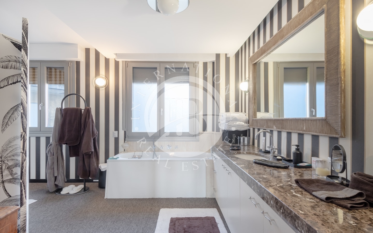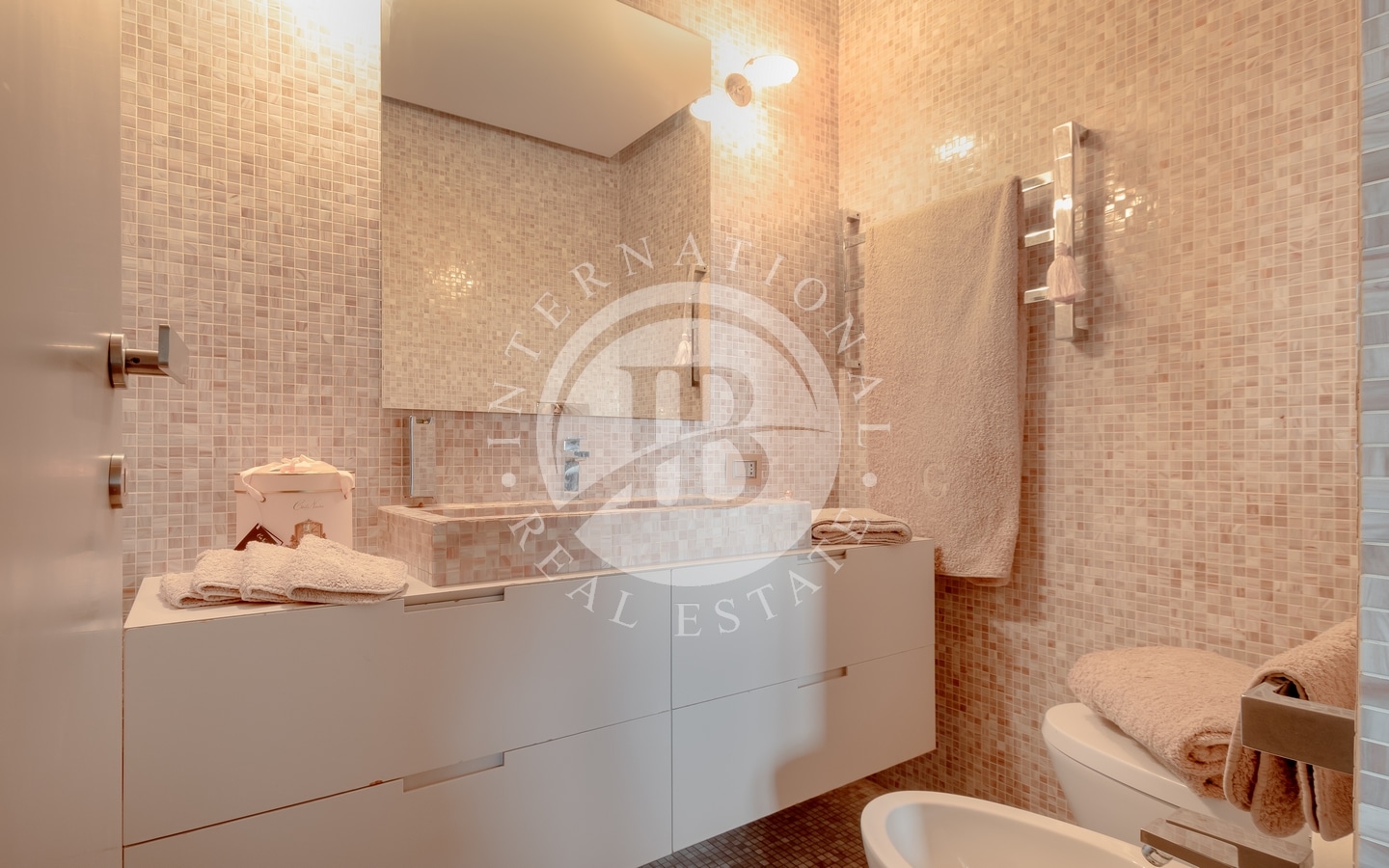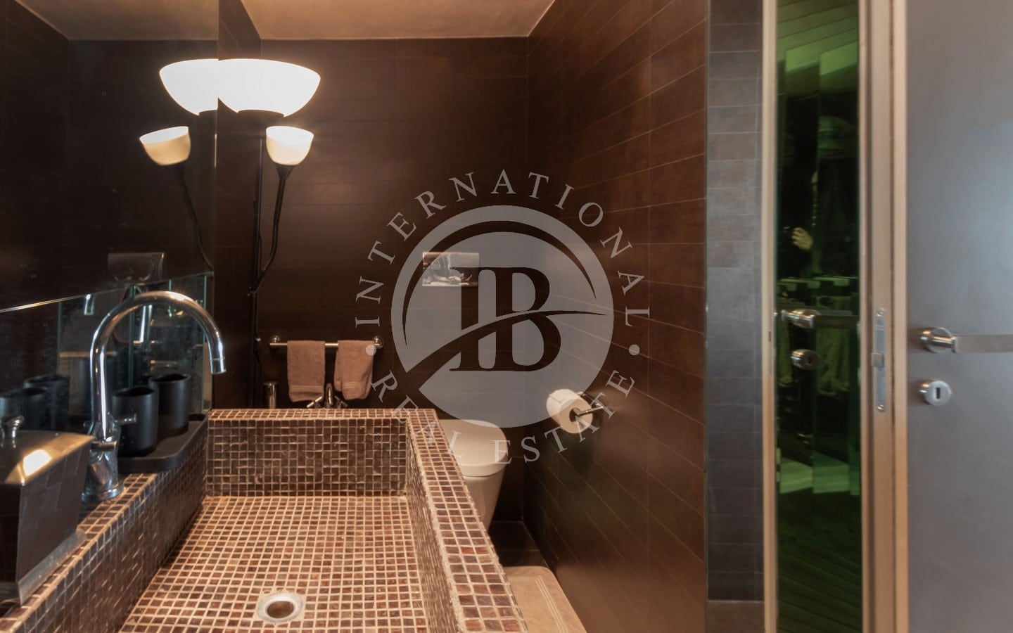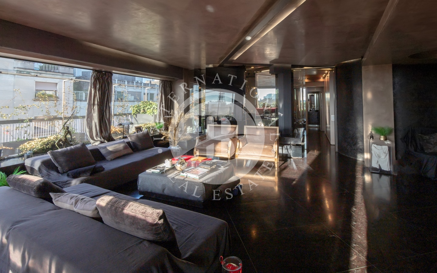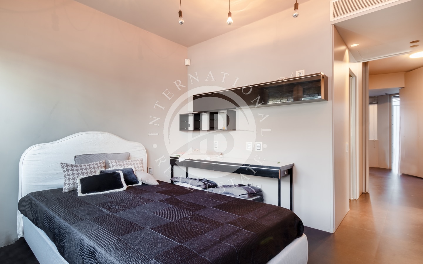 L’ingresso si apre su un ampio salone dal design contemporaneo, che collega in modo armonioso le varie stanze della casa. L’appartamento dispone di cinque camere da letto, cinque bagni e due cucine attrezzate, offrendo una distribuzione degli spazi funzionale e versatile.