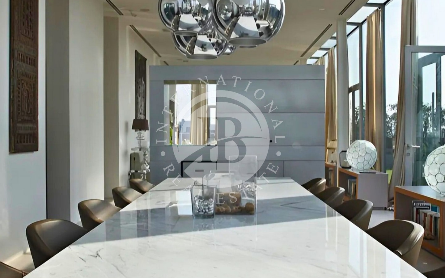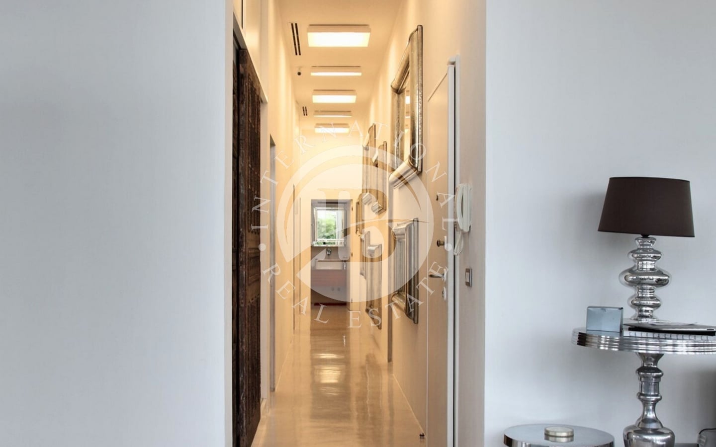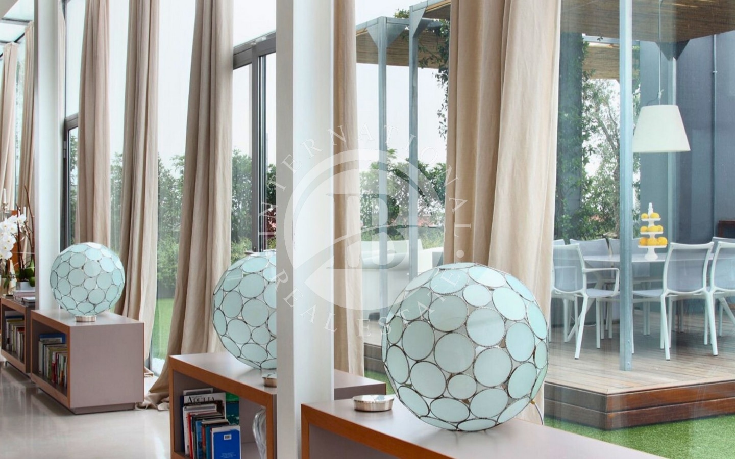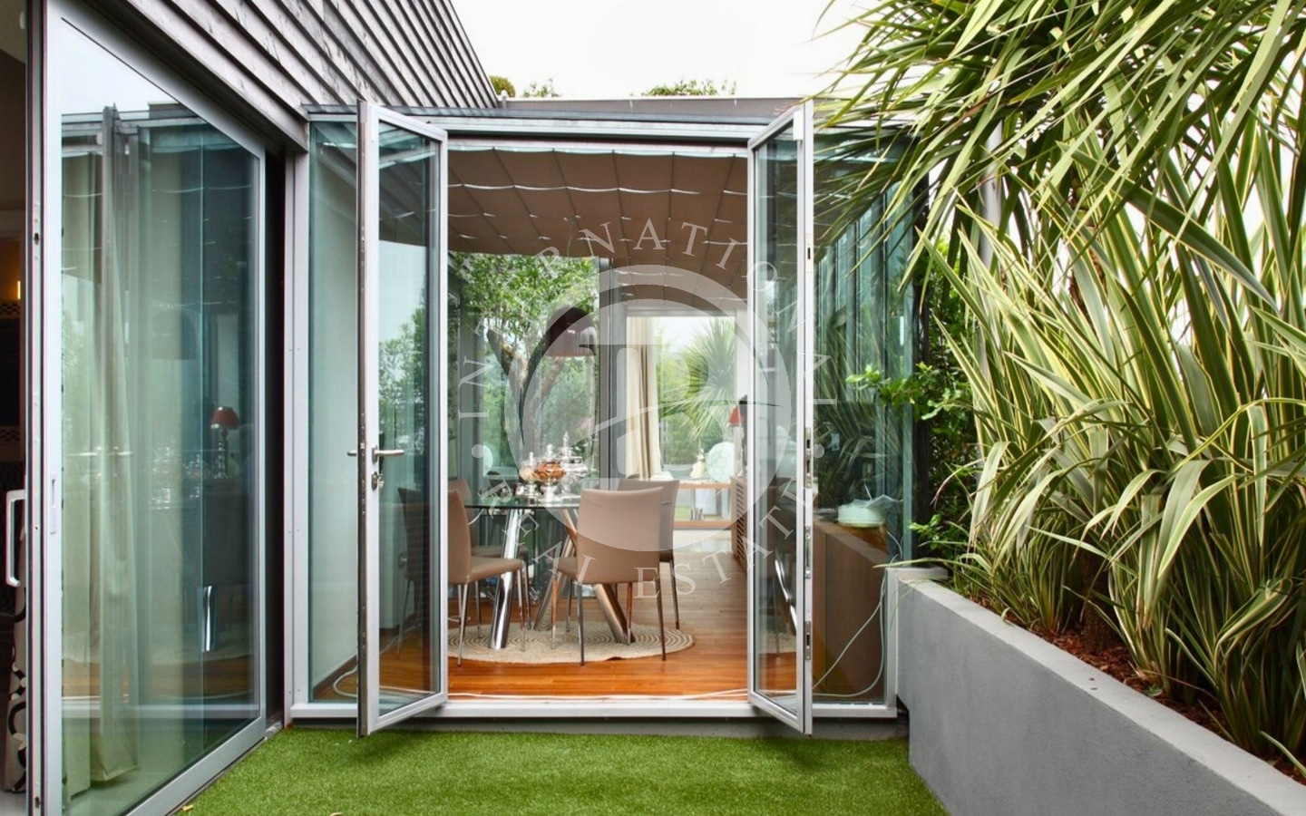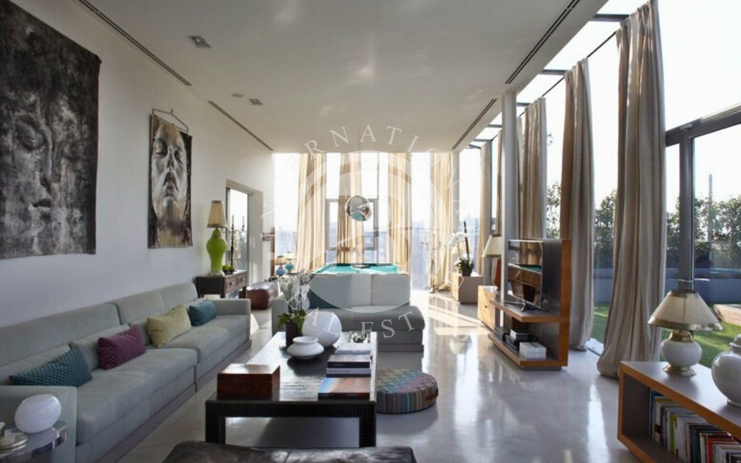 L’abitazione si sviluppa su una superficie di 320 mq interni, circondata da 250 mq di terrazze che abbracciano tre lati della casa. Varcando l’ingresso, si accede a un’ampia zona living:le ampie vetrate a tutta altezza permettono alla luce naturale di inondare lo spazio e creano una continuità visiva con l’esterno. L’area giorno è articolata in tre zone distinte: un confortevole soggiorno, una sala da pranzo e una raffinata area dedicata al biliardo. Da qui si accede a una splendida terrazza, dove un accogliente patio ospita un salotto all’aperto, una zona pranzo perfetta per ricevimenti e una vasca idromassaggio.