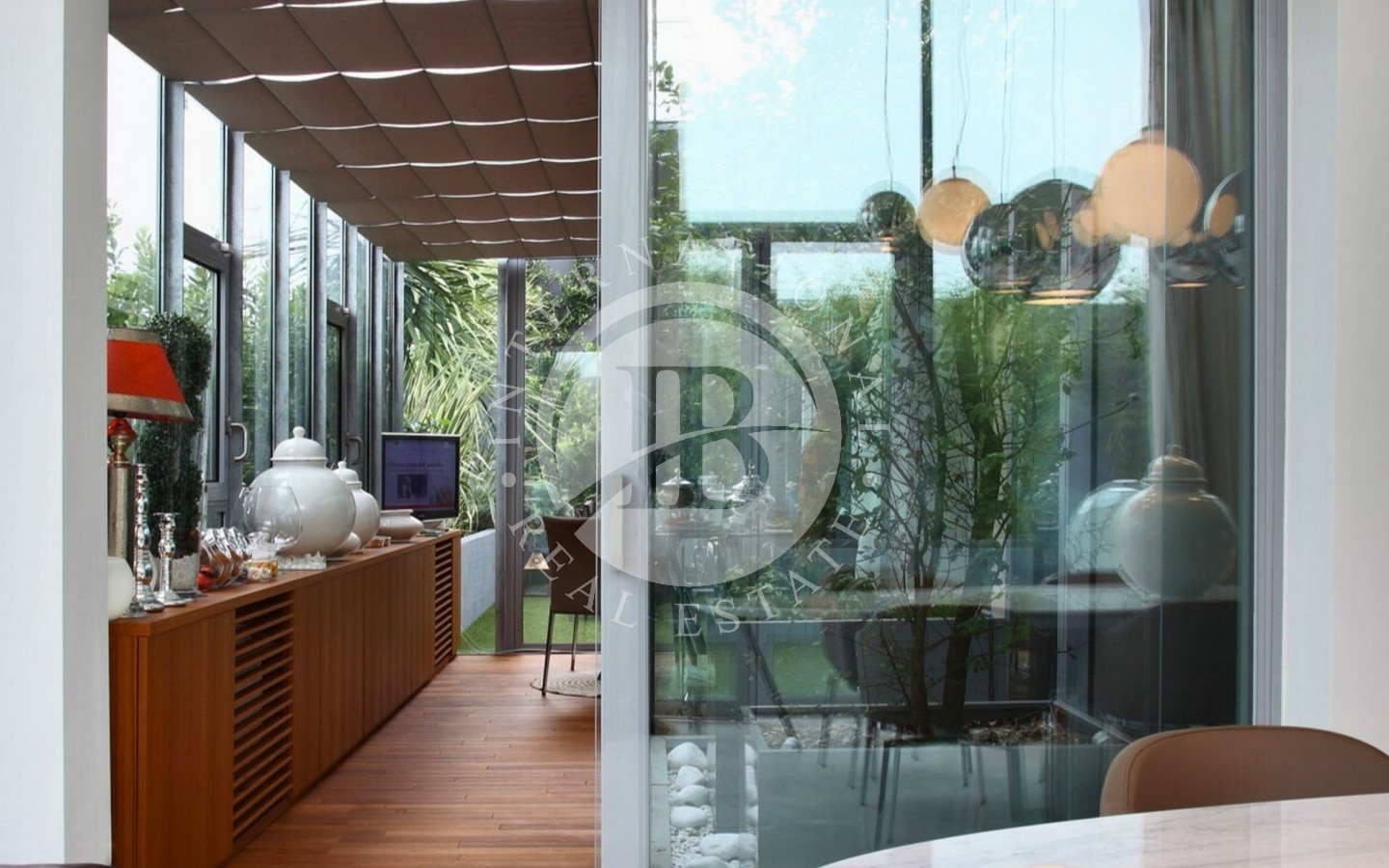Dalla sala da pranzo principale si accede alla cucina, moderna e ben organizzata, con una grande isola centrale. La cucina si collega a una seconda sala da pranzo situata in una terrazza verandata, che offre uno spazio ideale per pranzi e cene in ogni stagione dell’anno.
