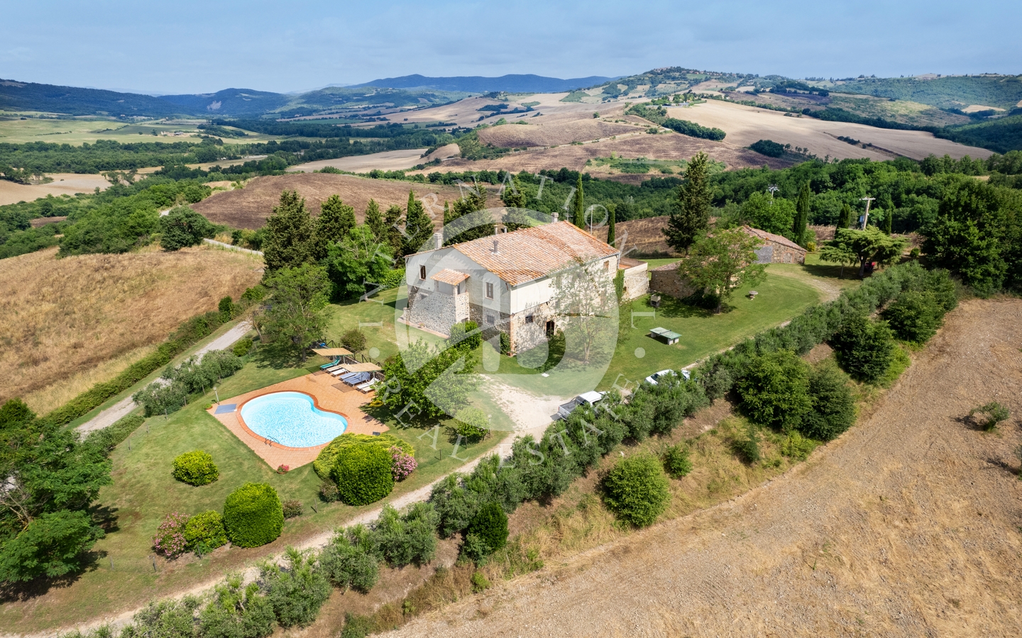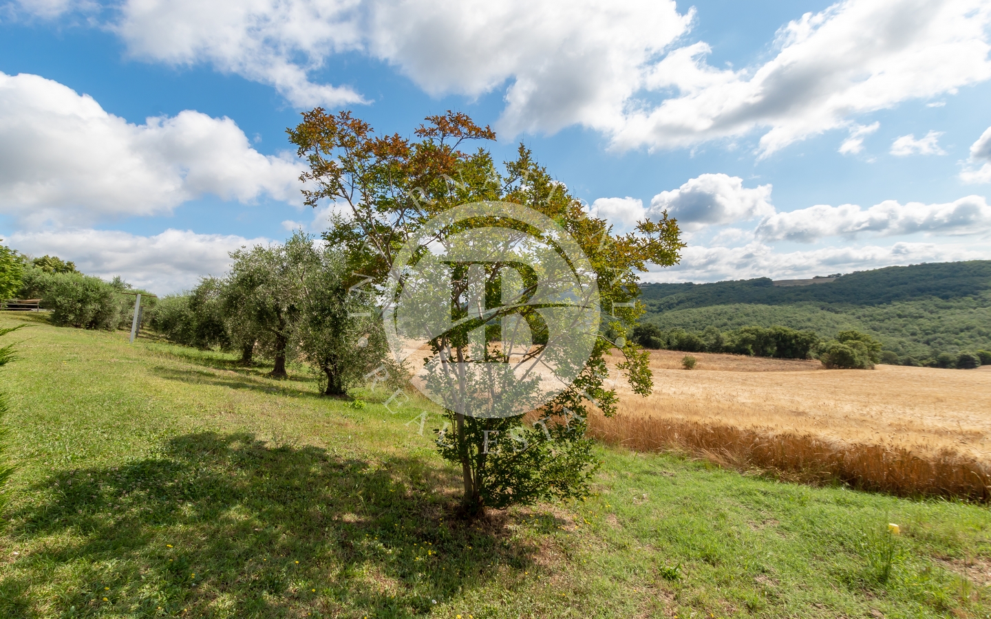 L’intera proprietà si trova immersa in 165 ettari di terreno, di cui 135 adibiti a produzione di grano, tutti percorribili anche con fuoristrada e/o mezzi agricoli e che ospitano un lago utile all’irrigazione.