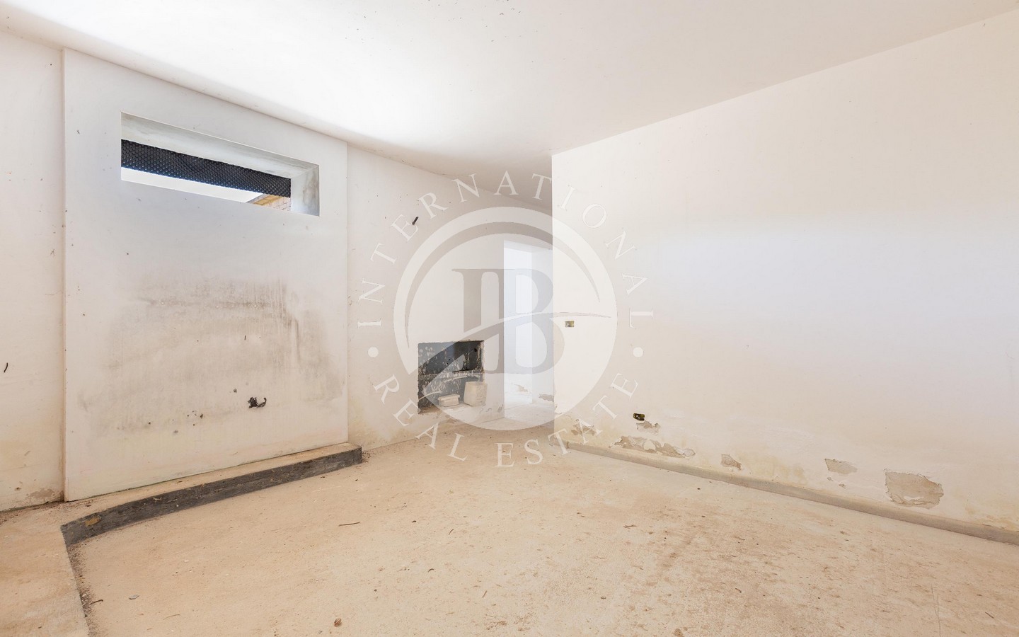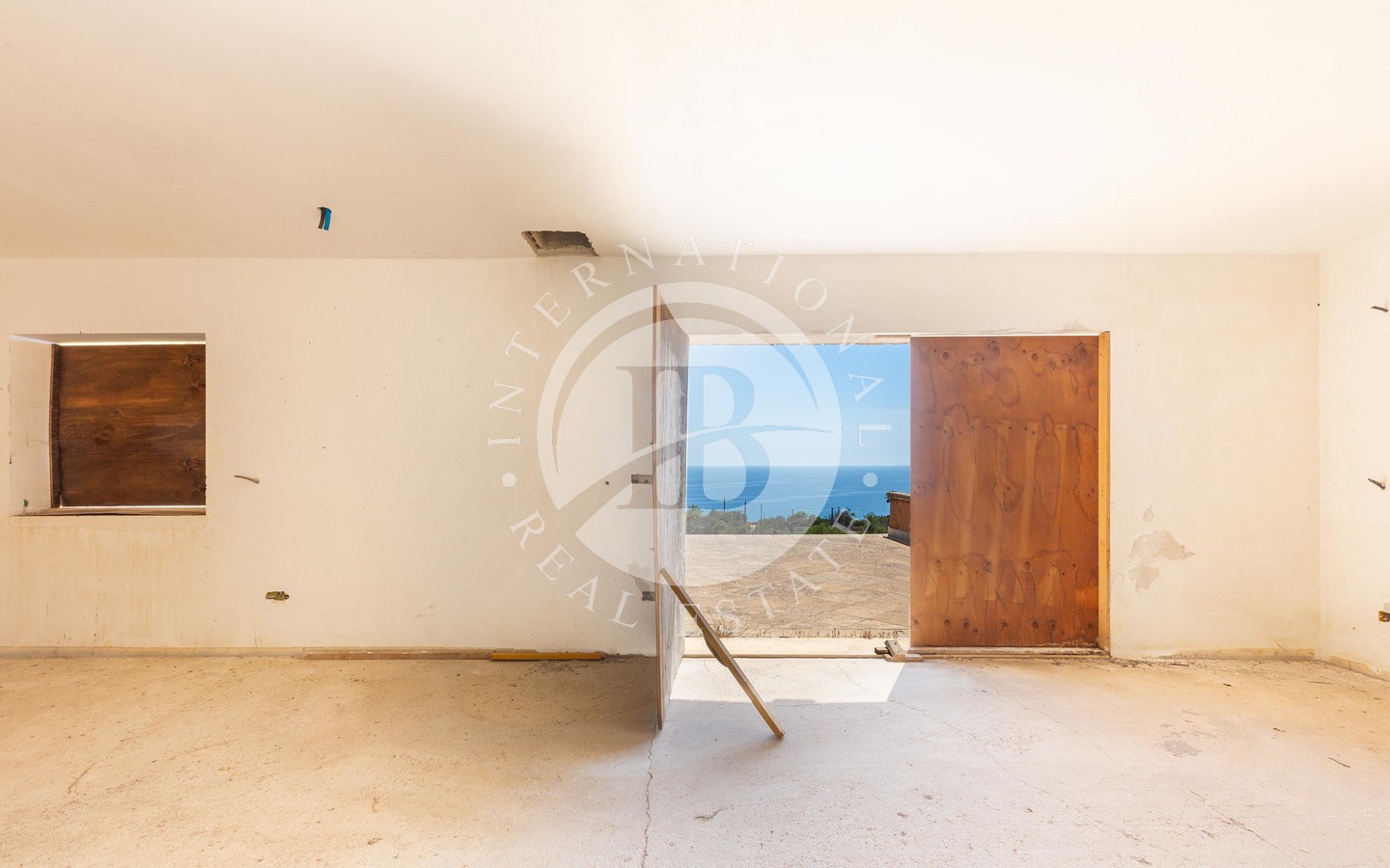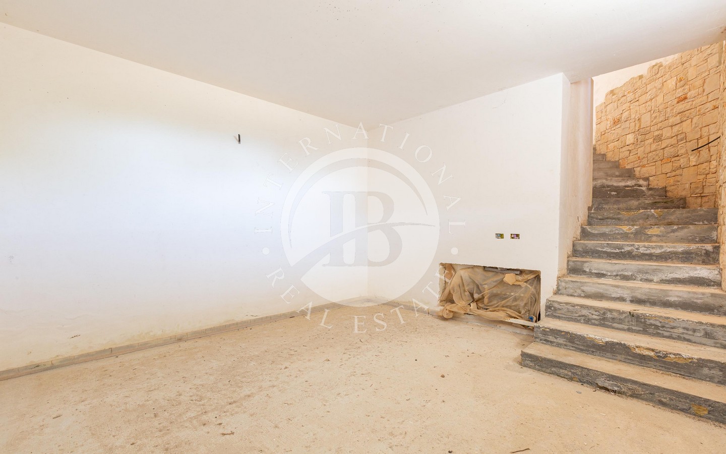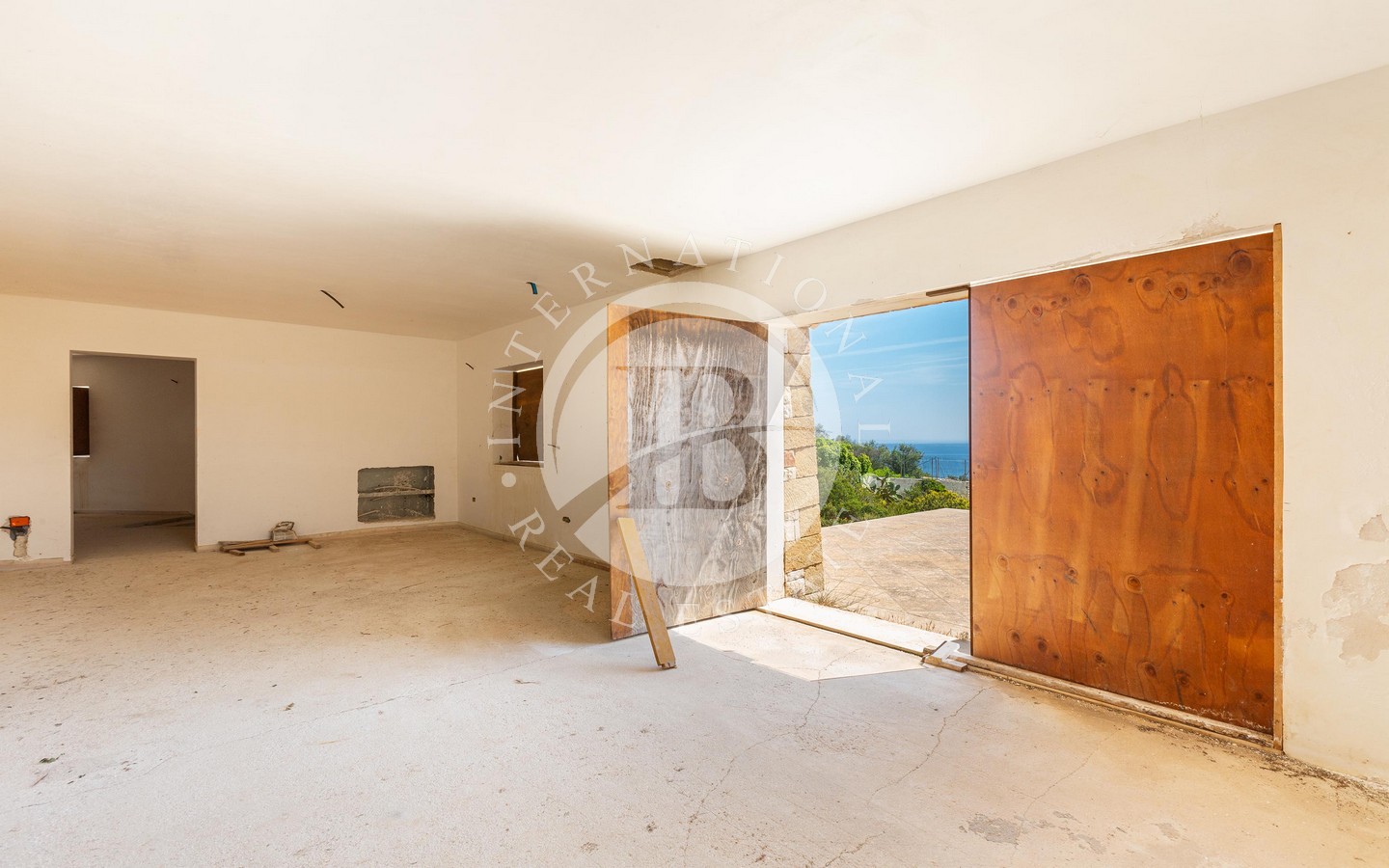 La villa si sviluppa su due livelli, con un design che unisce tradizione e modernità. Al piano superiore, l'ampia zona giorno si apre su un terrazzo con vista mare, comprendendo un luminoso soggiorno, un bagno di servizio, un angolo cucina e uno spazioso living. Le scale interne conducono al piano inferiore, dove si trova la zona notte con una master bedroom dotata di cabina armadio e bagno en suite, una camera doppia, un bagno completo e un'area relax trasformabile in una terza camera da letto. Gli interni, pur essendo in stato rustico avanzato, sono predisposti per un impianto di riscaldamento e raffrescamento a pavimento, garantendo comfort tutto l'anno.