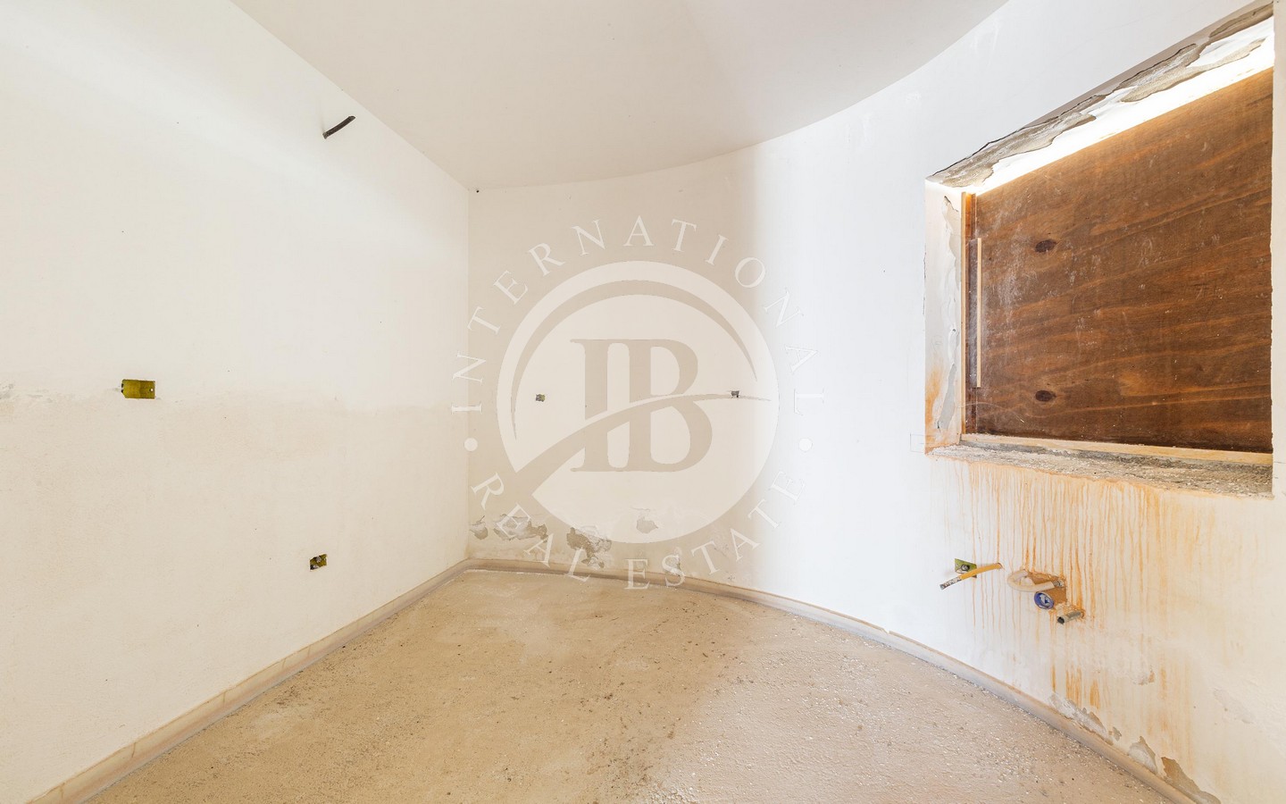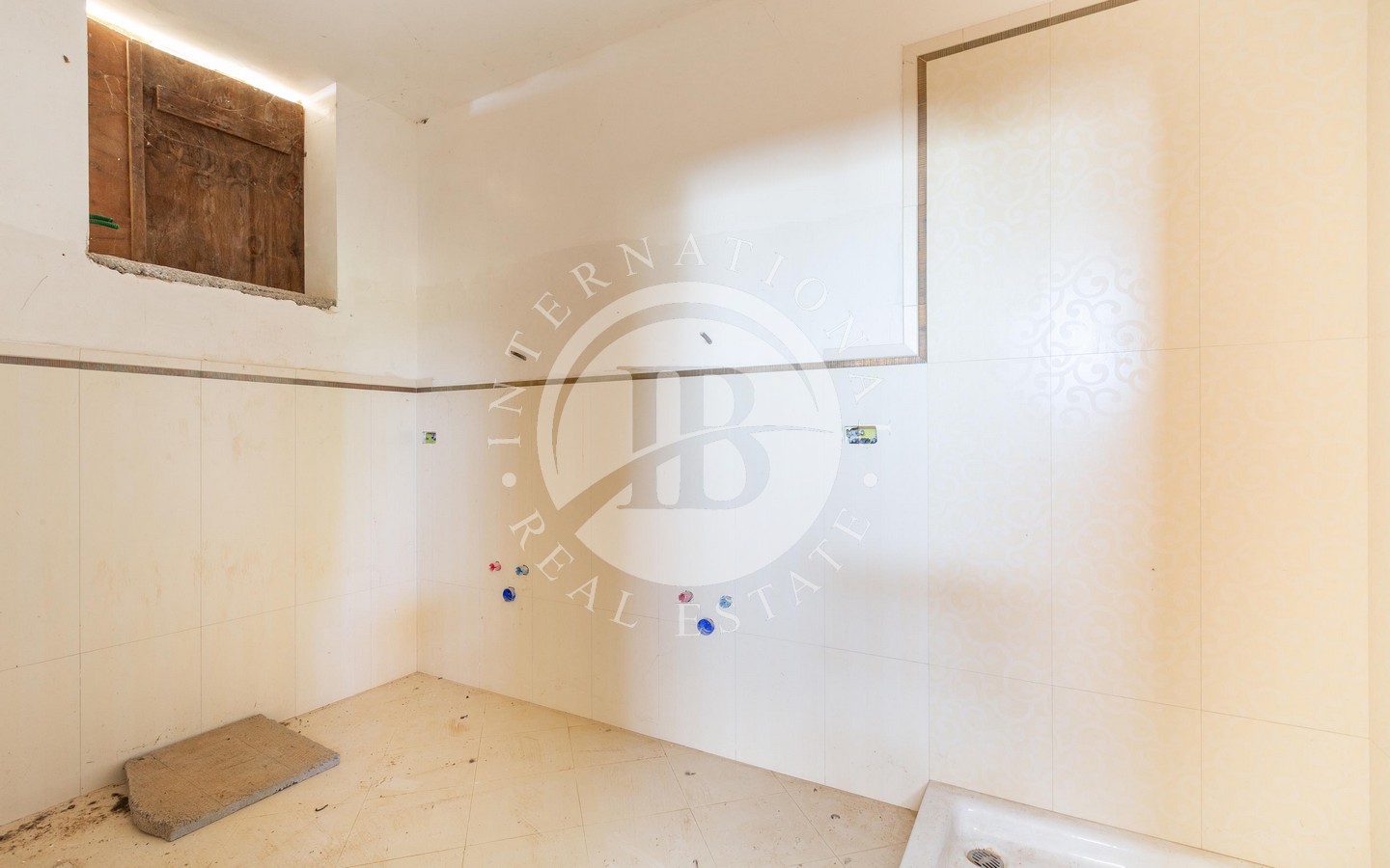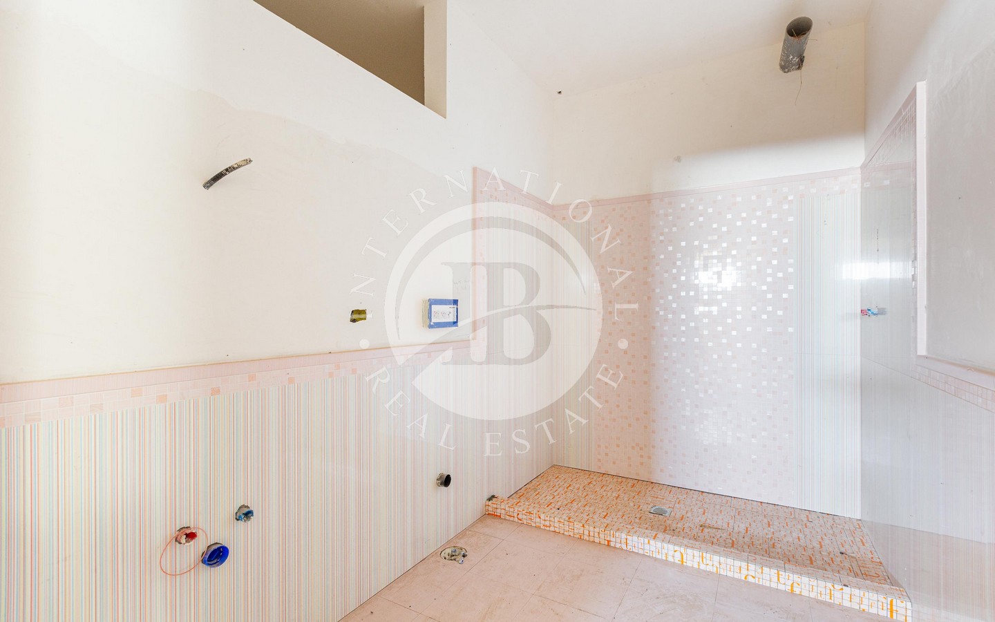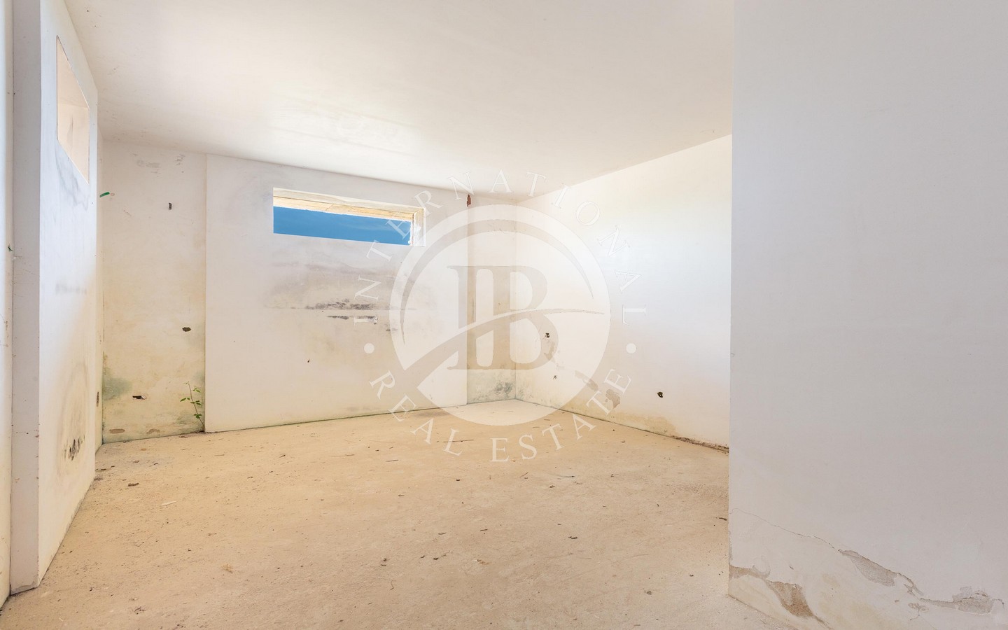 La villa si sviluppa su due livelli, con un design che unisce tradizione e modernità. Al piano superiore, l'ampia zona giorno si apre su un terrazzo con vista mare, comprendendo un luminoso soggiorno, un bagno di servizio, un angolo cucina e uno spazioso living. Le scale interne conducono al piano inferiore, dove si trova la zona notte con una master bedroom dotata di cabina armadio e bagno en suite, una camera doppia, un bagno completo e un'area relax trasformabile in una terza camera da letto. Gli interni, pur essendo in stato rustico avanzato, sono predisposti per un impianto di riscaldamento e raffrescamento a pavimento, garantendo comfort tutto l'anno.