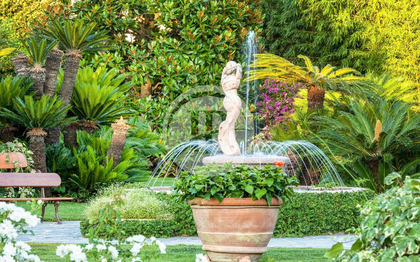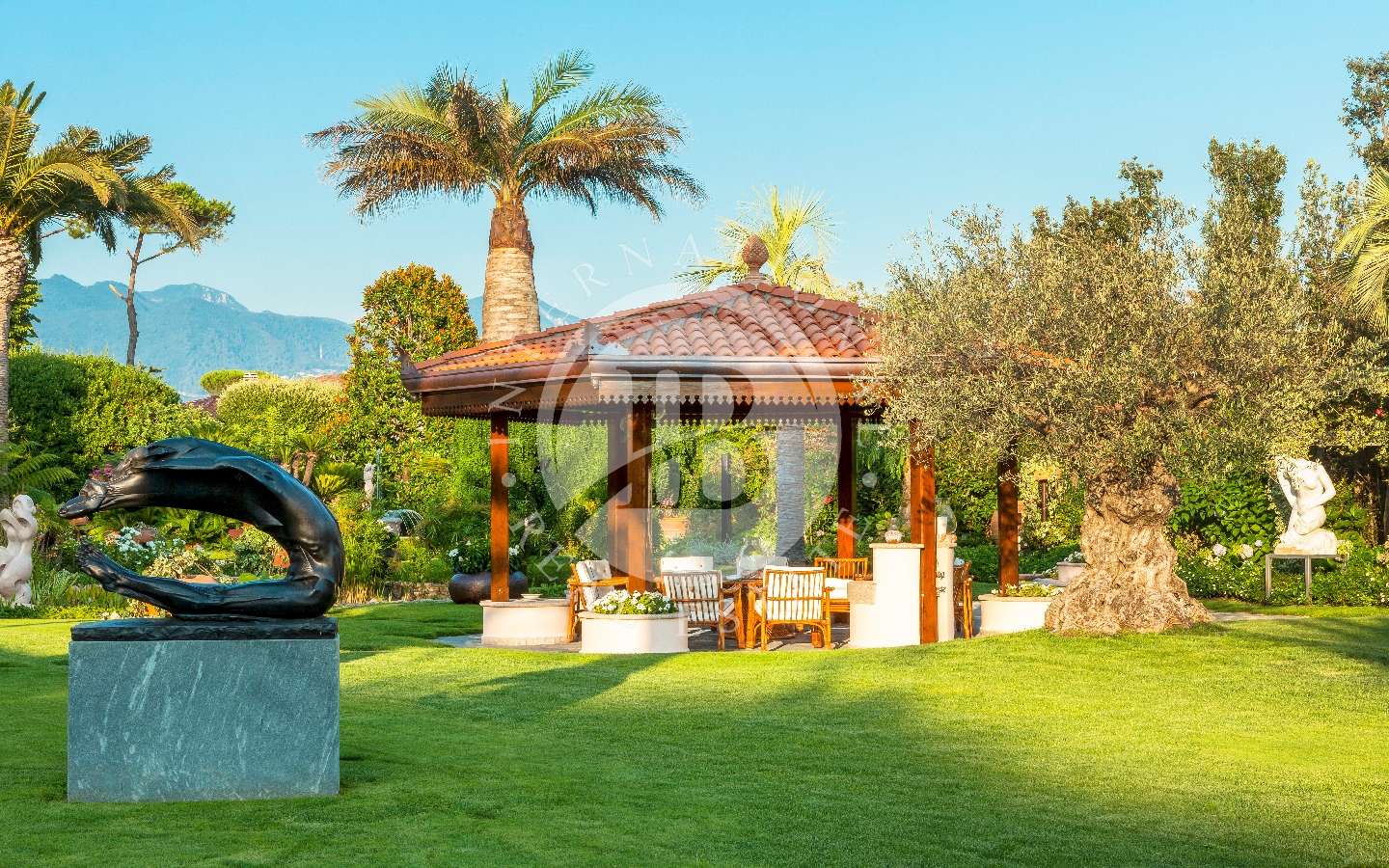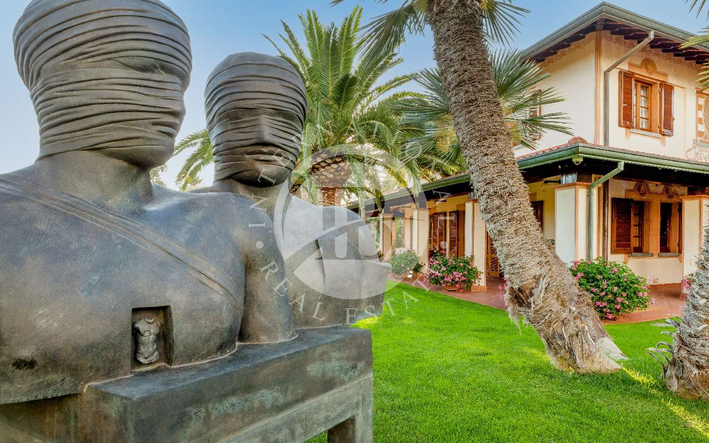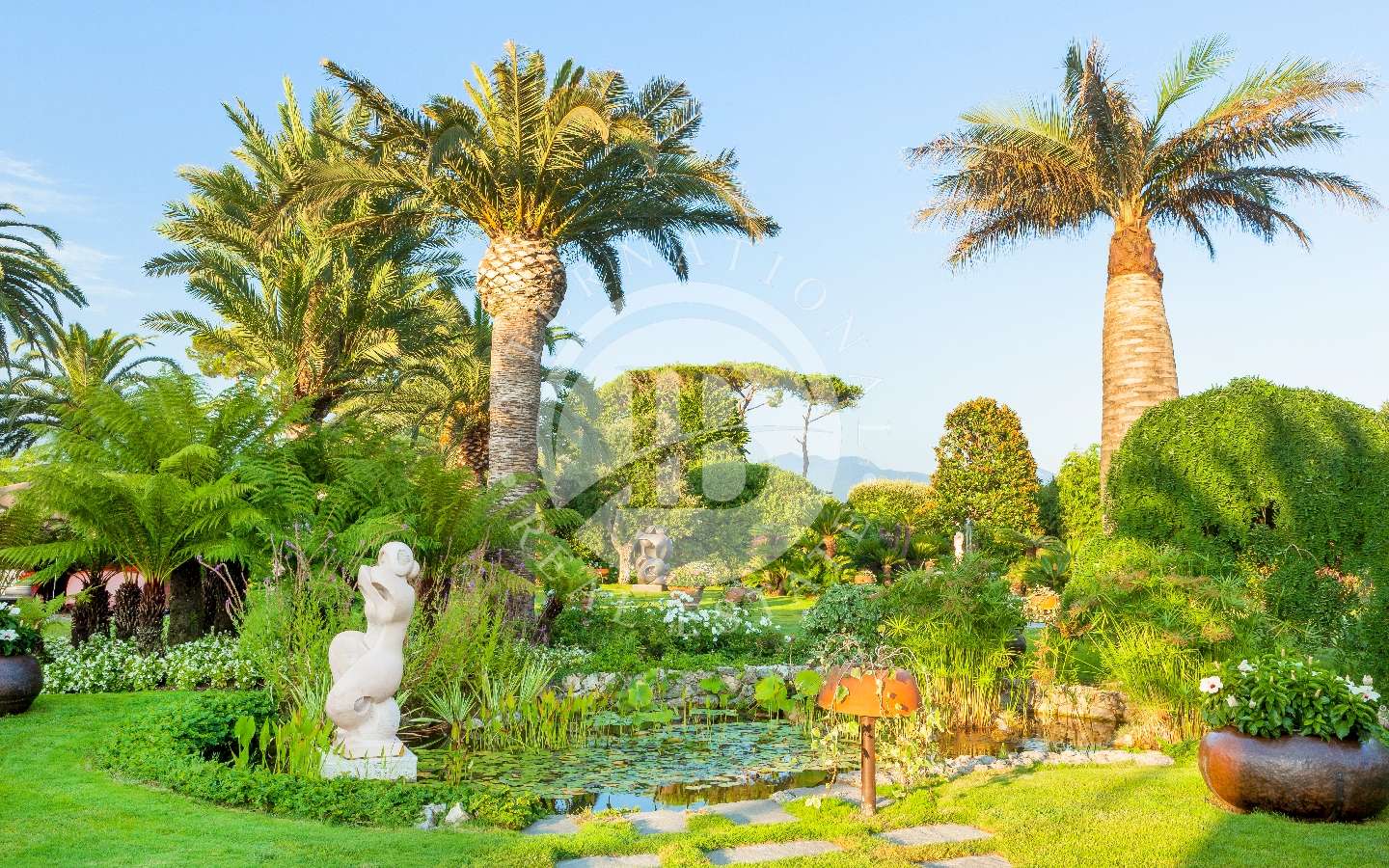 Il giardino privato che fa da nido alle proprietà, è caratterizzato da diverse opere scultoree di pregio, piante rare, palme, un laghetto, un gazebo in legno con area pranzo, e lo spazio per realizzare una piscina aggiuntiva. Completano l’area esterna vari posti auto coperti.
