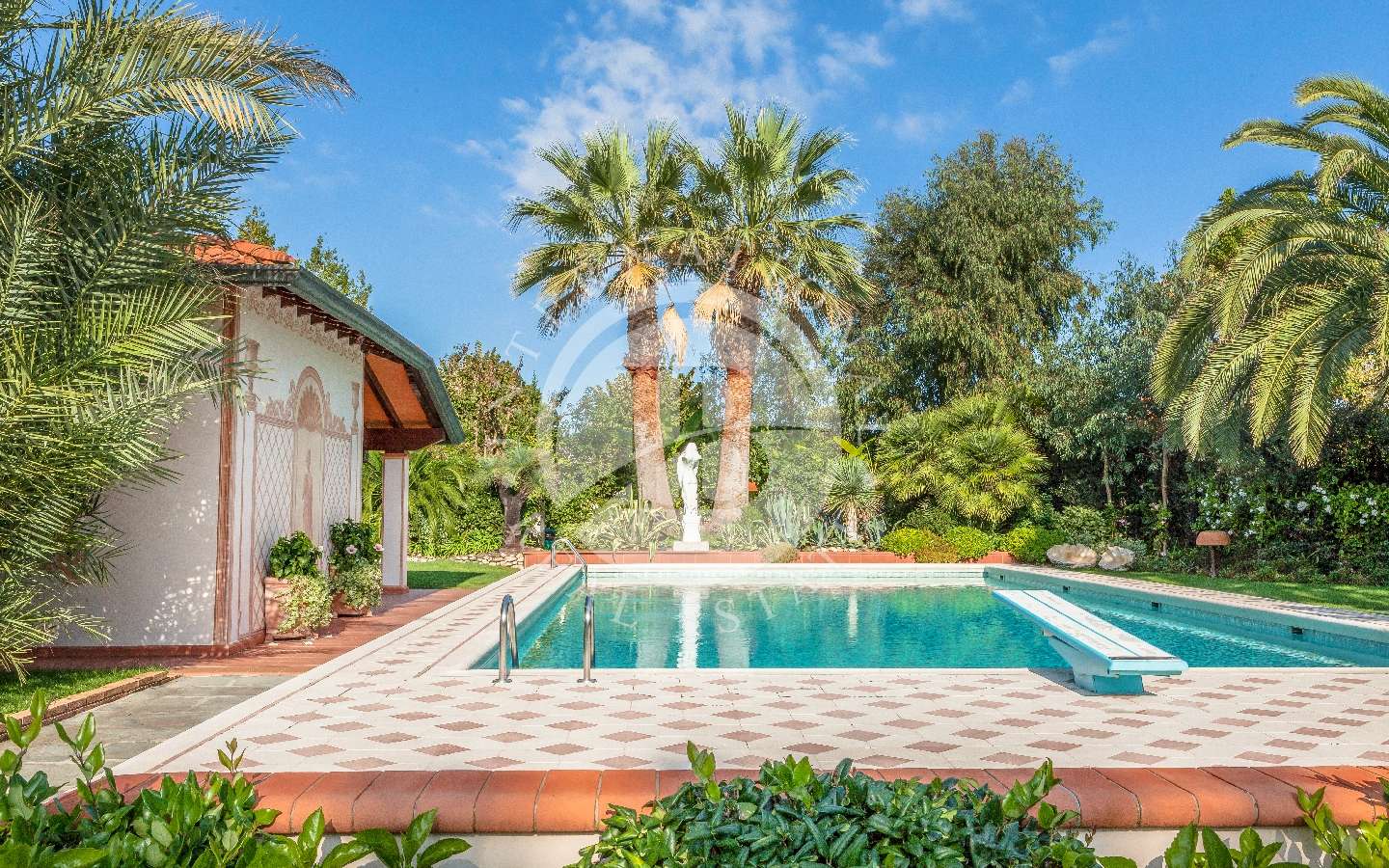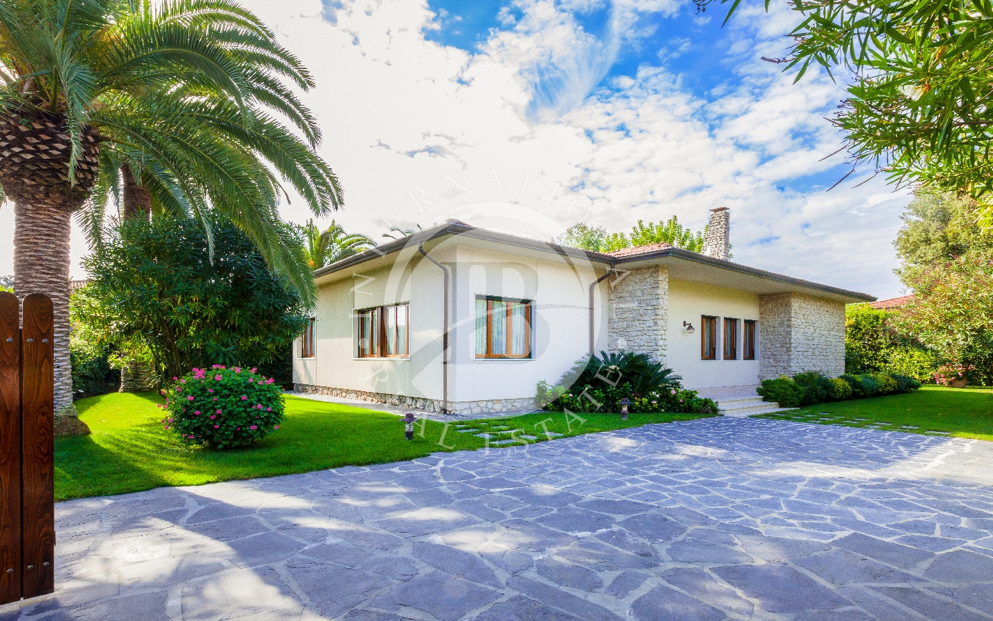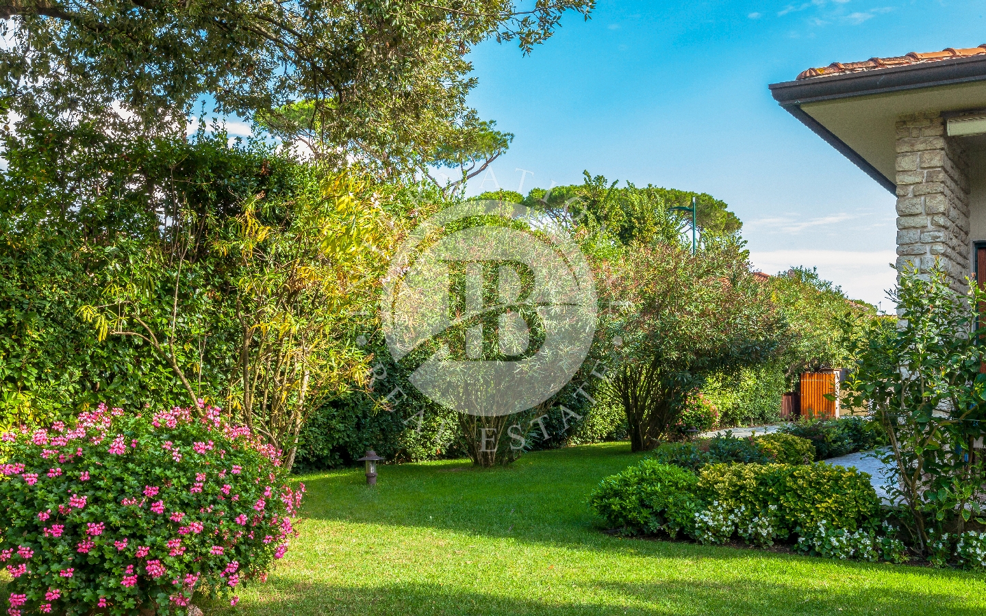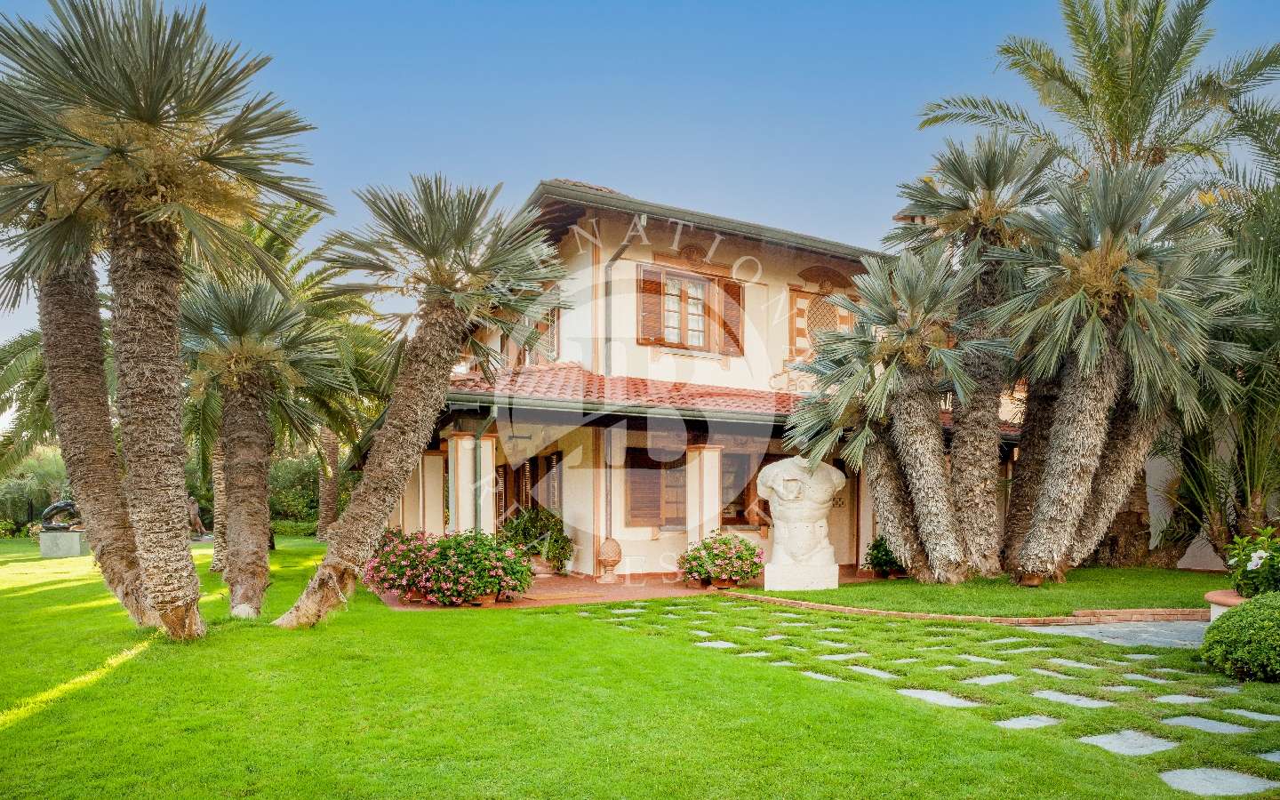 Il giardino privato che fa da nido alle proprietà, è caratterizzato da diverse opere scultoree di pregio, piante rare, palme, un laghetto, un gazebo in legno con area pranzo, e lo spazio per realizzare una piscina aggiuntiva. Completano l’area esterna vari posti auto coperti.