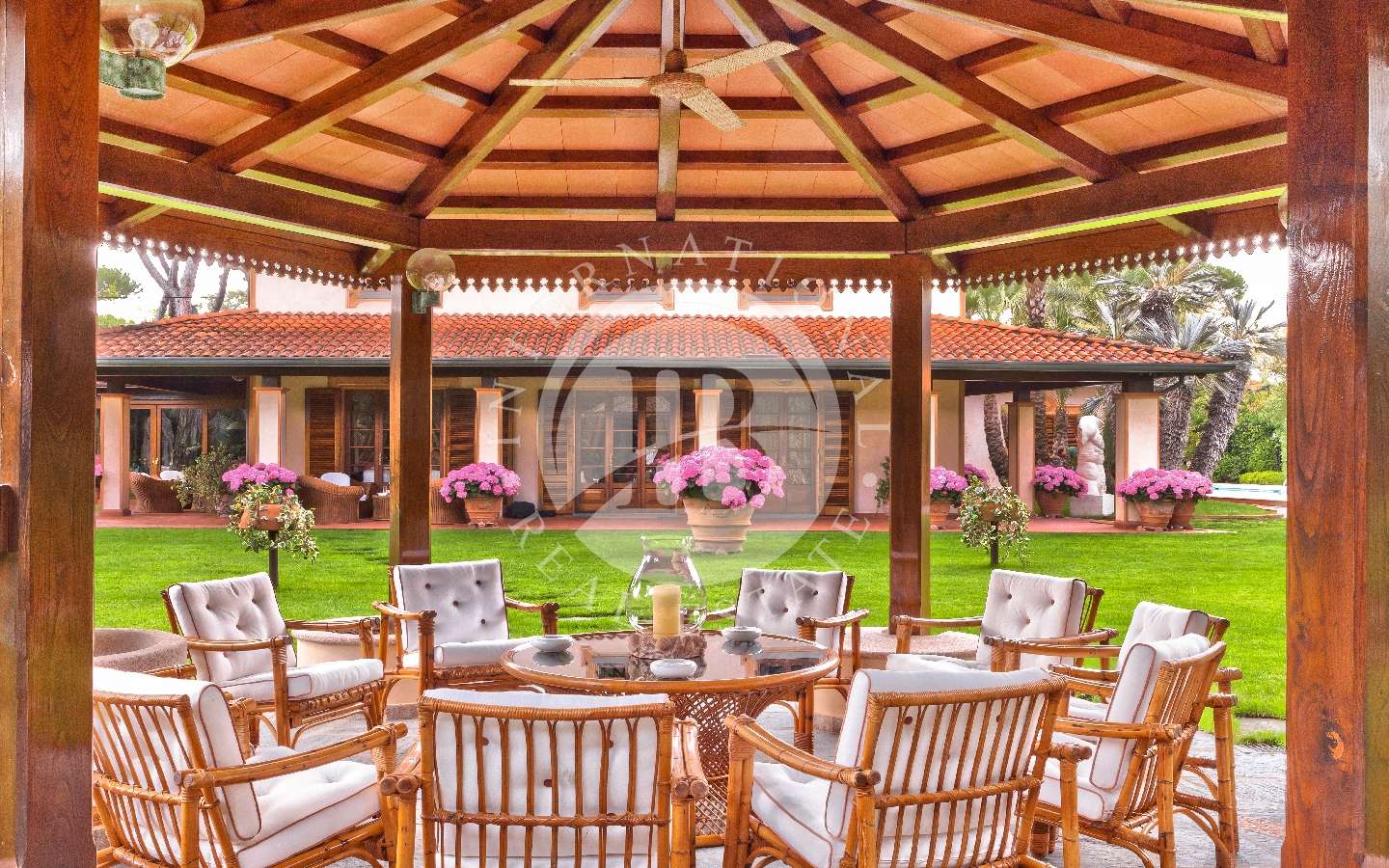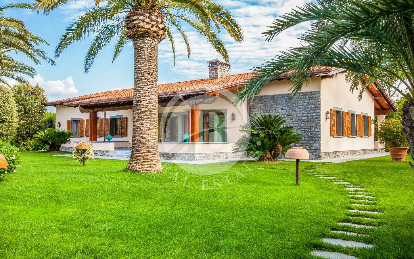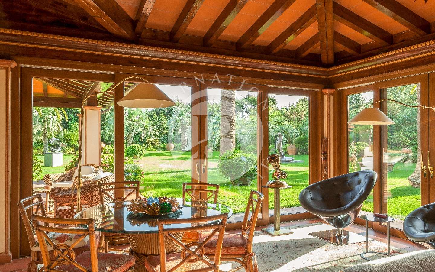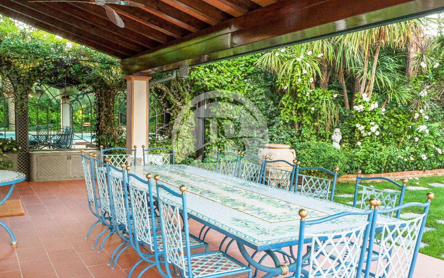 Il giardino privato che fa da nido alle proprietà, è caratterizzato da diverse opere scultoree di pregio, piante rare, palme, un laghetto, un gazebo in legno con area pranzo, e lo spazio per realizzare una piscina aggiuntiva. Completano l’area esterna vari posti auto coperti.