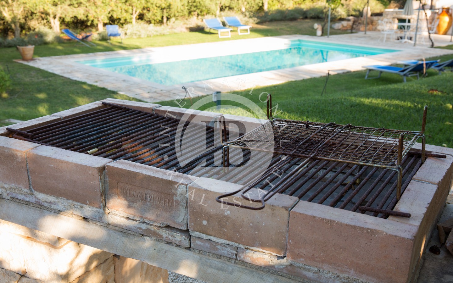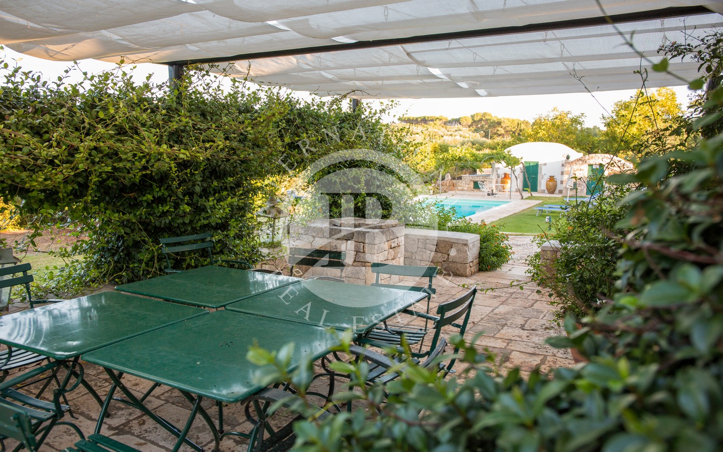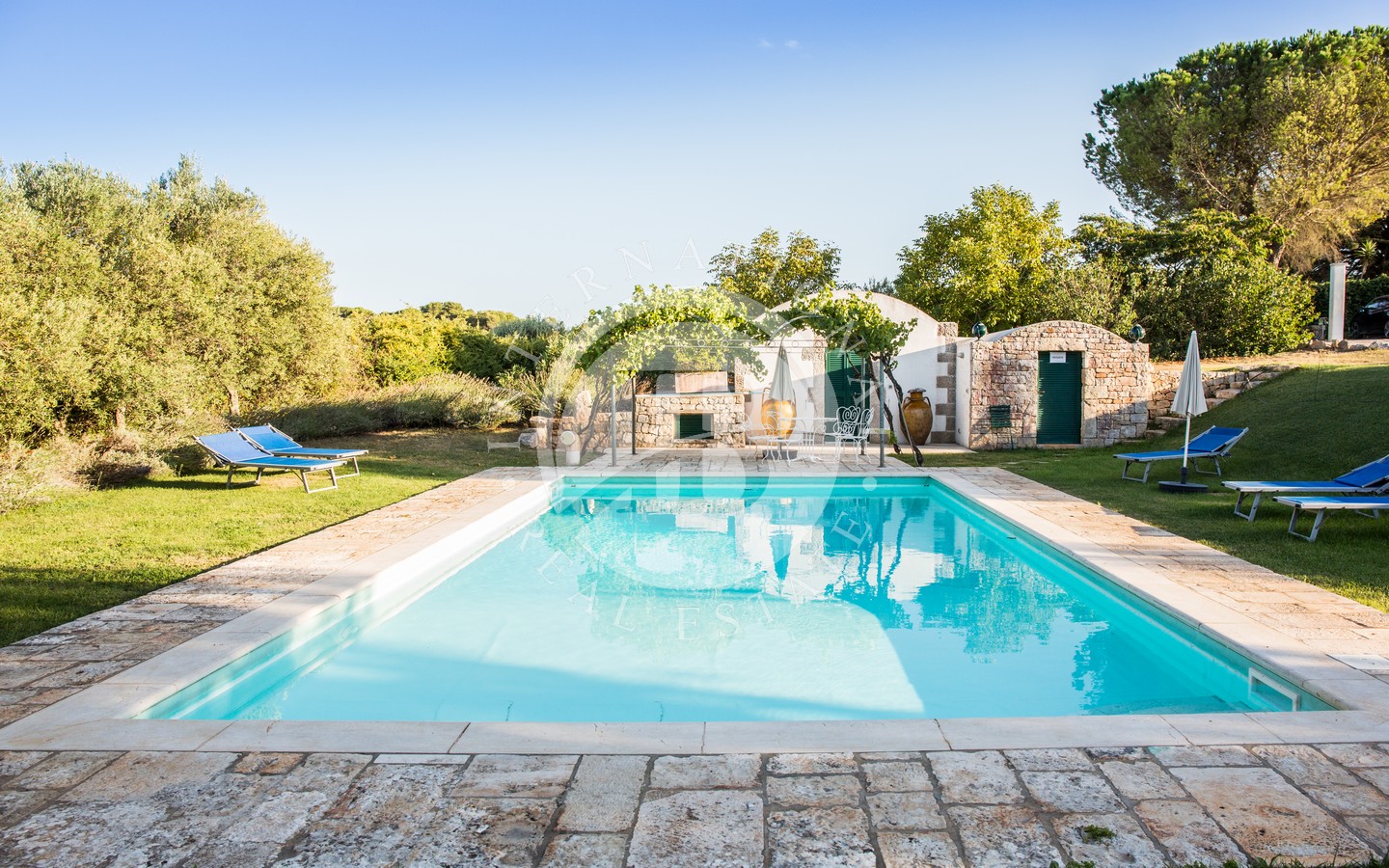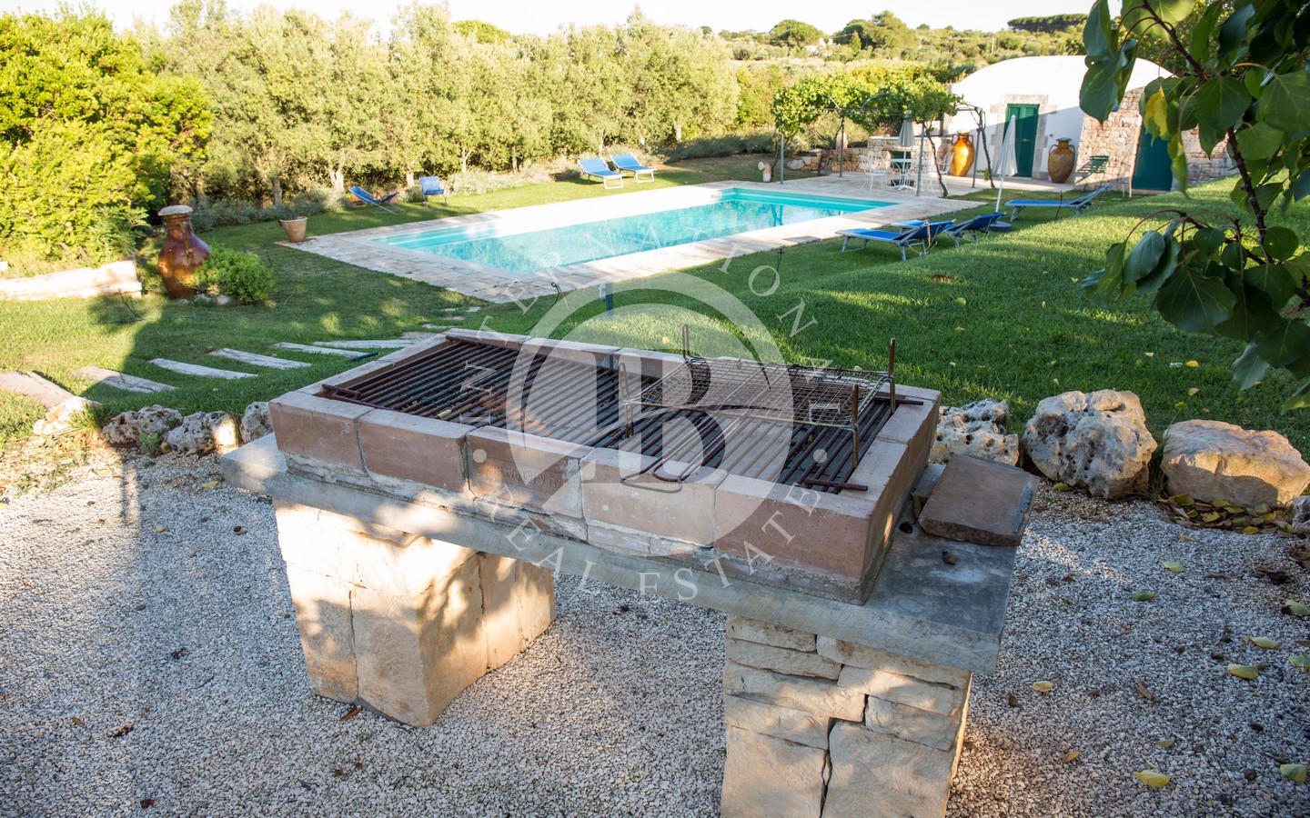 Gli spazi esterni sono progettati per offrire momenti di puro relax: una veranda ombreggiata davanti al trullo, una zona living all’aperto con ombrellone, un’area pranzo protetta da vele, un pergolato di uva fragolina, un gazebo affacciato sulla piscina e una zona barbecue incastonata sotto un albero di albicocco. Completano l’area due docce esterne con acqua calda e fredda e una piscina 10x5 m dotata di sistema di nuoto controcorrente.
