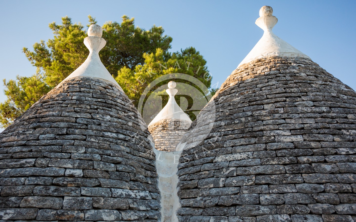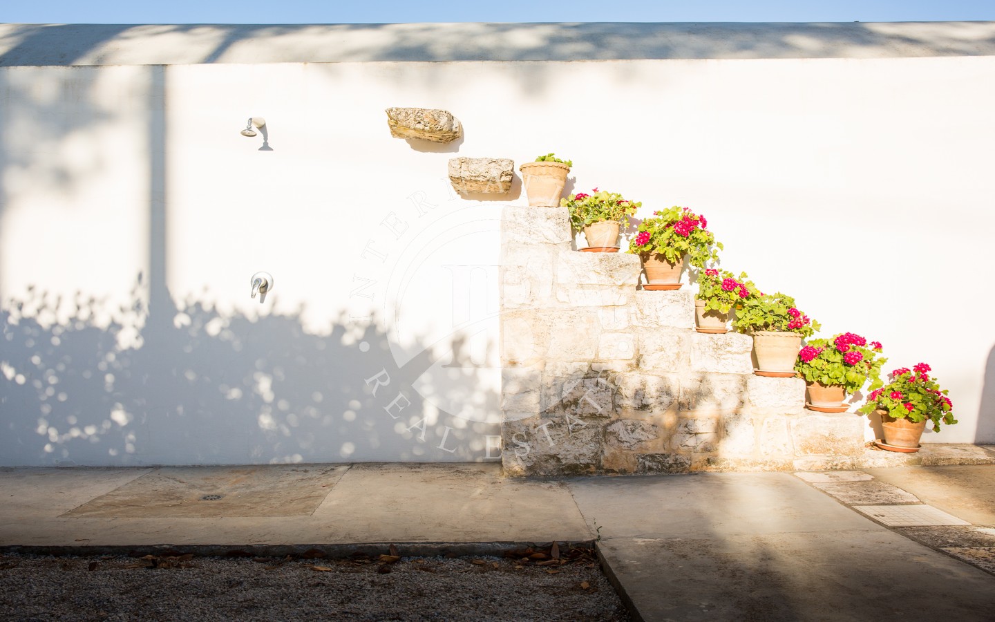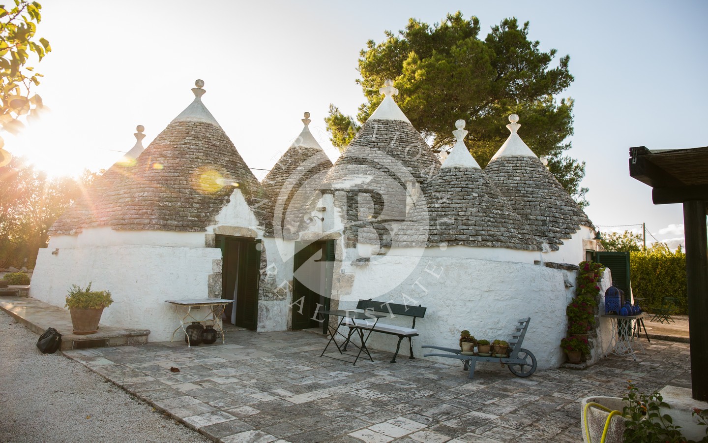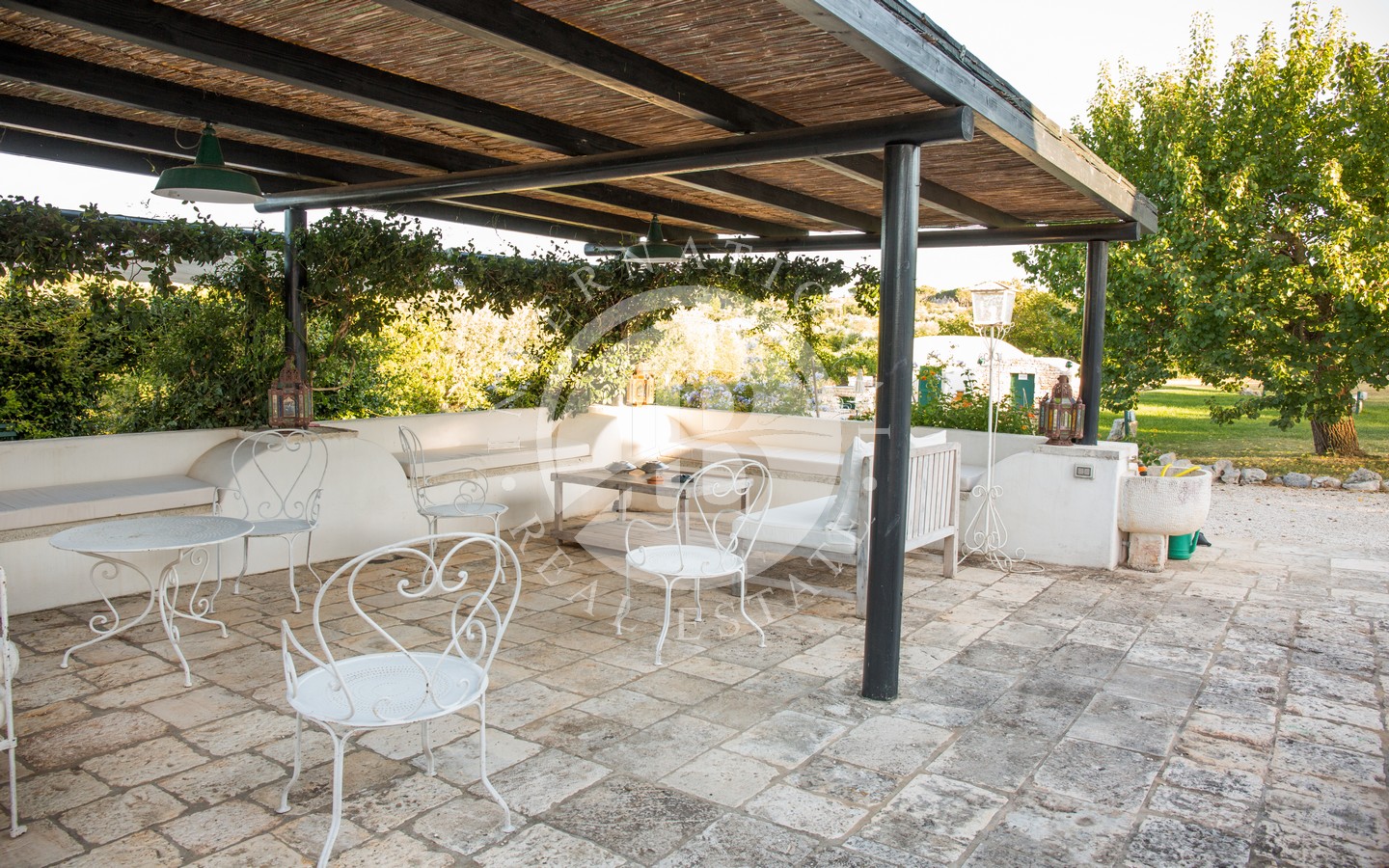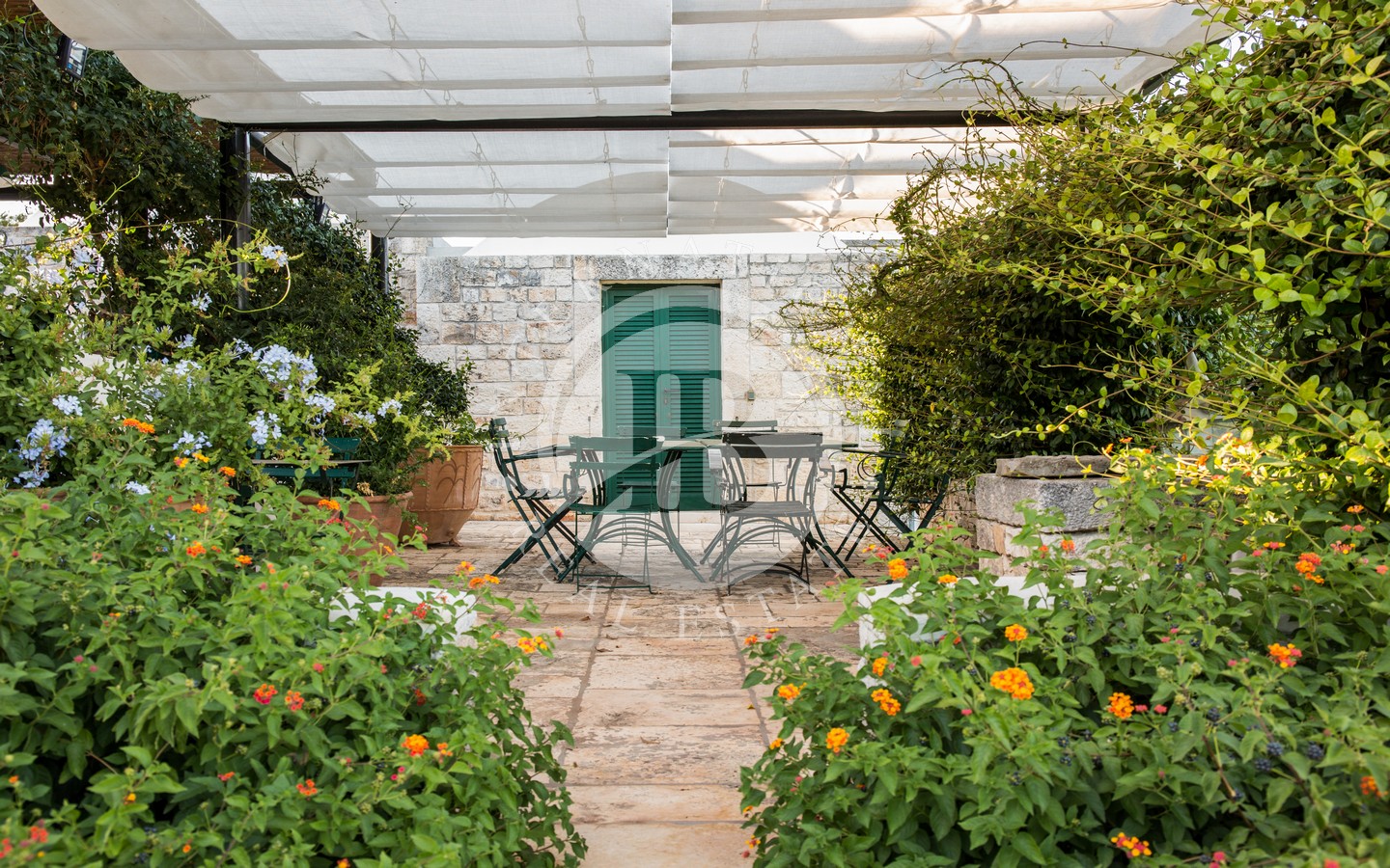 Gli spazi esterni sono progettati per offrire momenti di puro relax: una veranda ombreggiata davanti al trullo, una zona living all’aperto con ombrellone, un’area pranzo protetta da vele, un pergolato di uva fragolina, un gazebo affacciato sulla piscina e una zona barbecue incastonata sotto un albero di albicocco. Completano l’area due docce esterne con acqua calda e fredda e una piscina 10x5 m dotata di sistema di nuoto controcorrente.