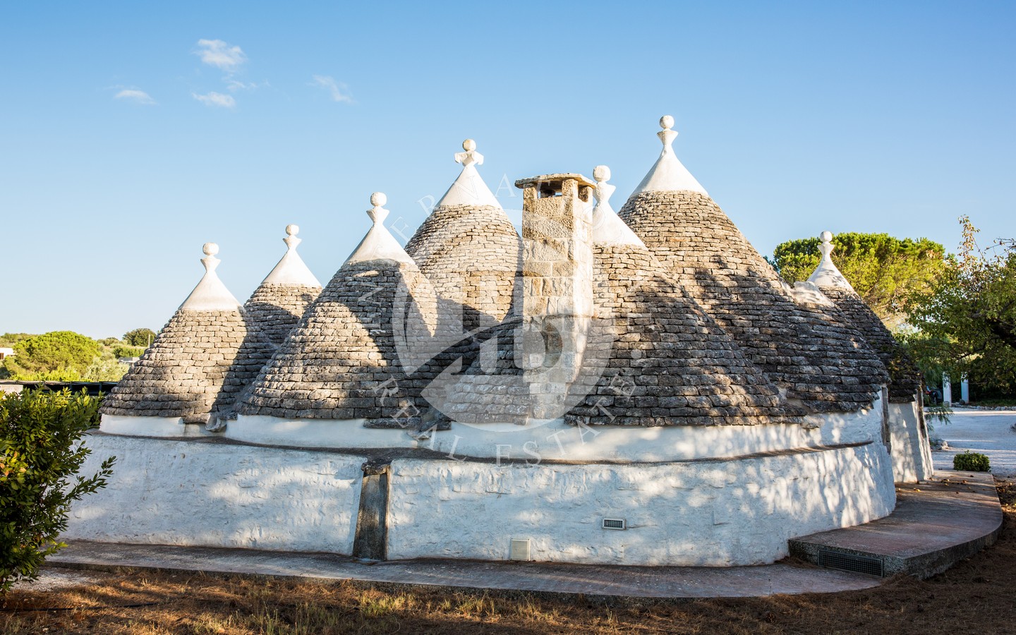 L’abitazione principale, ricavata all’interno di un trullo finemente restaurato, offre un ampio soggiorno con zona pranzo, cucina attrezzata, camera matrimoniale e bagno en suite con vasca. Le lamie adiacenti ospitano tre camere doppie, due bagni – uno con doccia e uno con vasca – una seconda cucina e aria condizionata. A bordo piscina si trovano due ulteriori strutture: una lamia con camera e bagno privato climatizzato, e un deposito utile per il ricovero invernale di attrezzi o arredi da esterno.