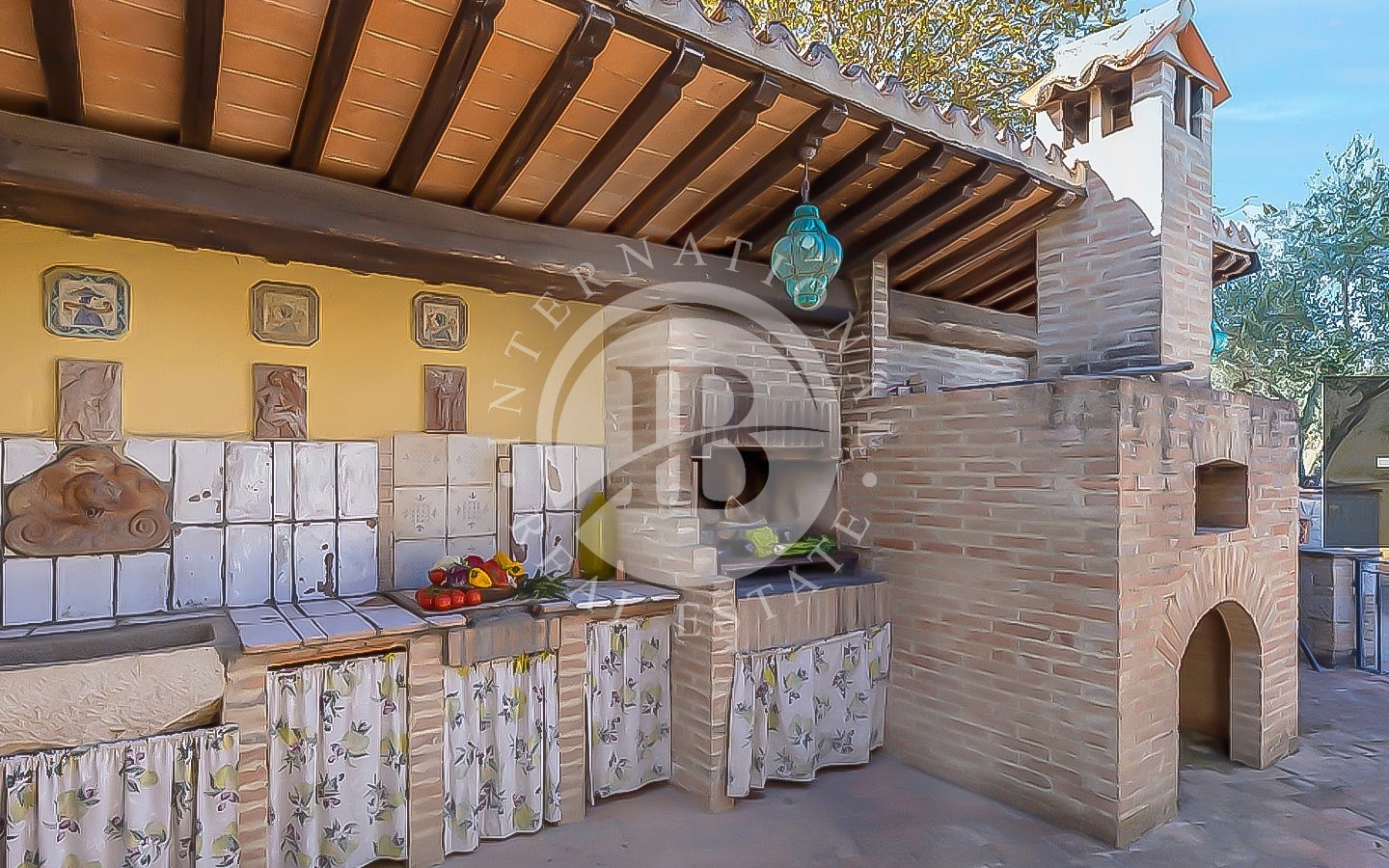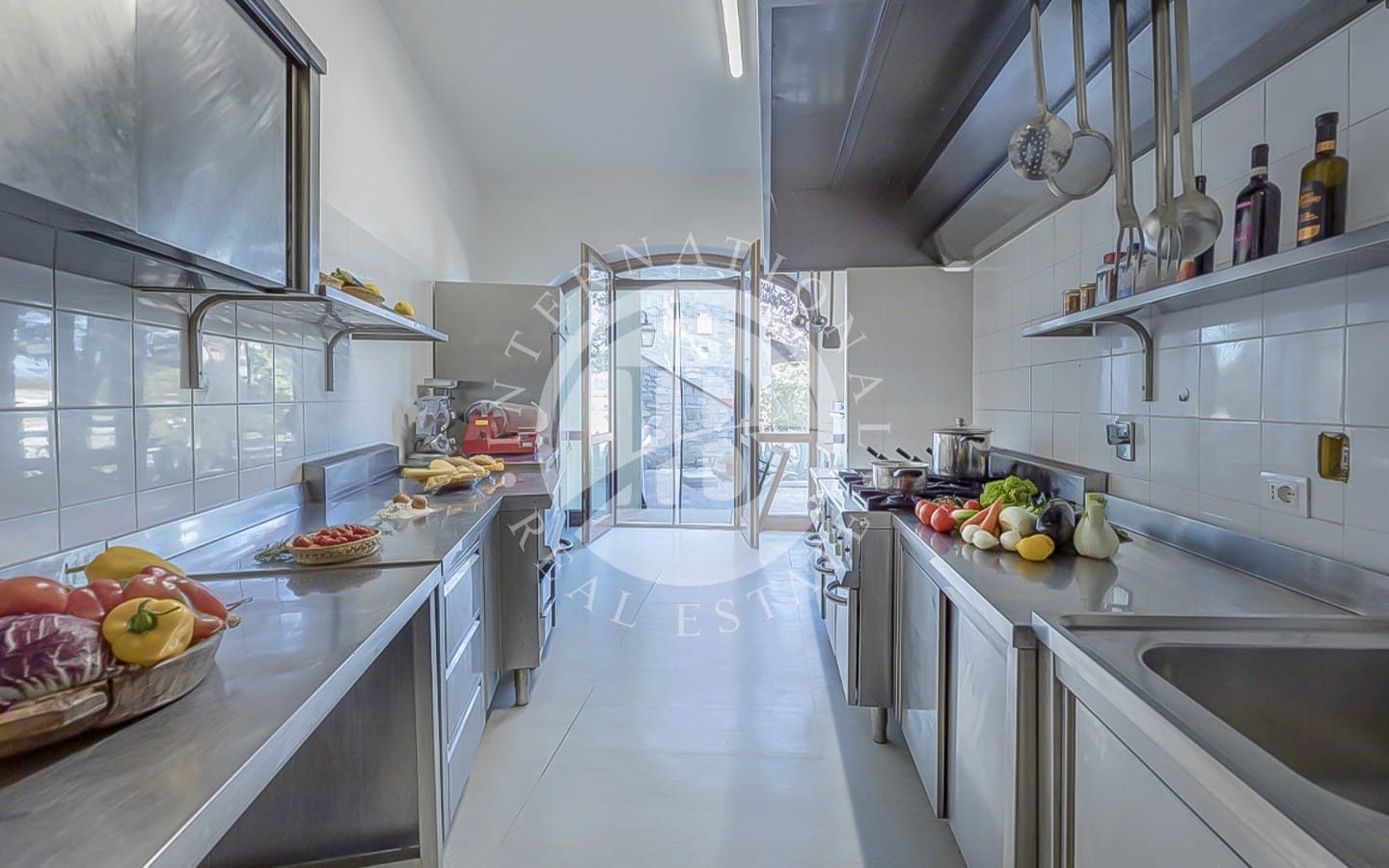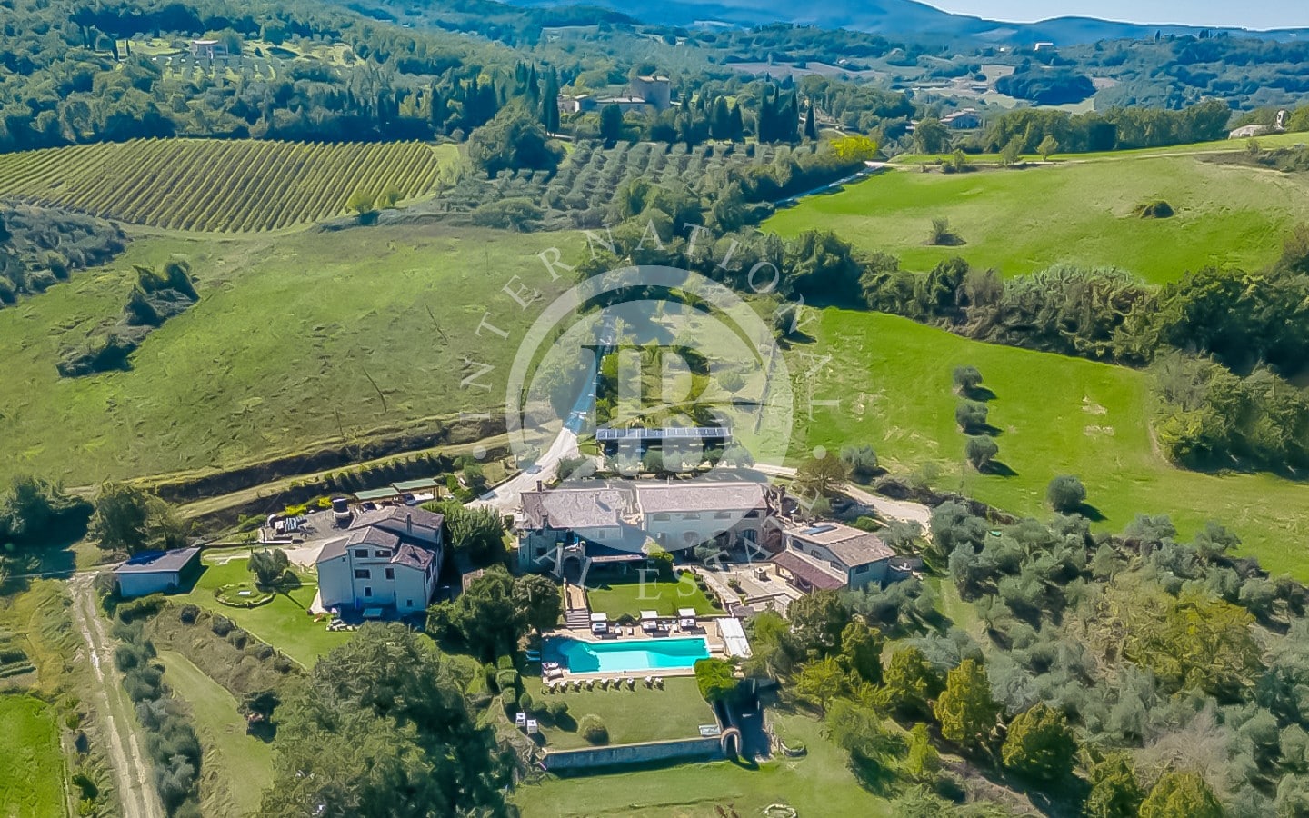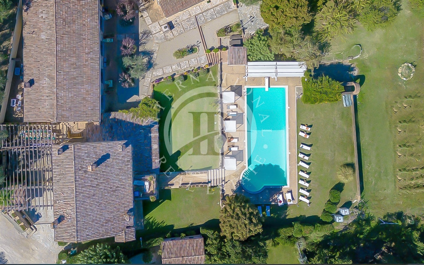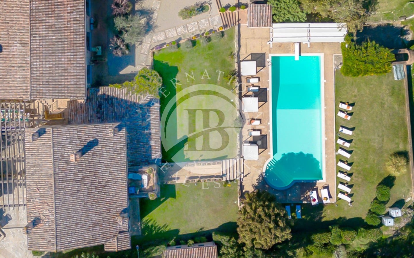 Il terreno circostante si estende per circa 18.000 mq e ospita una grande piscina panoramica di 19 x 9 metri, dotata di trampolino, scala romana e una profondità variabile tra 1,50 e 3,00 metri.