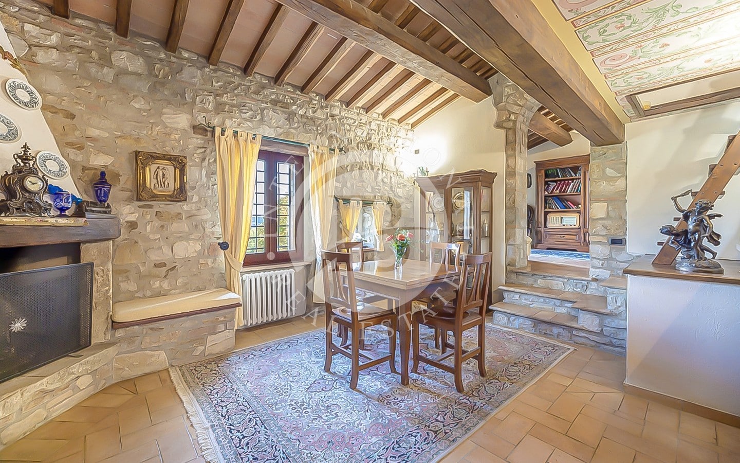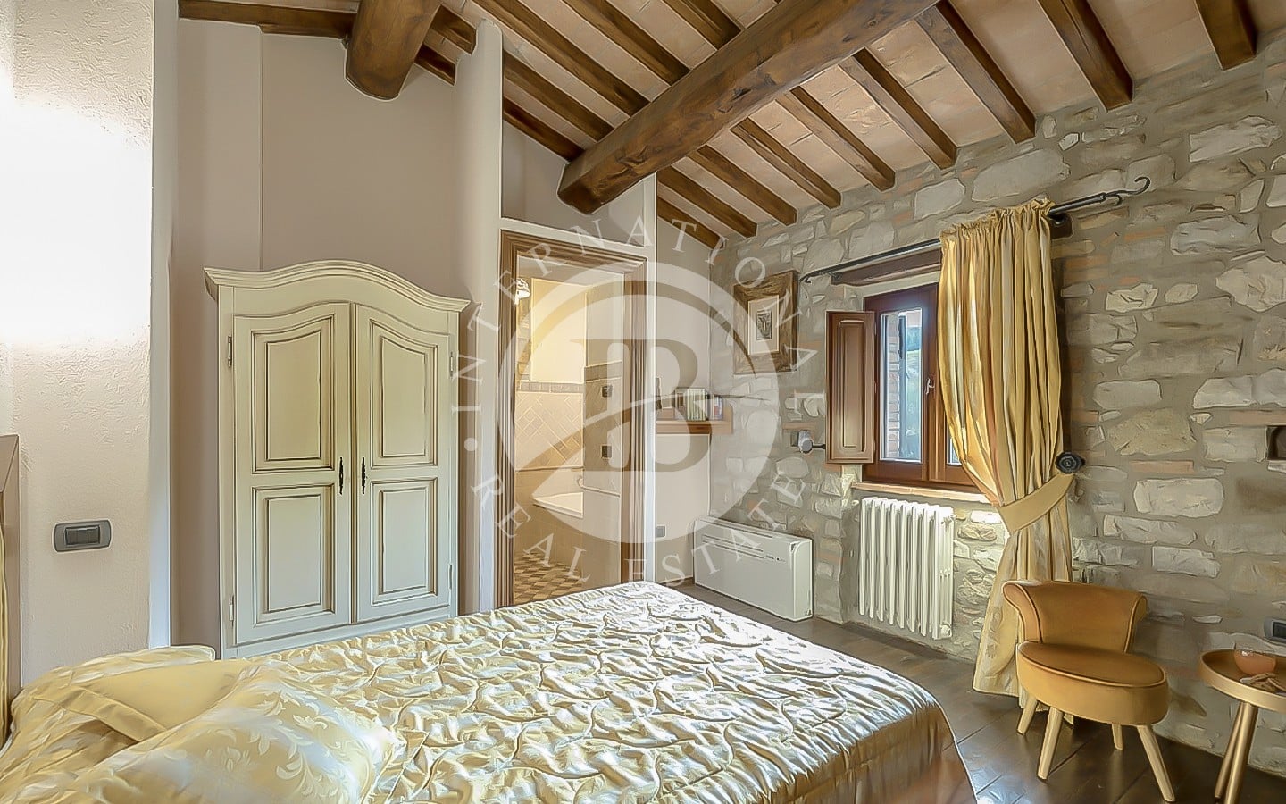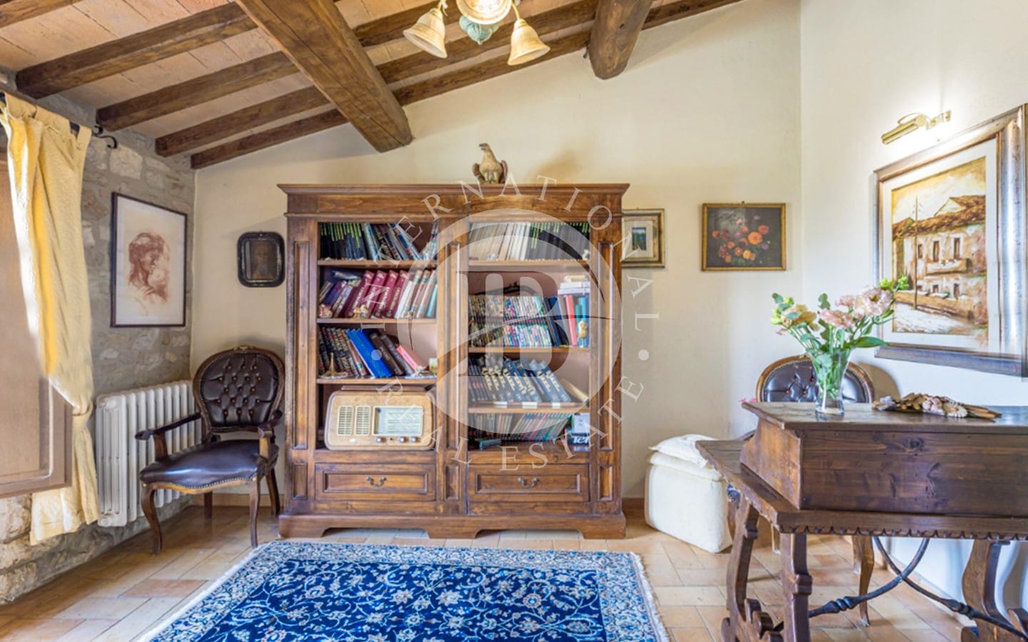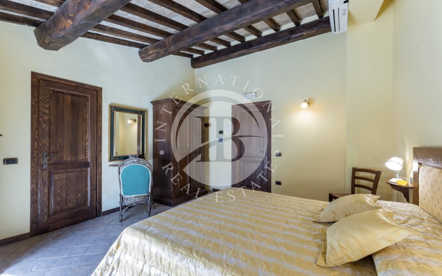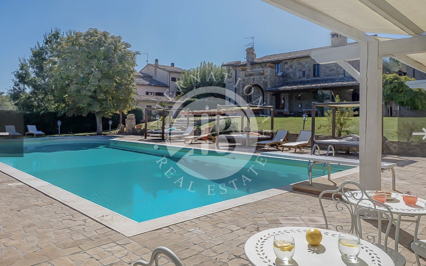 Il casale principale è stato completamente ristrutturato con materiali tipici umbri, tra cui pavimenti in cotto antico, travi in legno e coppi in terracotta. Si sviluppa su due livelli: al piano terra si trovano una cucina, una sala da pranzo, uno studio, un soggiorno e un bagno. Il primo piano ospita tre camere da letto, tre bagni, un ampio soggiorno con soppalco e un balcone panoramico.