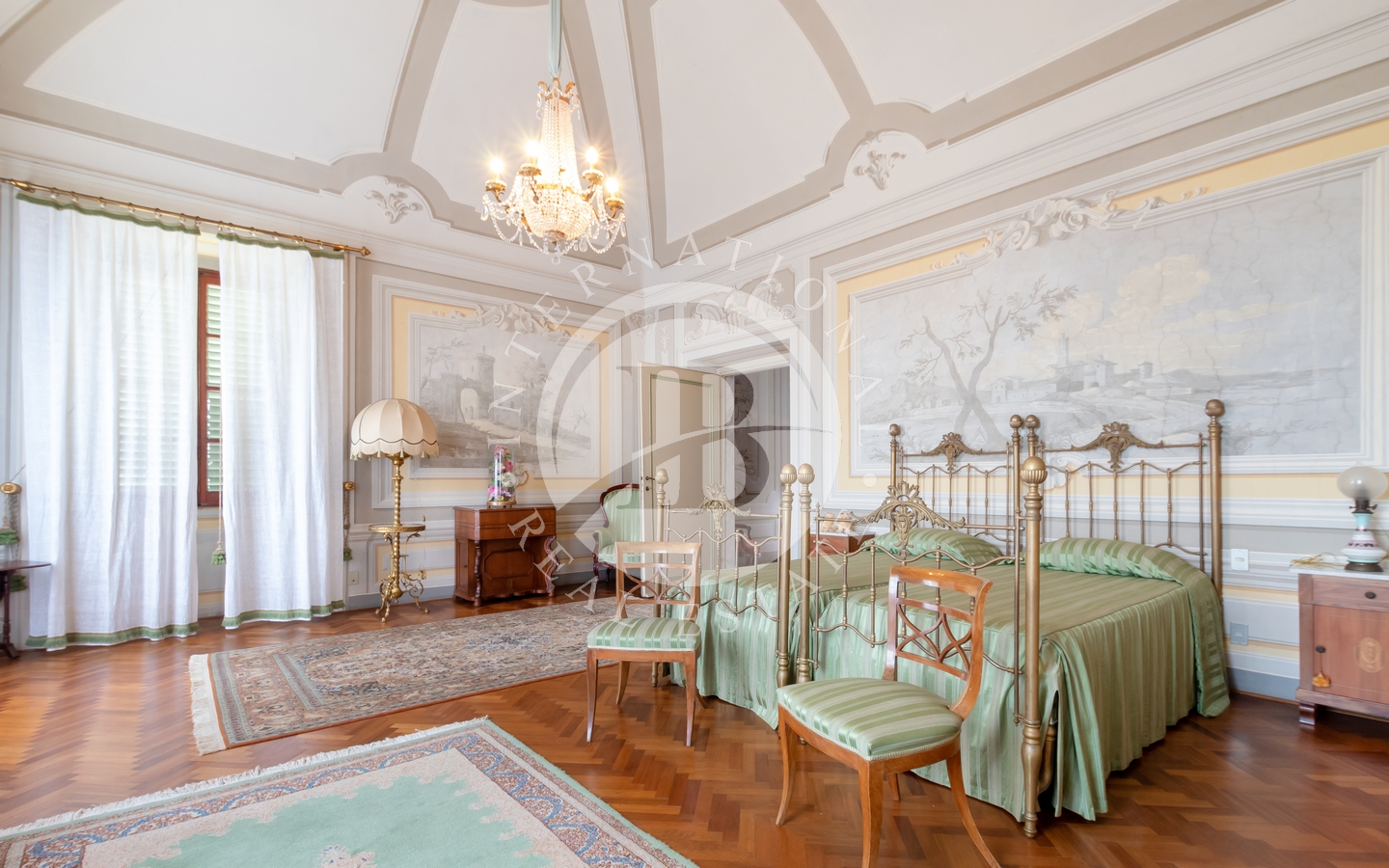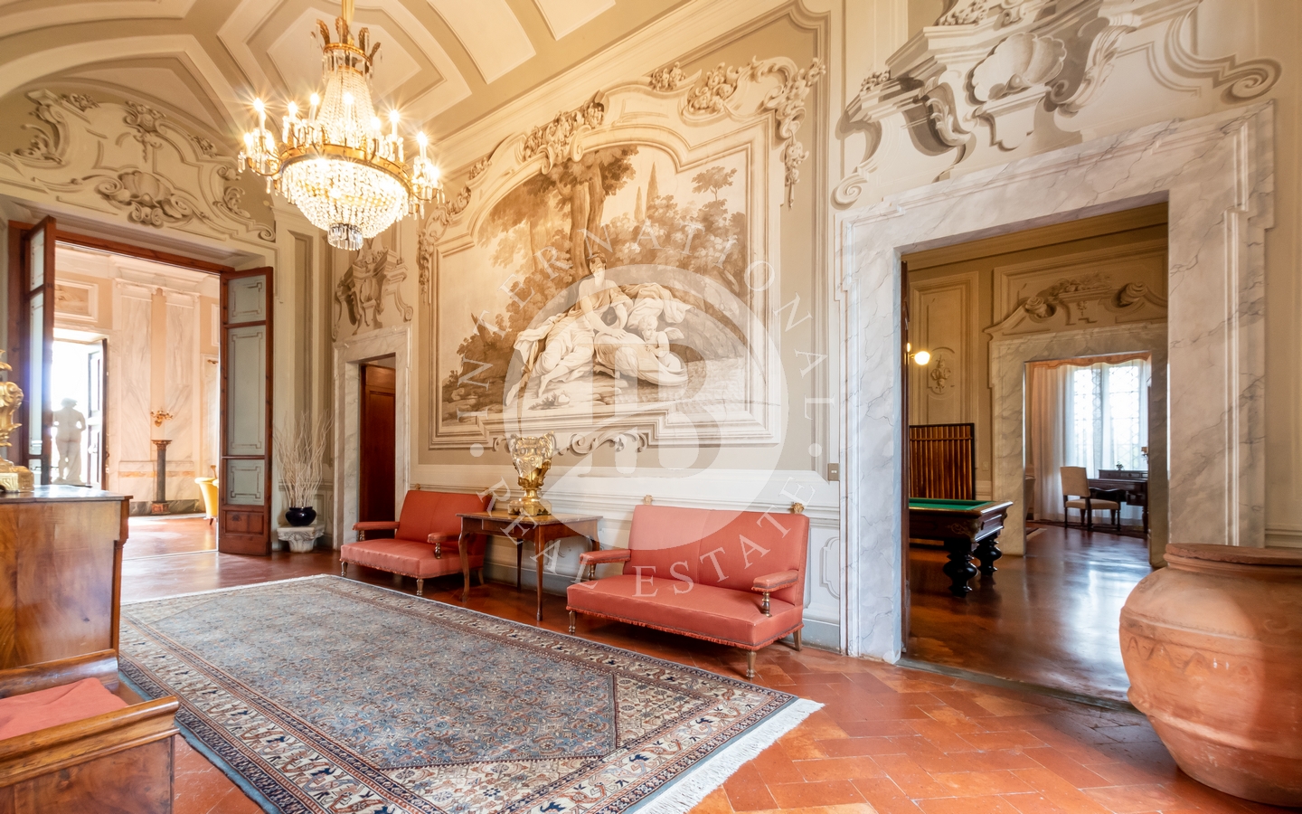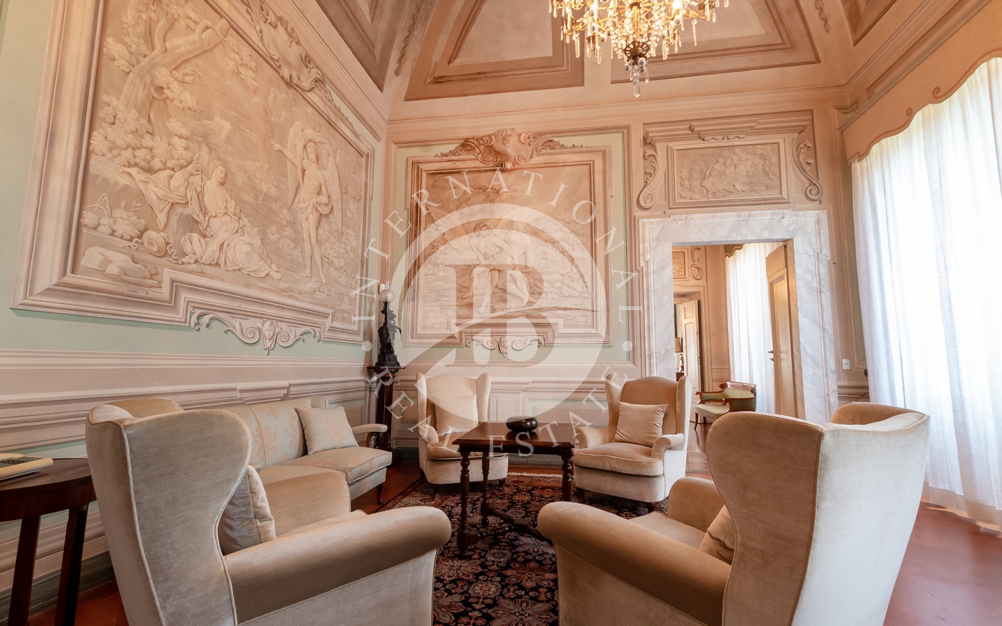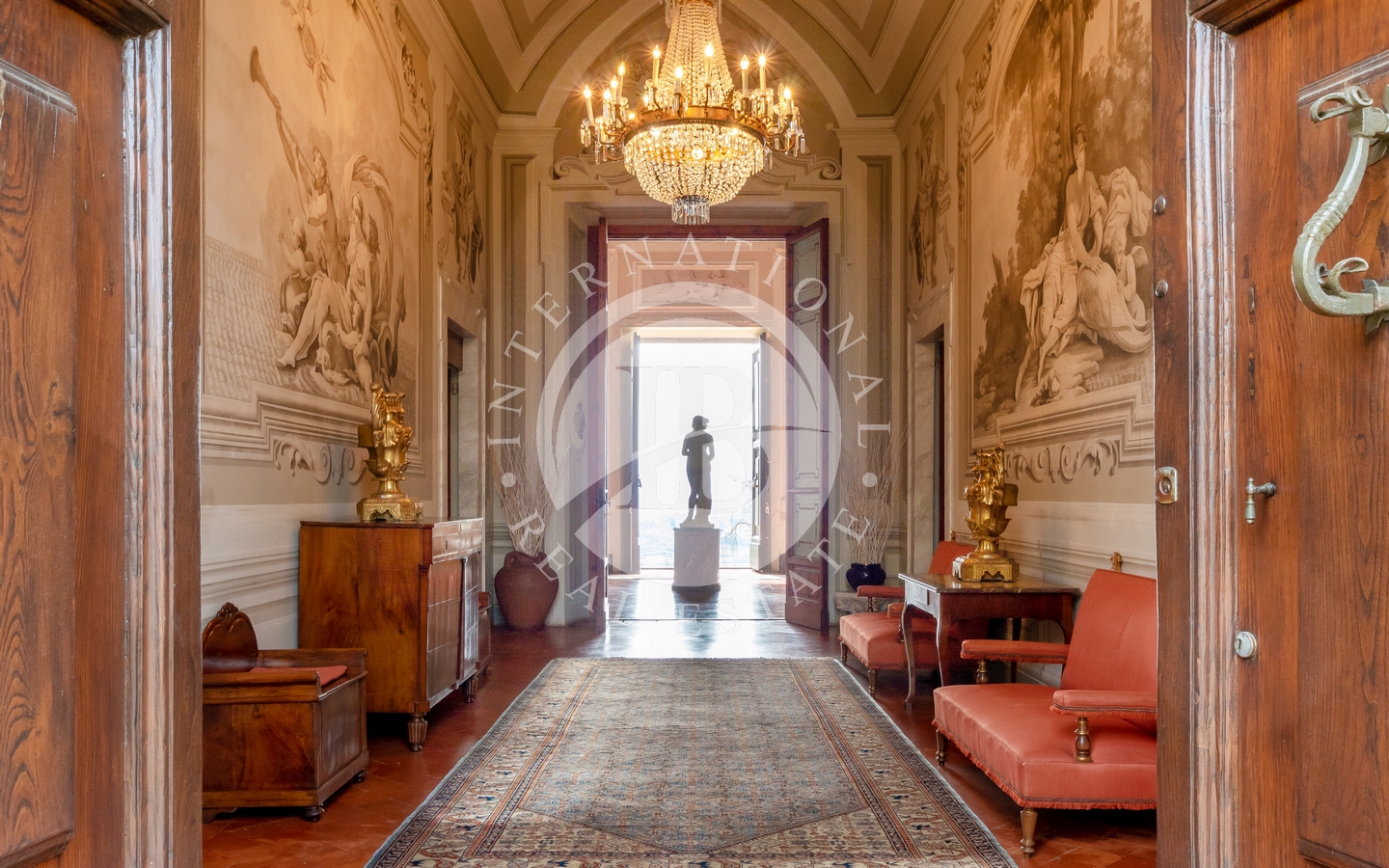 All'interno, la villa svela la sua magnificenza con affreschi originali che narrano scene mitologiche e architettoniche raffinate.